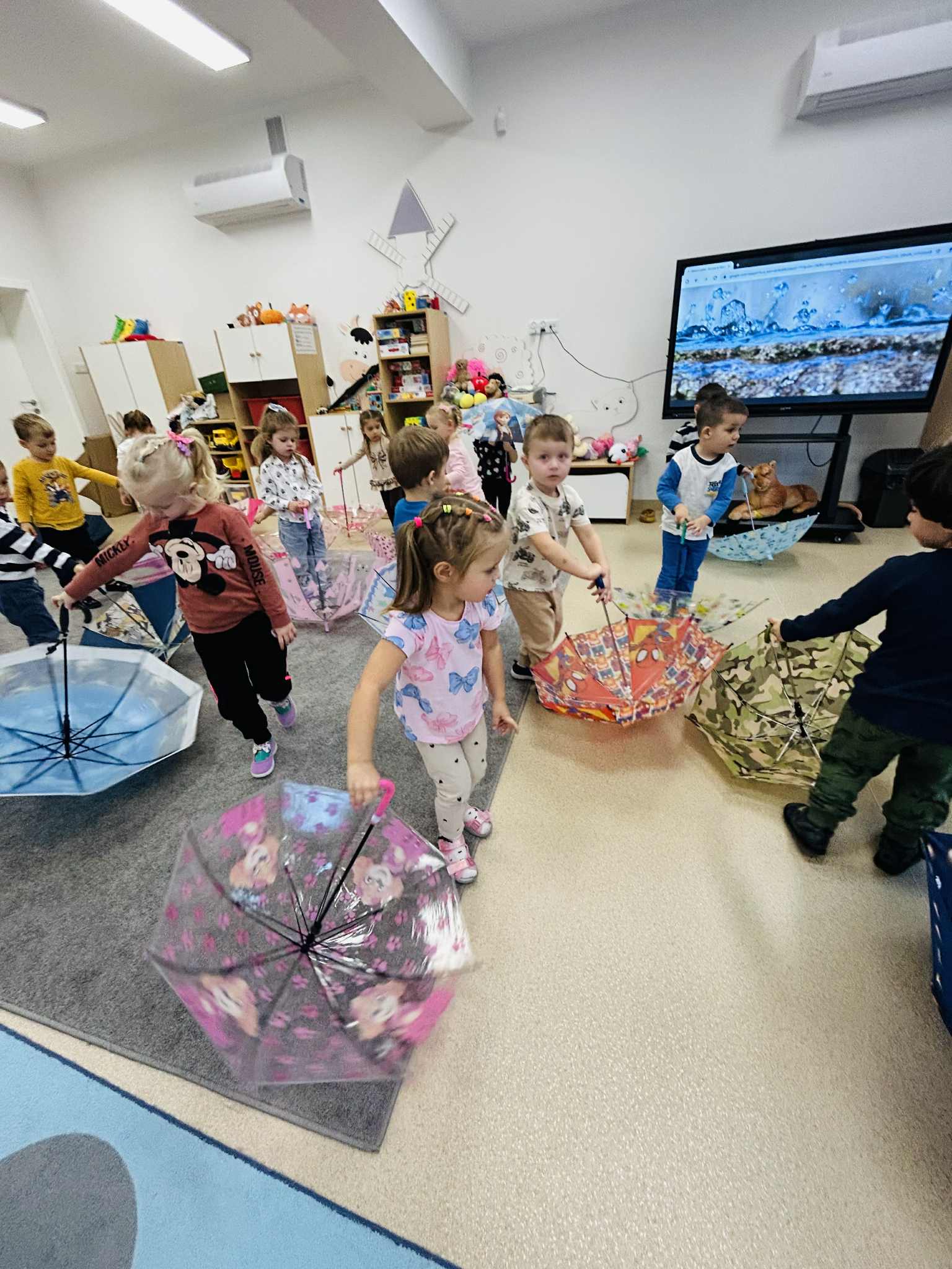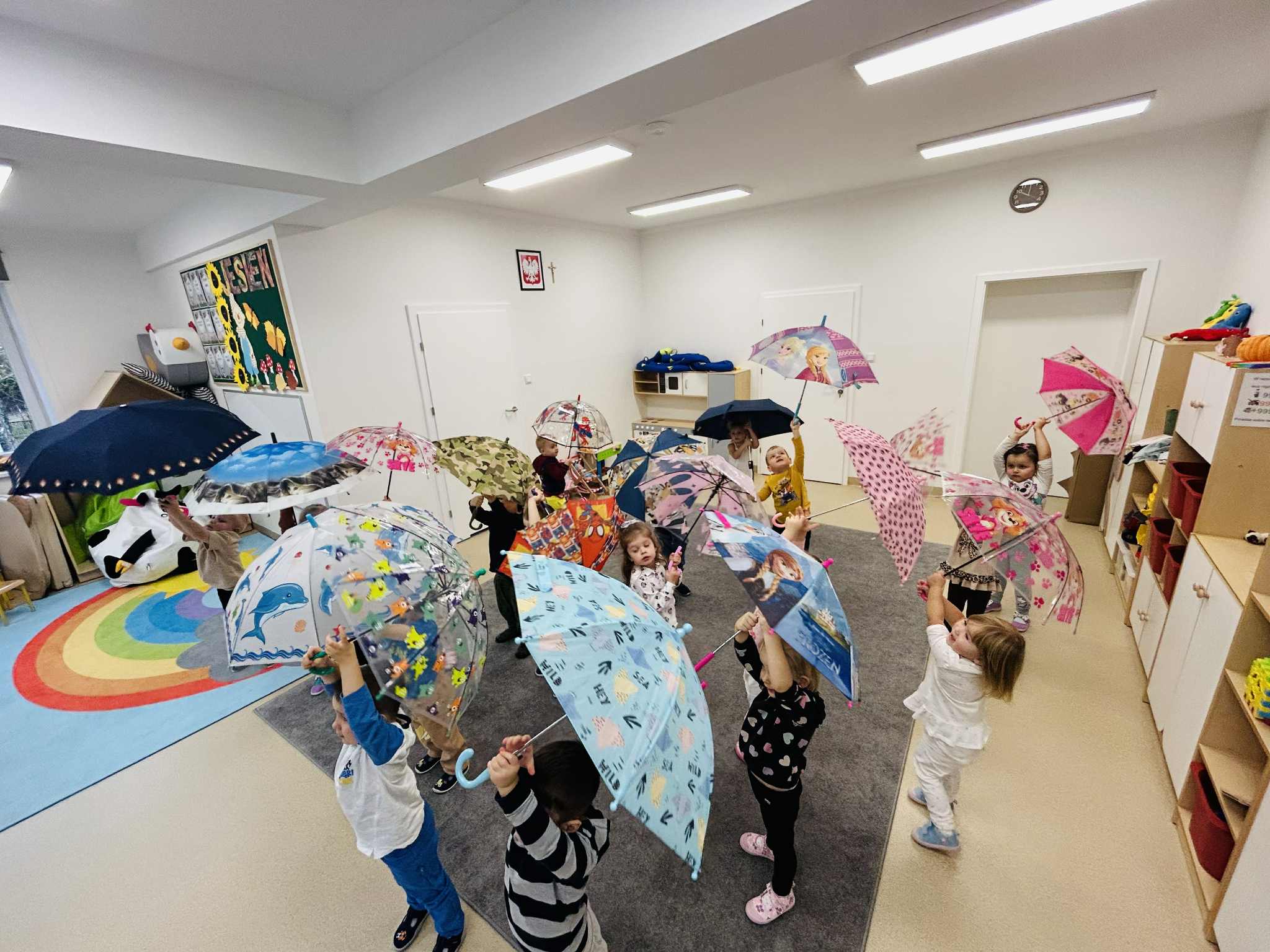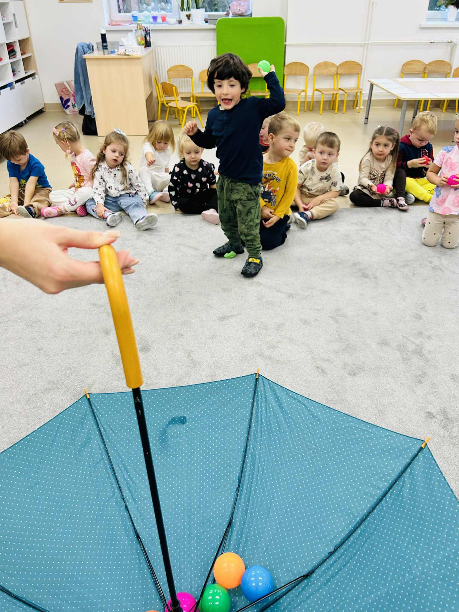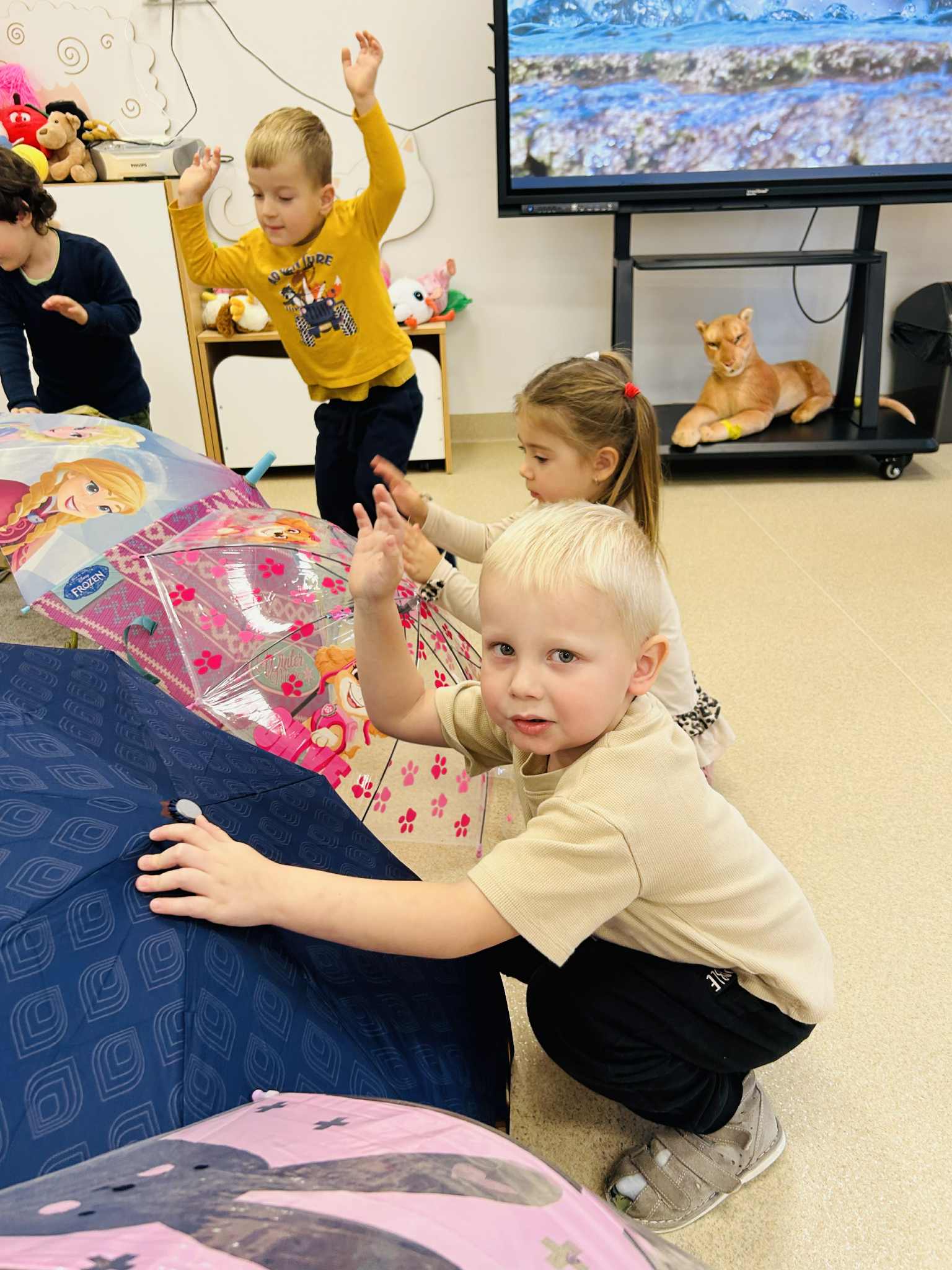 Przedszkolne misie uczestniczyły w zajęciach muzyczno-doświadczalnych z wykorzystaniem parasolek. Dzieci wspólnie wystukiwały rytmy na parasolkach oraz obserwowały barwne zjawisko „kolorowego deszczu”, rozwijając wrażliwość muzyczną i ciekawość świata.