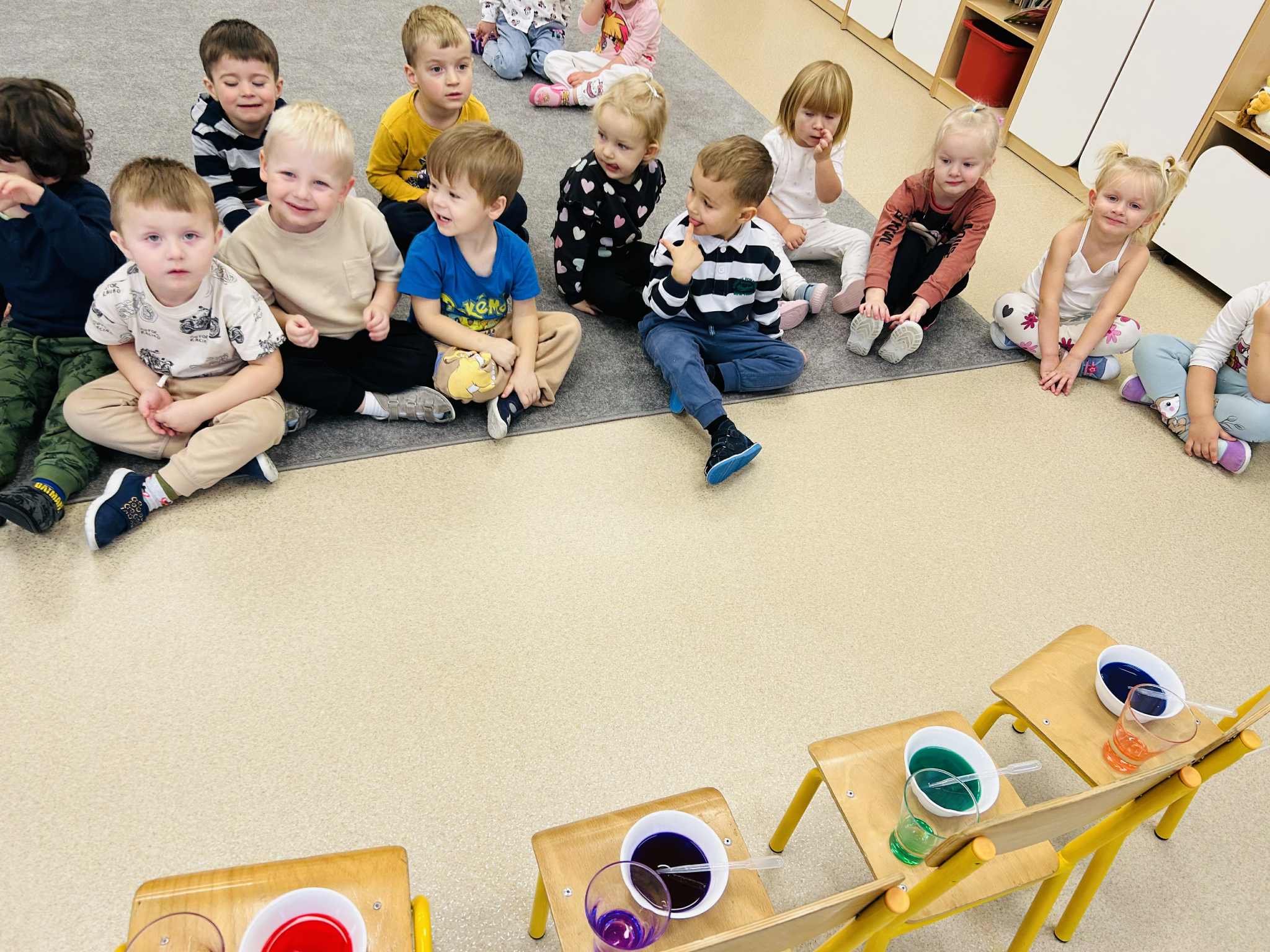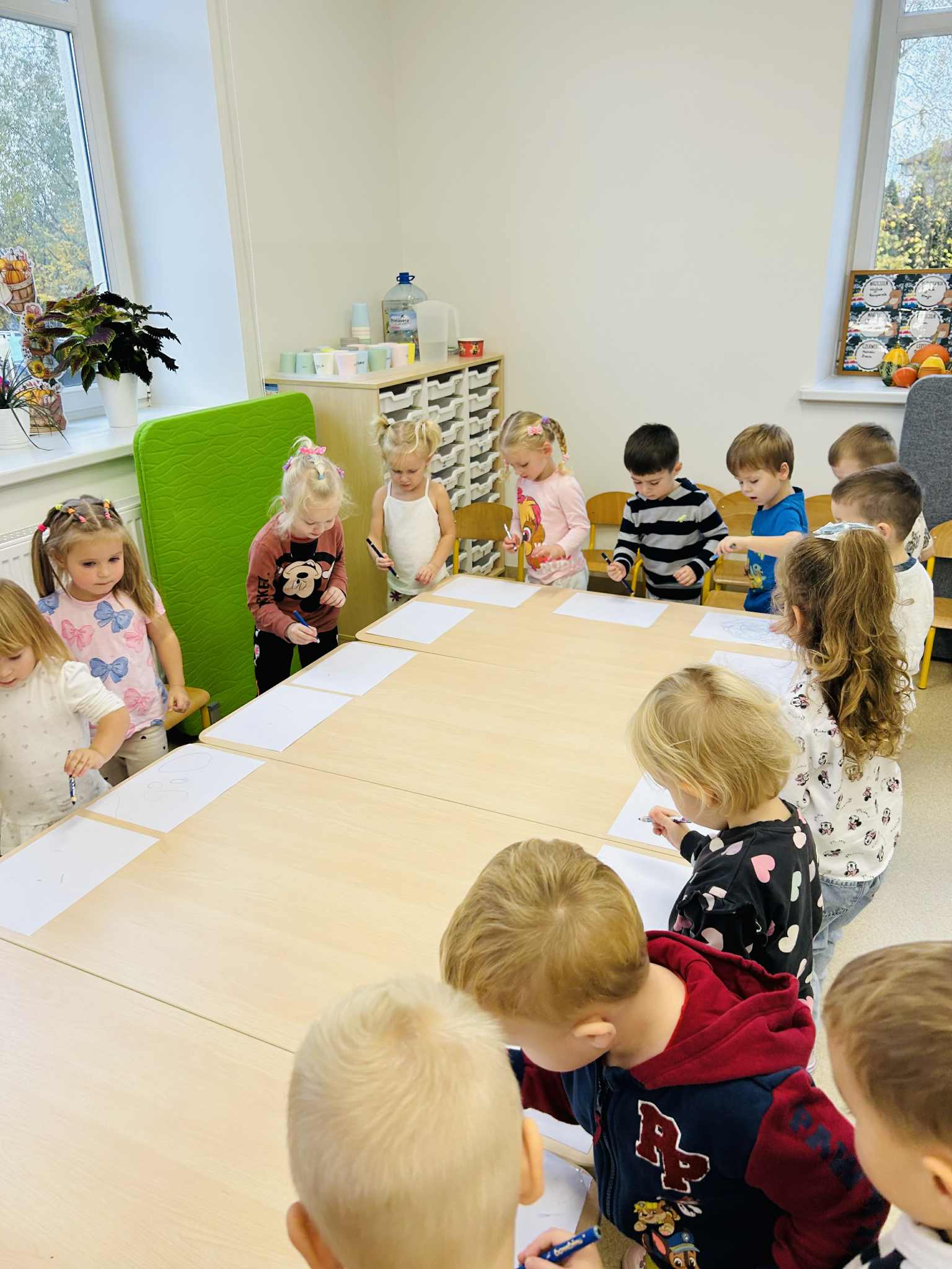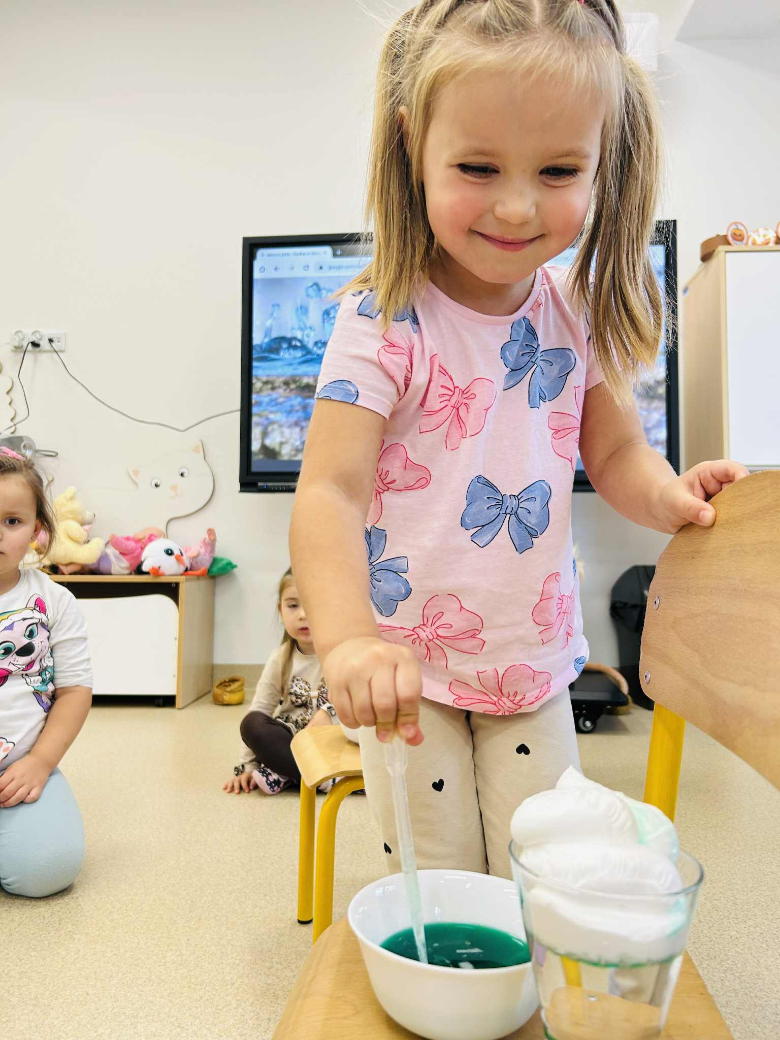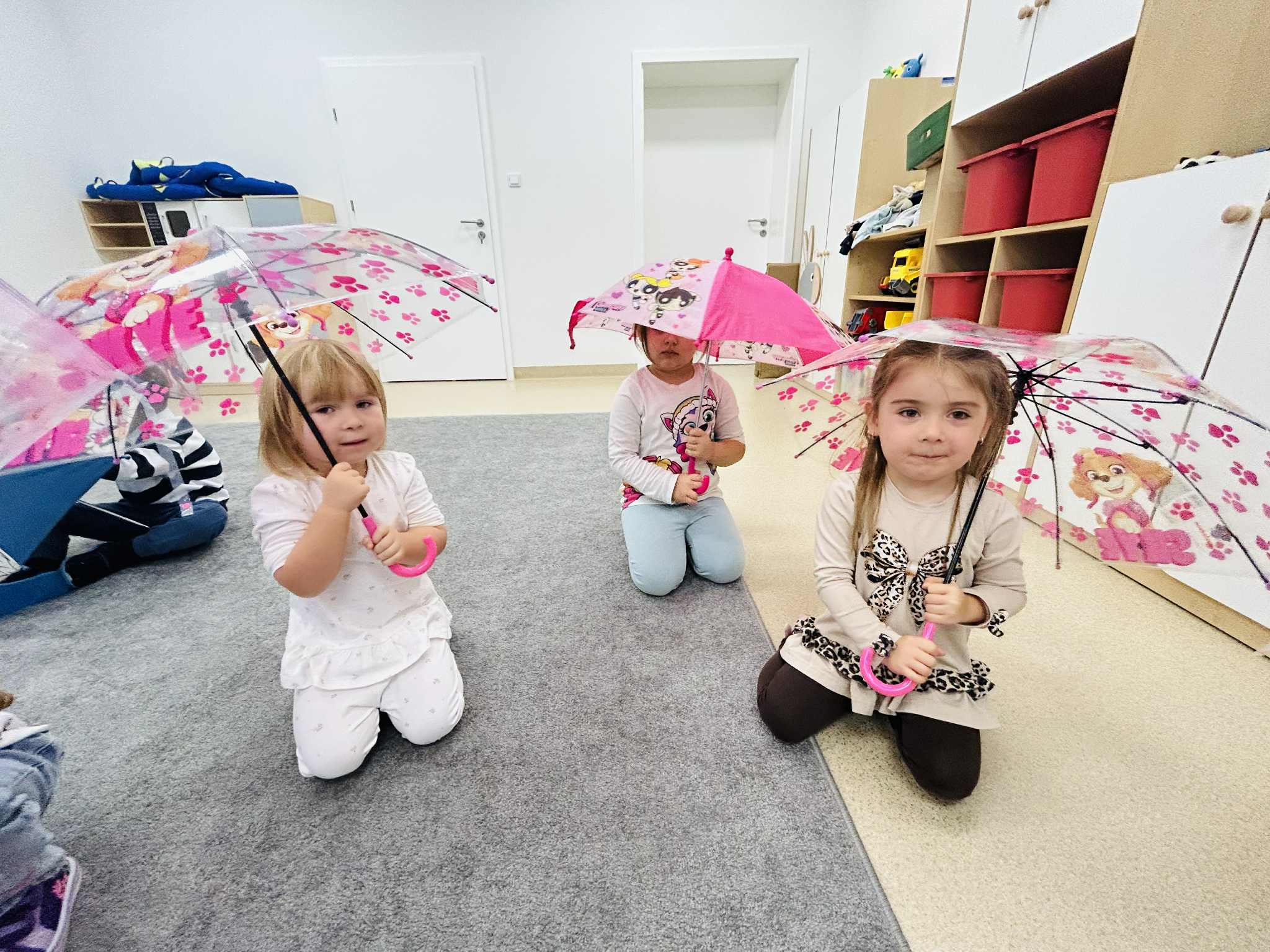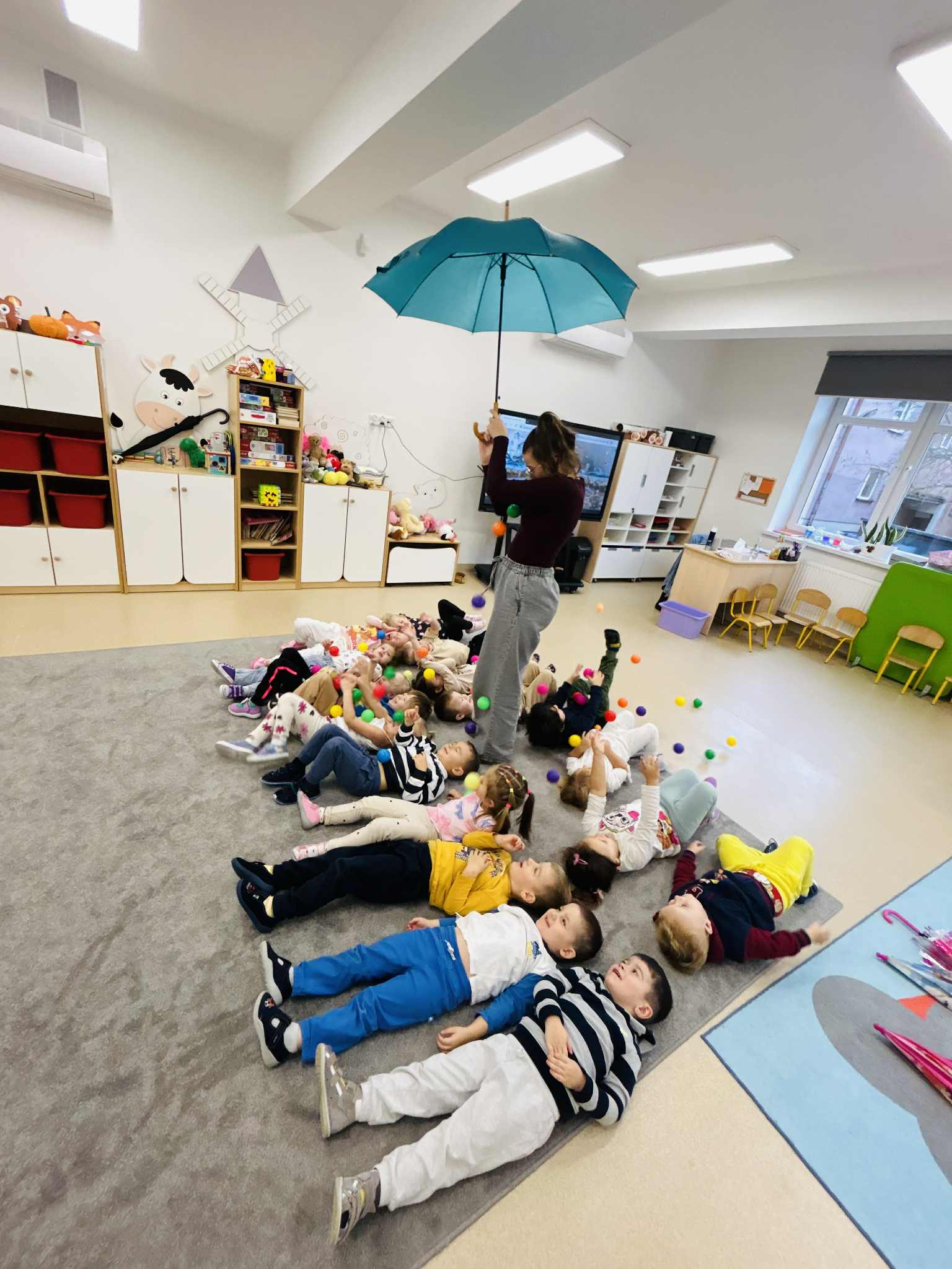 Przedszkolne misie uczestniczyły w zajęciach muzyczno-doświadczalnych z wykorzystaniem parasolek. Dzieci wspólnie wystukiwały rytmy na parasolkach oraz obserwowały barwne zjawisko „kolorowego deszczu”, rozwijając wrażliwość muzyczną i ciekawość świata.