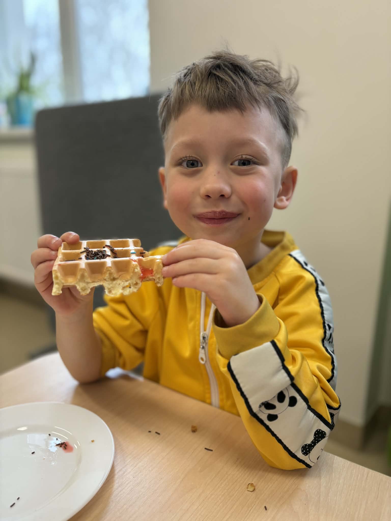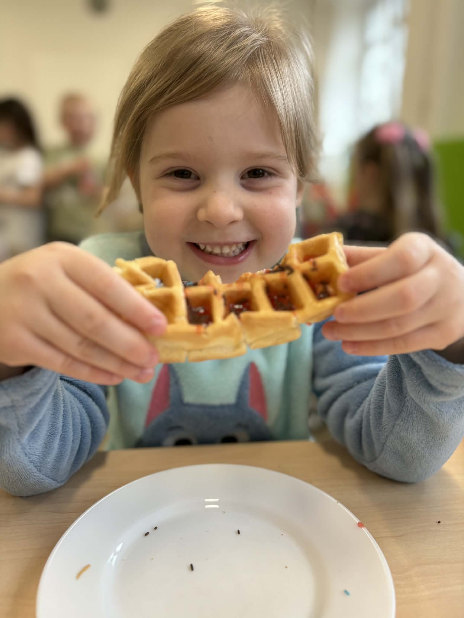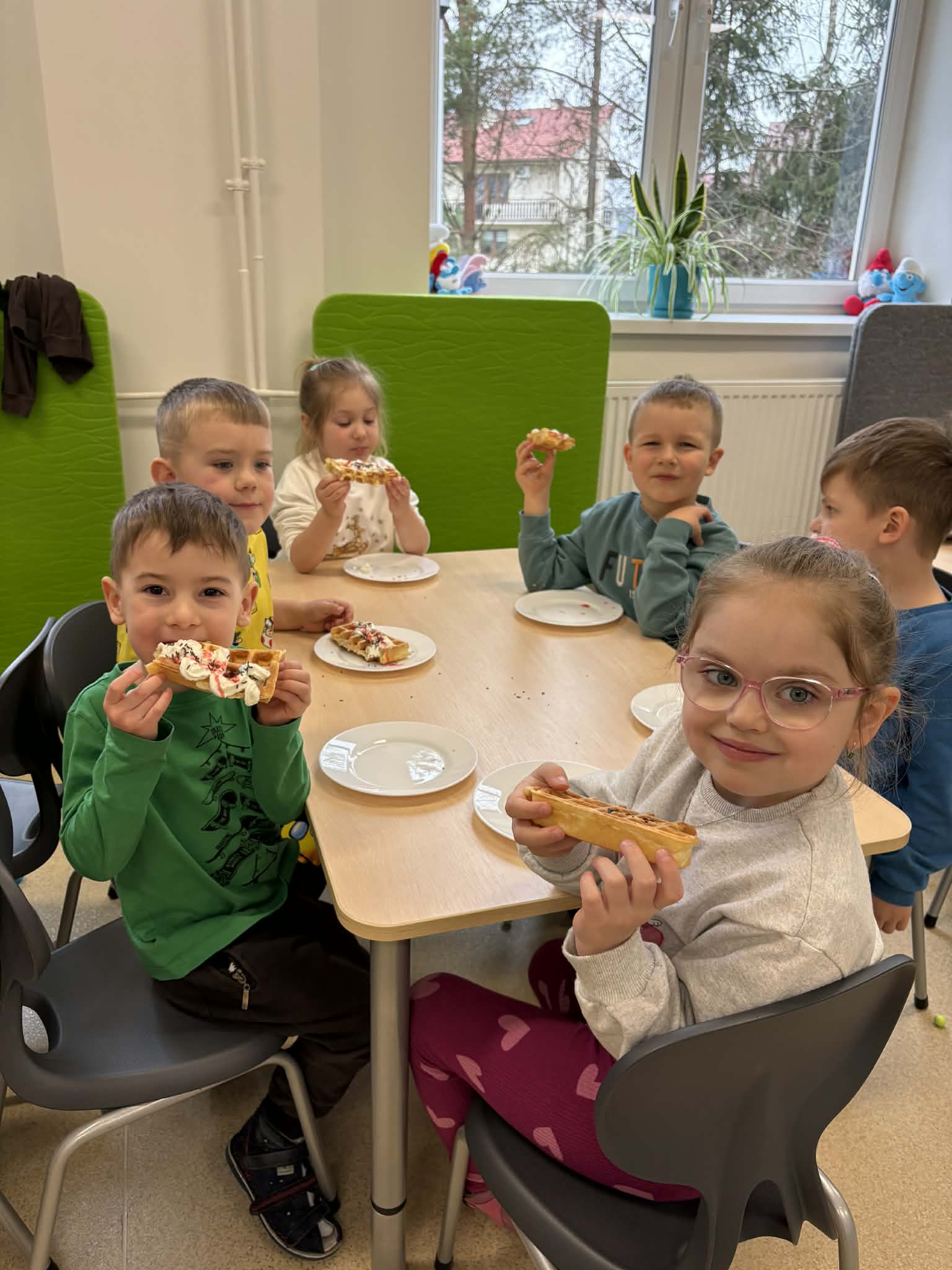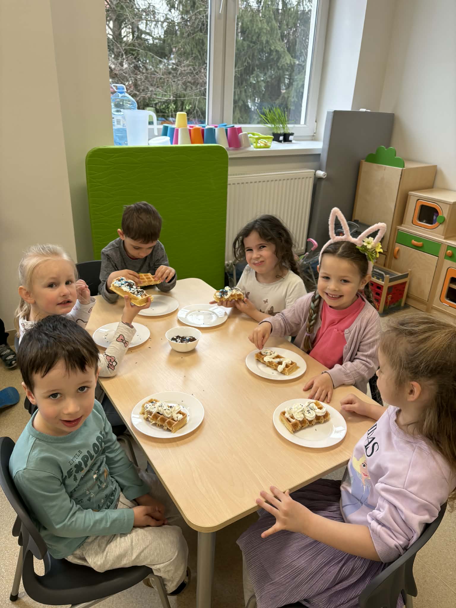 W naszej grupie odbył się wyjątkowo słodki i radosny Dzień Gofra! Tego dnia dzieci miały okazję poznać proces przygotowywania gofrów – od składników aż po gotowy, pachnący wypiek. Podczas zajęć rozmawialiśmy o tym, z czego powstają gofry oraz jakie dodatki można do nich wybrać. Dzieci z dużym zaangażowaniem uczestniczyły w przygotowaniach, a największą radość sprawiło im dekorowanie własnych gofrów. Dzień Gofra na długo pozostanie w naszej pamięci jako pełen smaku i dobrej zabawy!