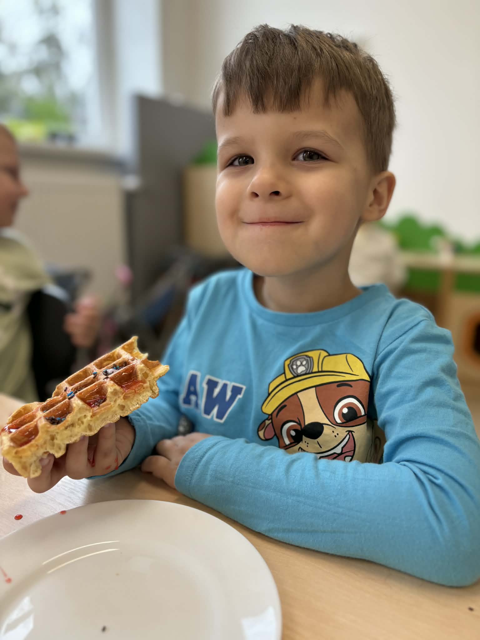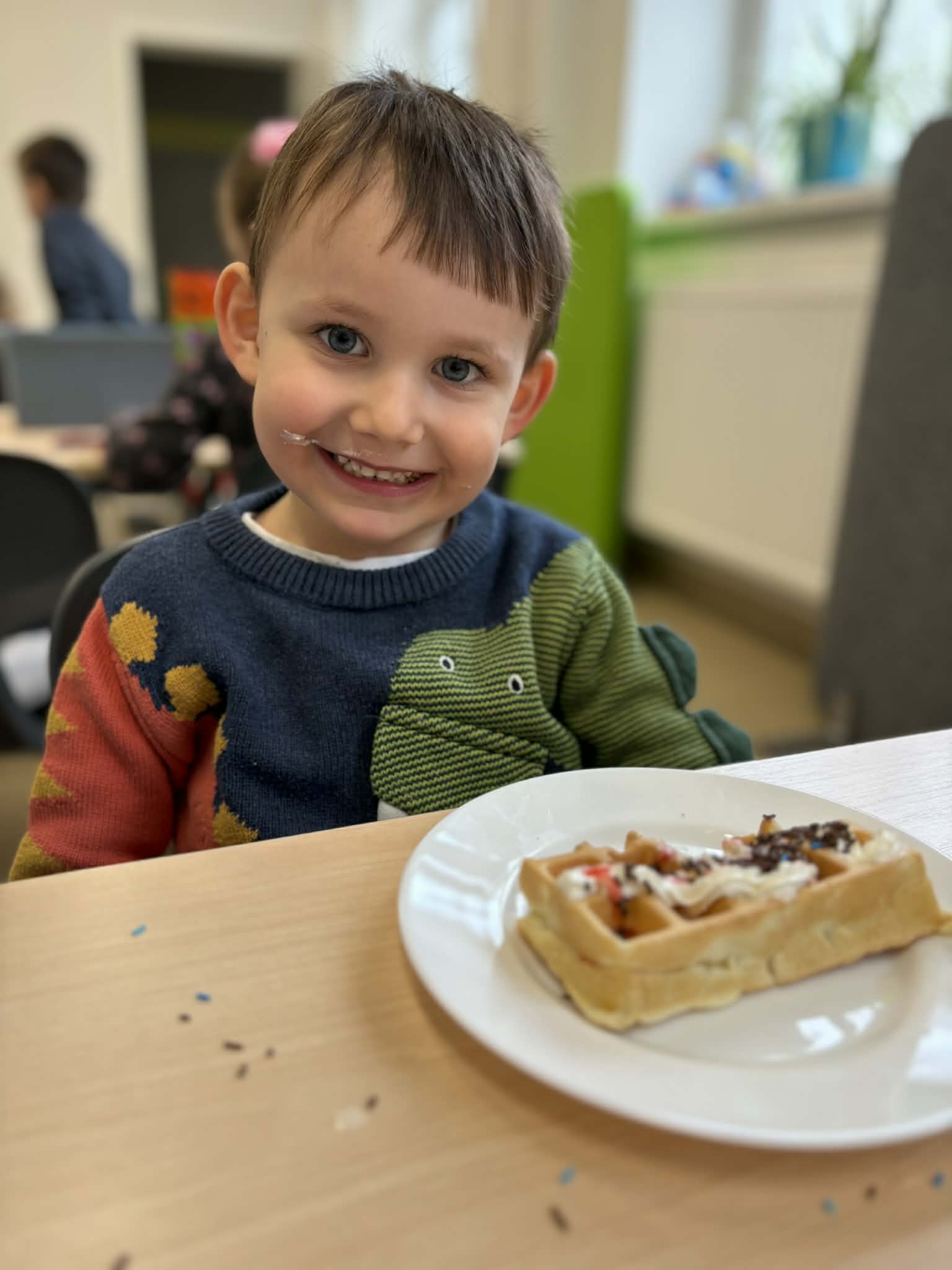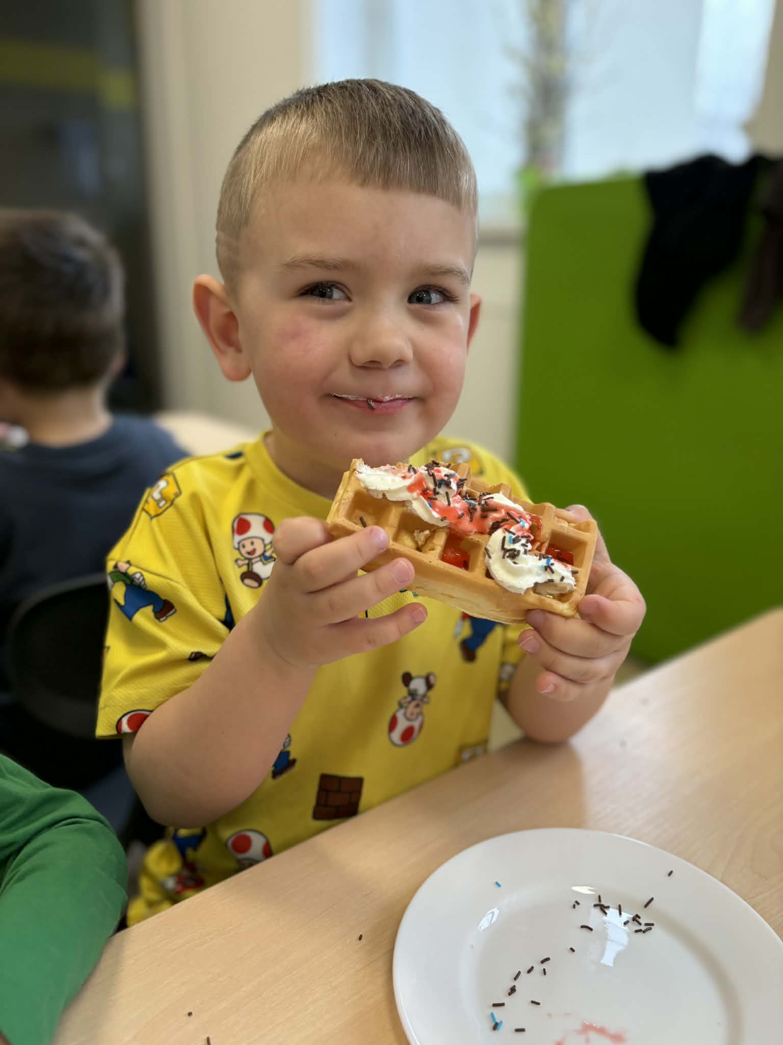 W naszej grupie odbył się wyjątkowo słodki i radosny Dzień Gofra! Tego dnia dzieci miały okazję poznać proces przygotowywania gofrów – od składników aż po gotowy, pachnący wypiek. Podczas zajęć rozmawialiśmy o tym, z czego powstają gofry oraz jakie dodatki można do nich wybrać. Dzieci z dużym zaangażowaniem uczestniczyły w przygotowaniach, a największą radość sprawiło im dekorowanie własnych gofrów. Dzień Gofra na długo pozostanie w naszej pamięci jako pełen smaku i dobrej zabawy!