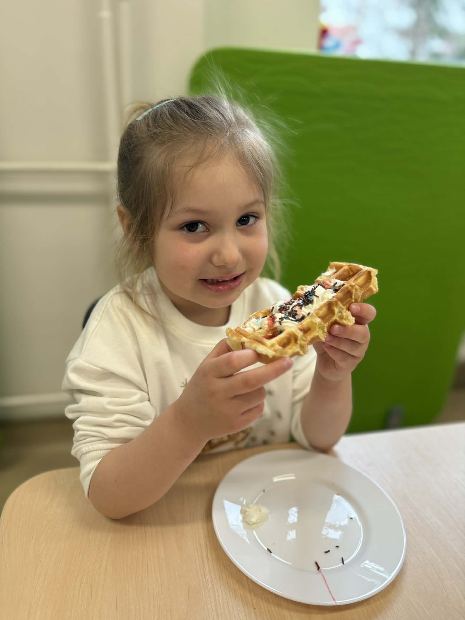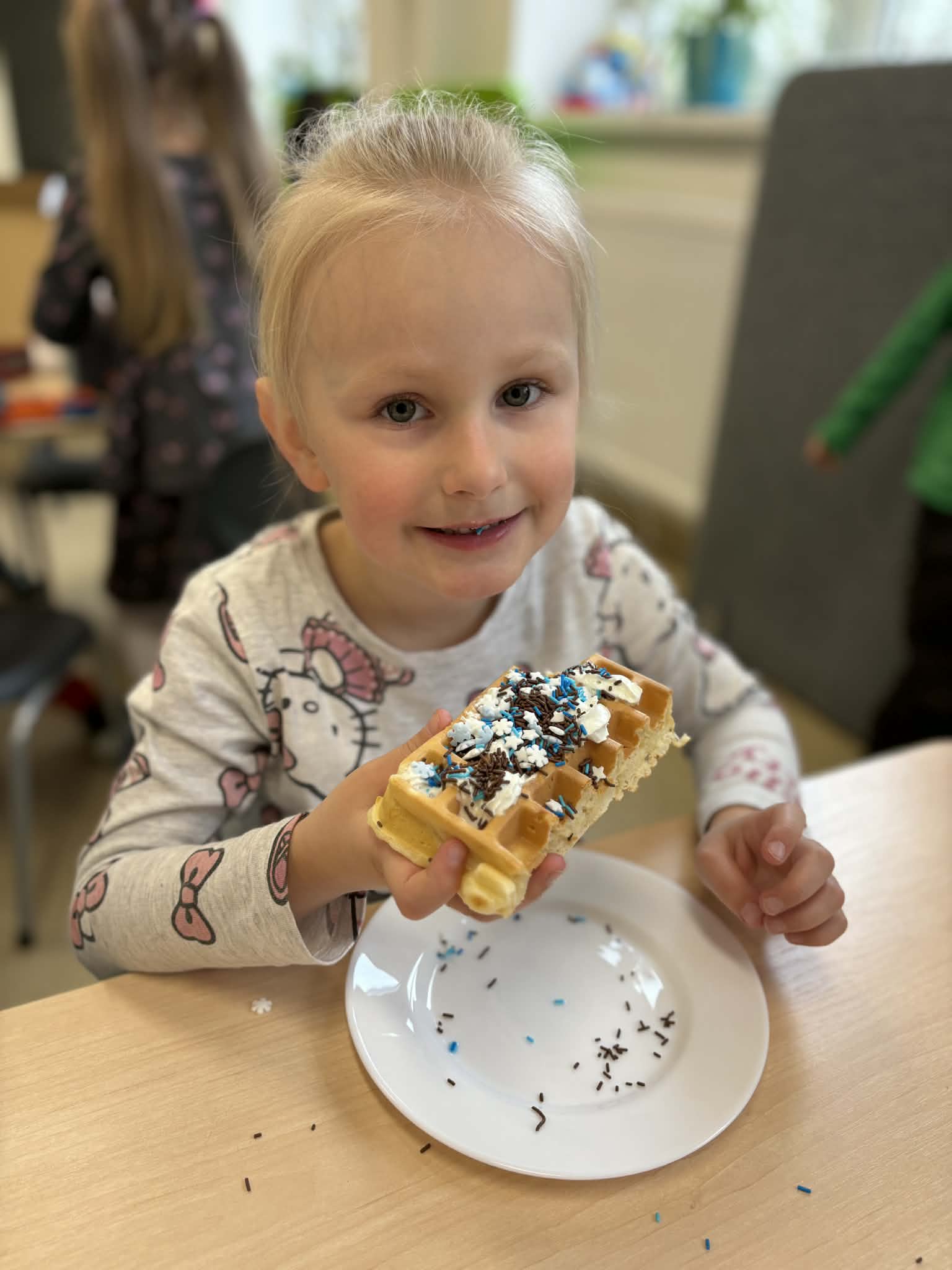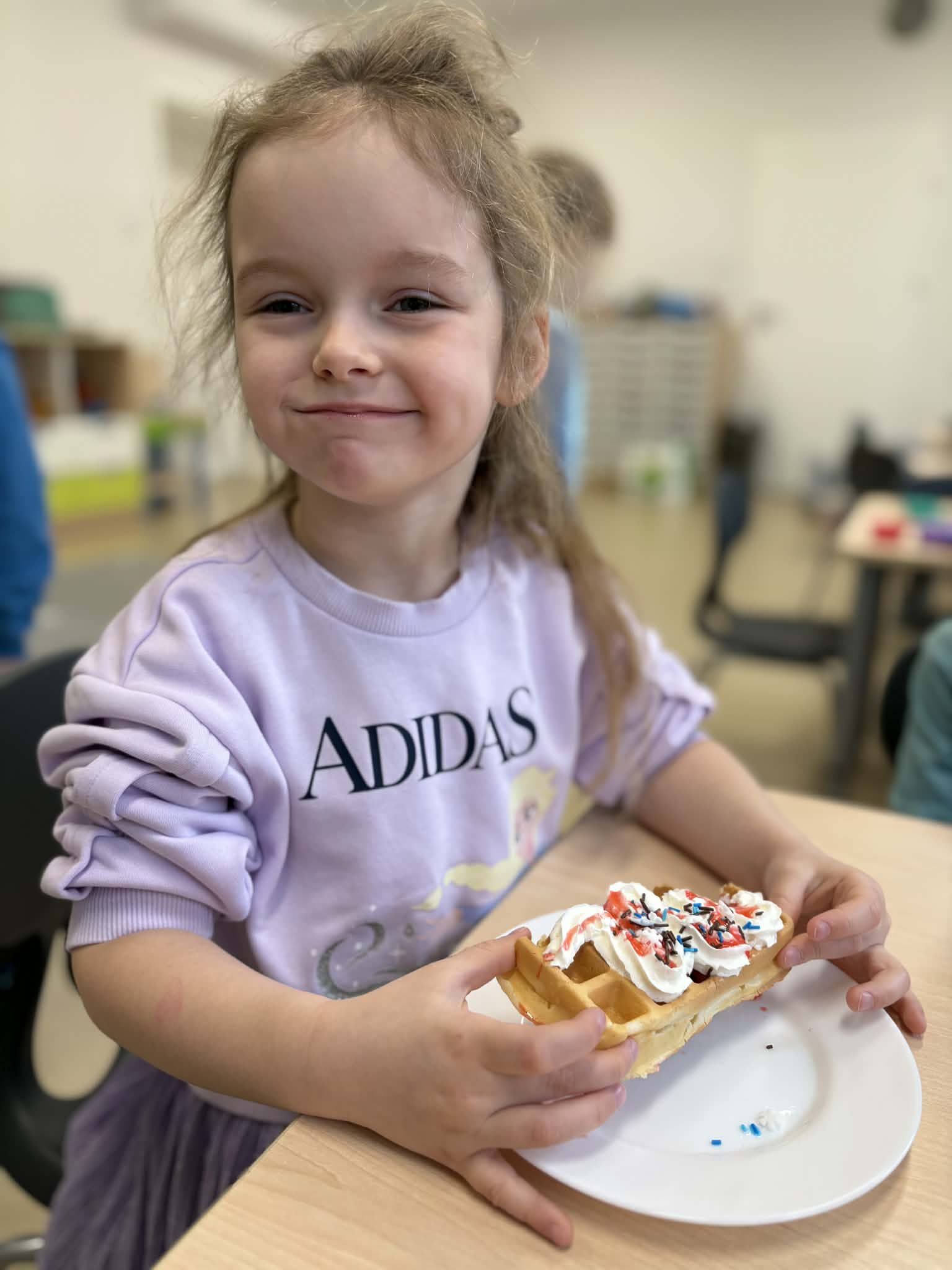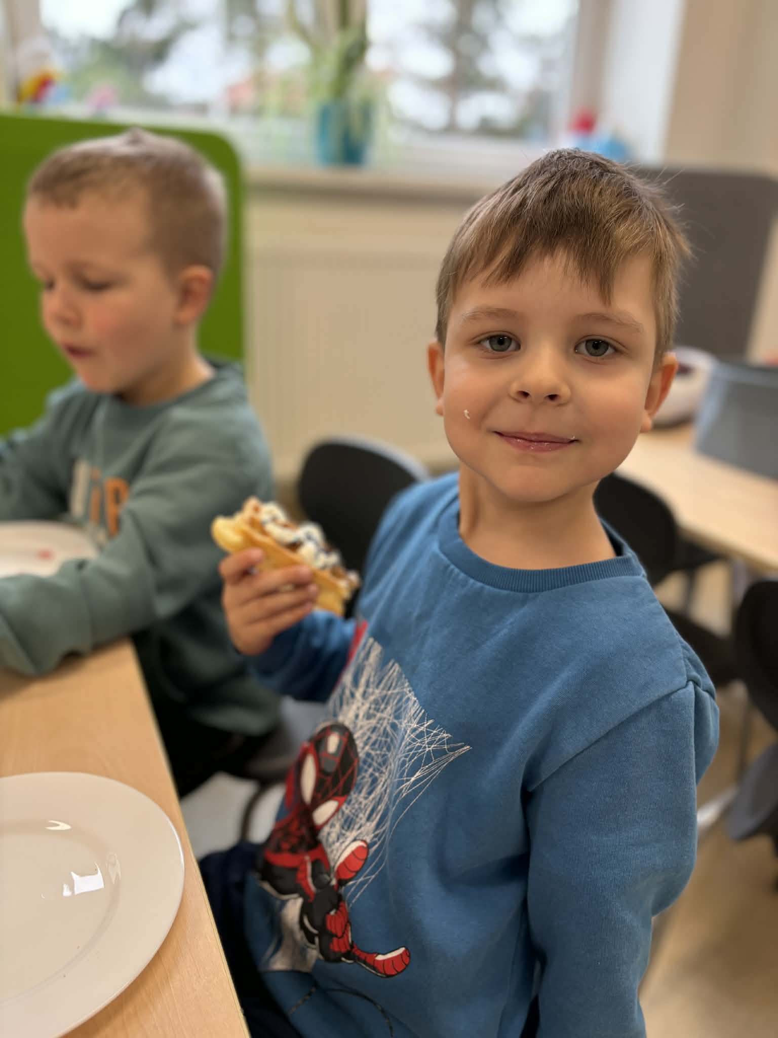 W naszej grupie odbył się wyjątkowo słodki i radosny Dzień Gofra! Tego dnia dzieci miały okazję poznać proces przygotowywania gofrów – od składników aż po gotowy, pachnący wypiek. Podczas zajęć rozmawialiśmy o tym, z czego powstają gofry oraz jakie dodatki można do nich wybrać. Dzieci z dużym zaangażowaniem uczestniczyły w przygotowaniach, a największą radość sprawiło im dekorowanie własnych gofrów. Dzień Gofra na długo pozostanie w naszej pamięci jako pełen smaku i dobrej zabawy!