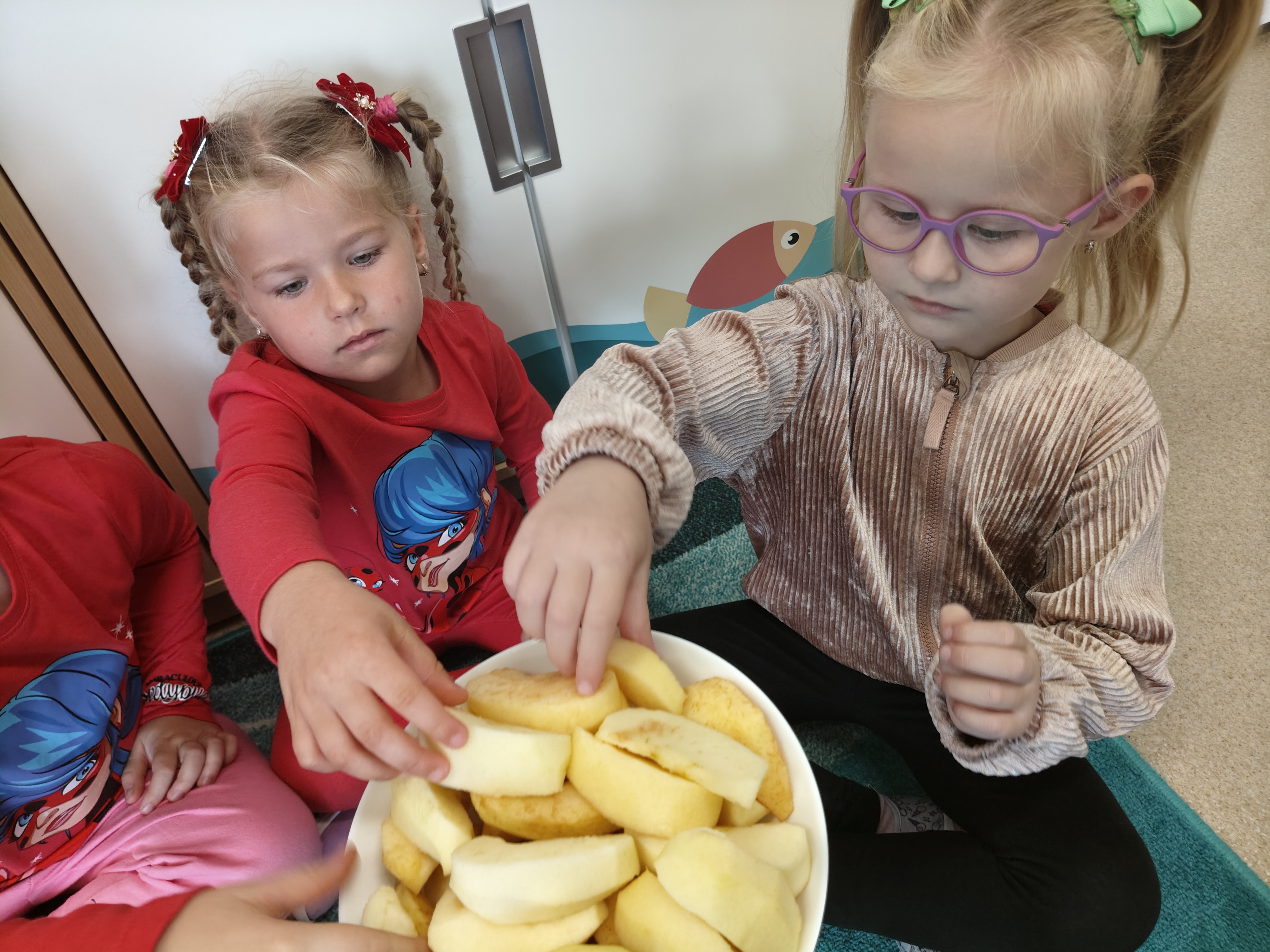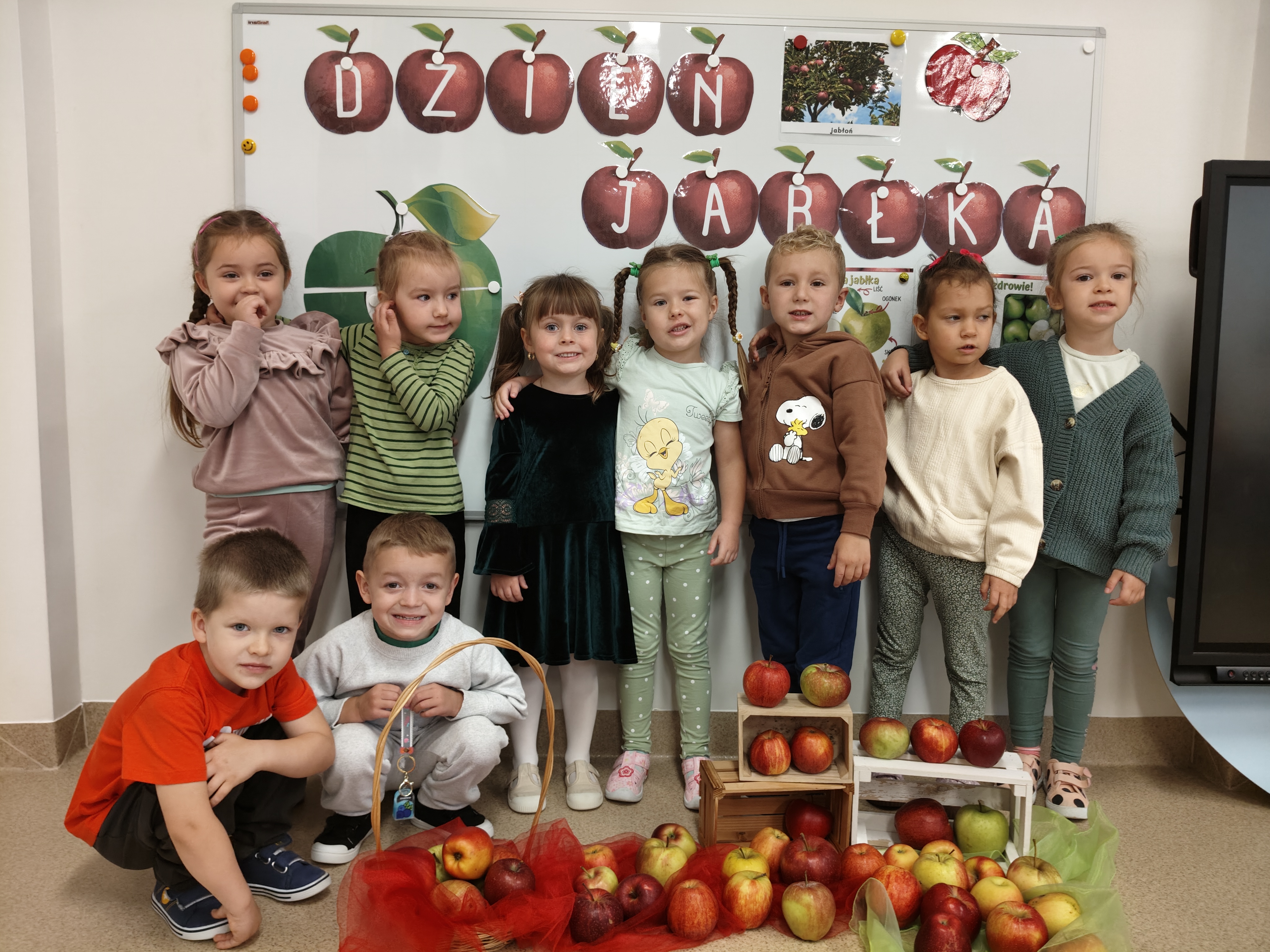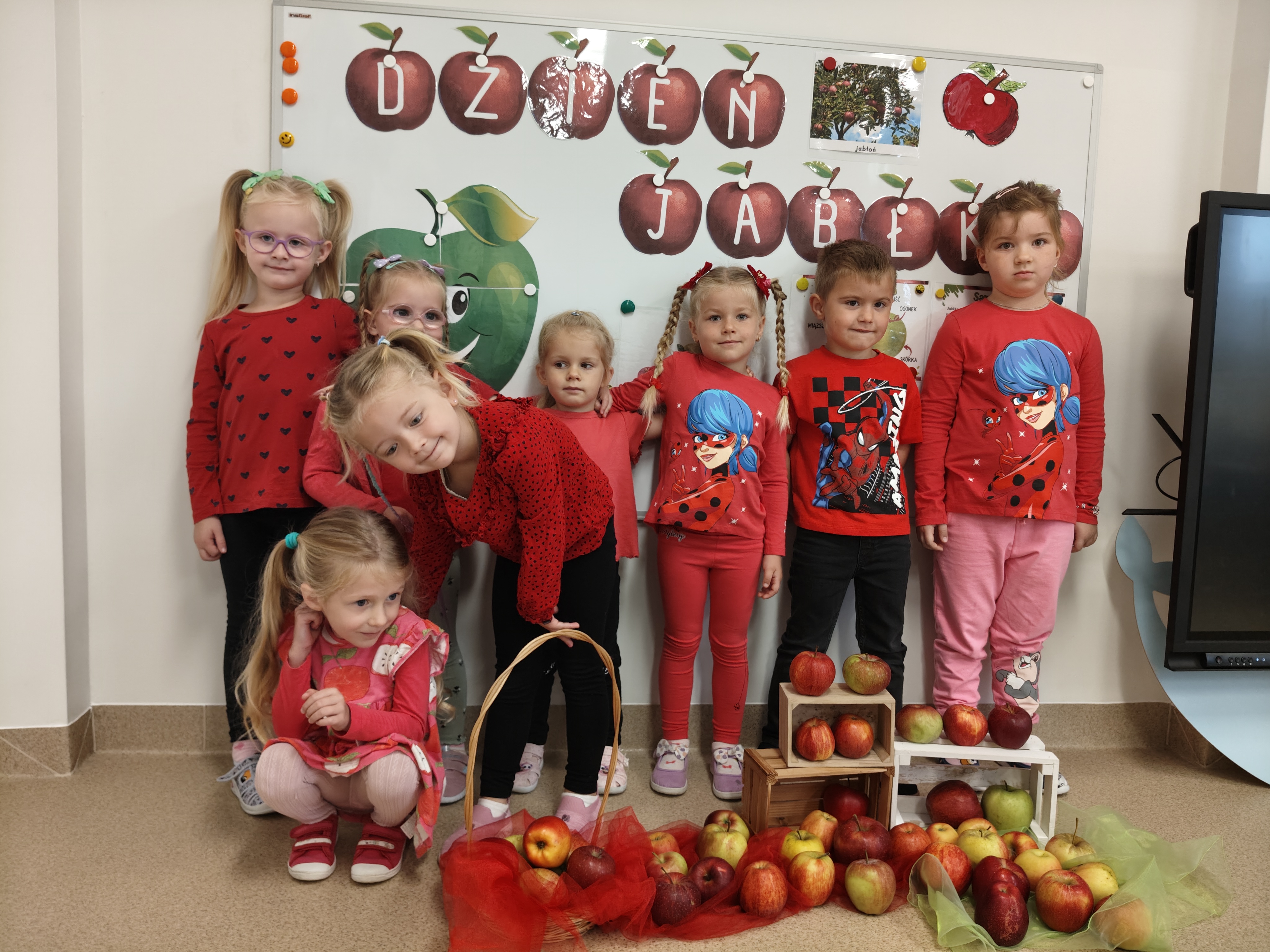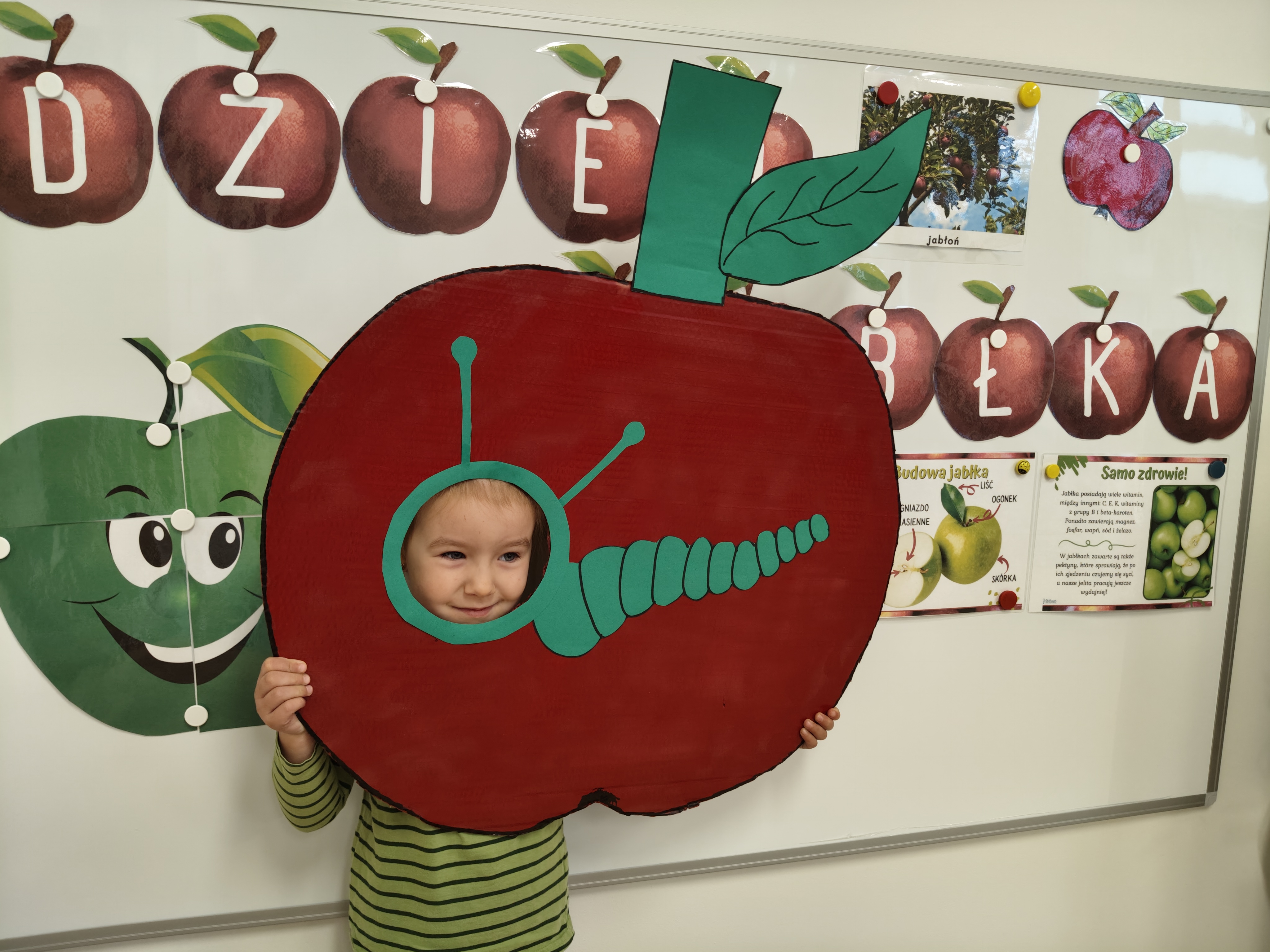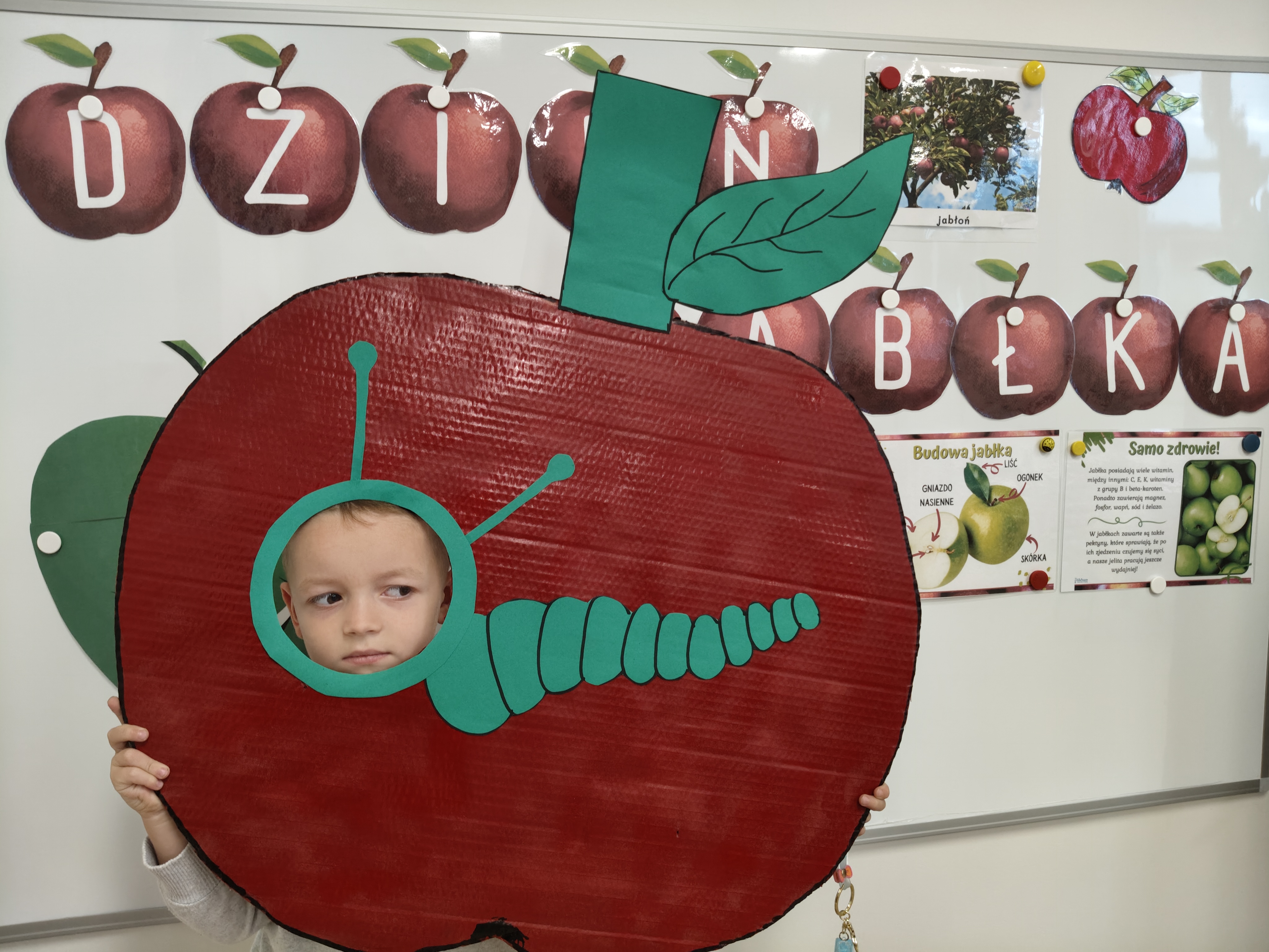29 września obchodziliśmy Dzień Jabłka. Jabłko jest najpopularniejszym owocem w naszym kraju. Celem naszych zajęć było zachęcenie dzieci do spożywania jabłek i ich przetworów jako źródła witamin. Obchody tego wyjątkowego dnia rozpoczęliśmy od rozmów na temat jego wyglądu, kolorów, wielkości, kształtu, dlaczego warto je jeść, pod jaką postacią. Przedszkolaki mogły degustować świeży sok z jabłek, dżem oraz jabłuszka. Wszystkie kolejne zabawy podczas pobytu dzieci w tym dniu w przedszkolu dotyczyły oczywiście jabłek. Były to zabawy dydaktyczne, ruchowe i matematyczne. Tego dnia przedszkolaki wykonały także piękne prace plastyczne.