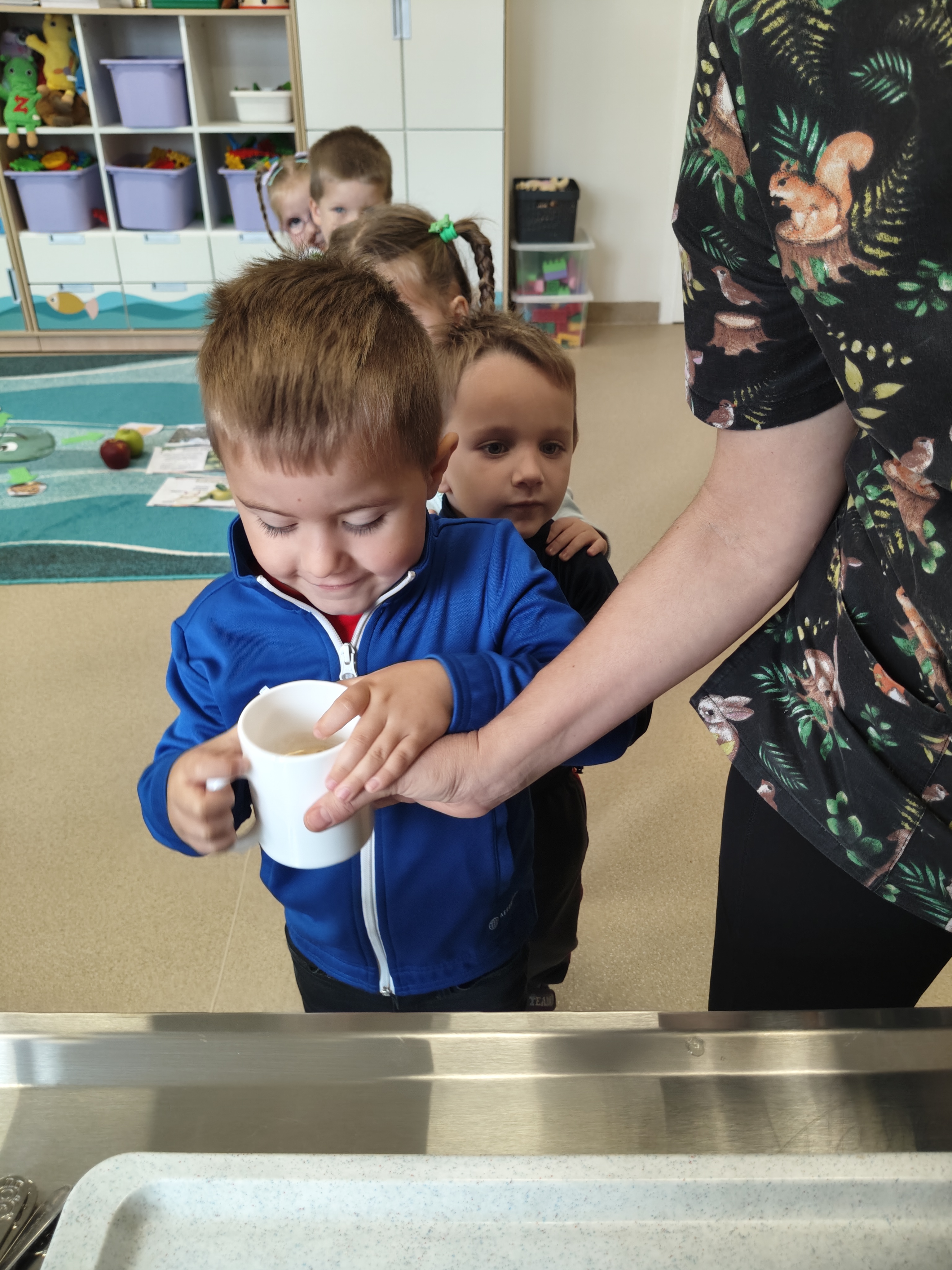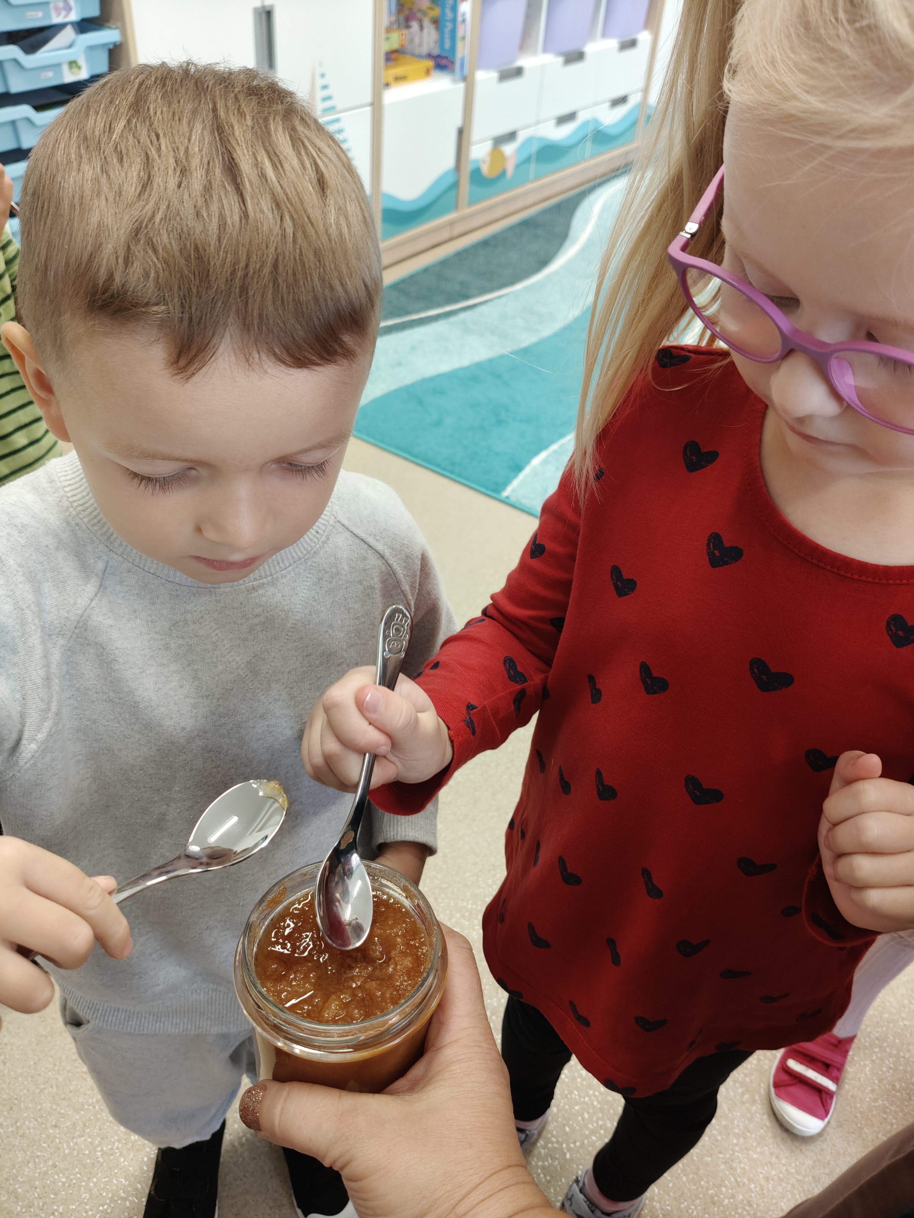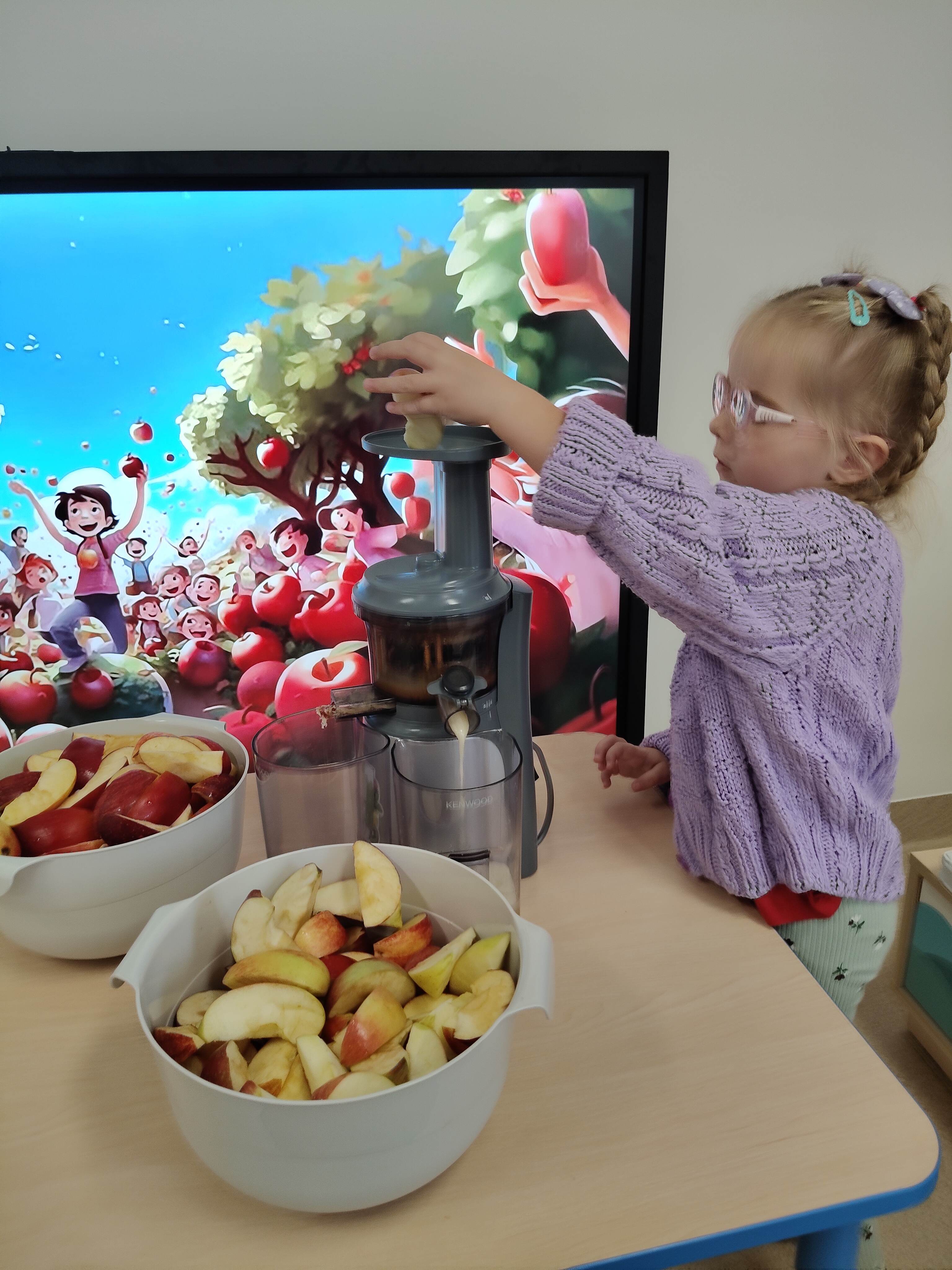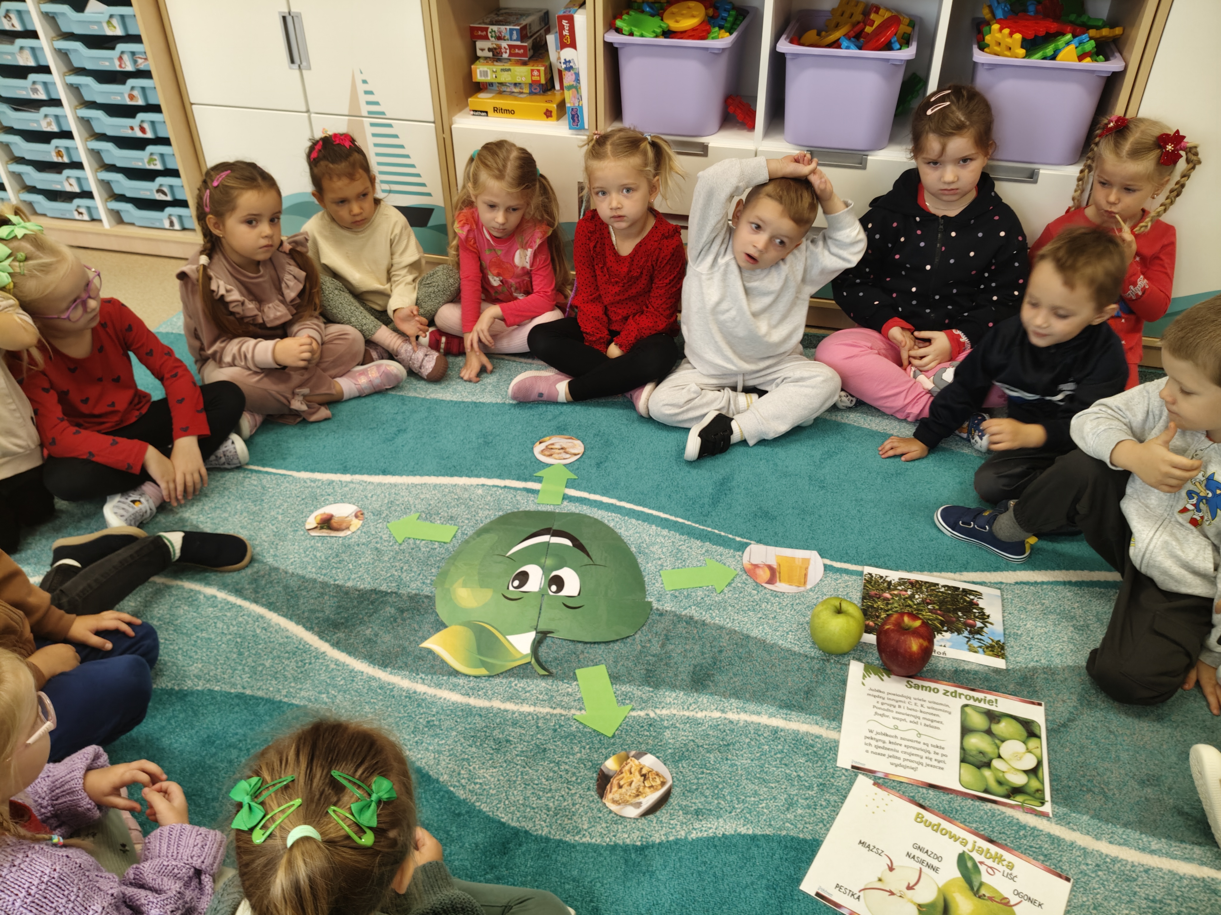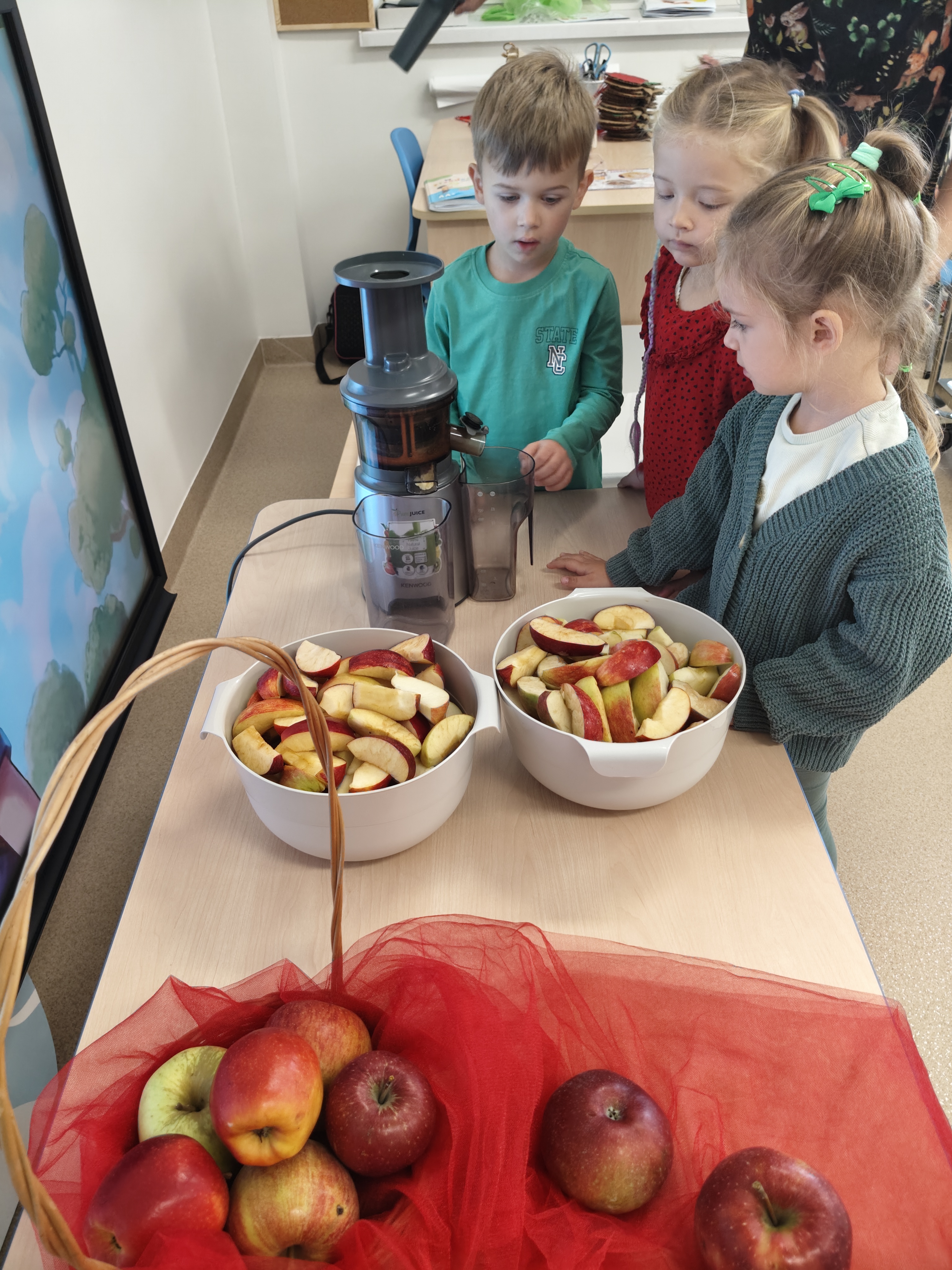 29 września obchodziliśmy Dzień Jabłka. Jabłko jest najpopularniejszym owocem w naszym kraju. Celem naszych zajęć było zachęcenie dzieci do spożywania jabłek i ich przetworów jako źródła witamin. Obchody tego wyjątkowego dnia rozpoczęliśmy od rozmów na temat jego wyglądu, kolorów, wielkości, kształtu, dlaczego warto je jeść, pod jaką postacią. Przedszkolaki mogły degustować świeży sok z jabłek, dżem oraz jabłuszka. Wszystkie kolejne zabawy podczas pobytu dzieci w tym dniu w przedszkolu dotyczyły oczywiście jabłek. Były to zabawy dydaktyczne, ruchowe i matematyczne. Tego dnia przedszkolaki wykonały także piękne prace plastyczne.
