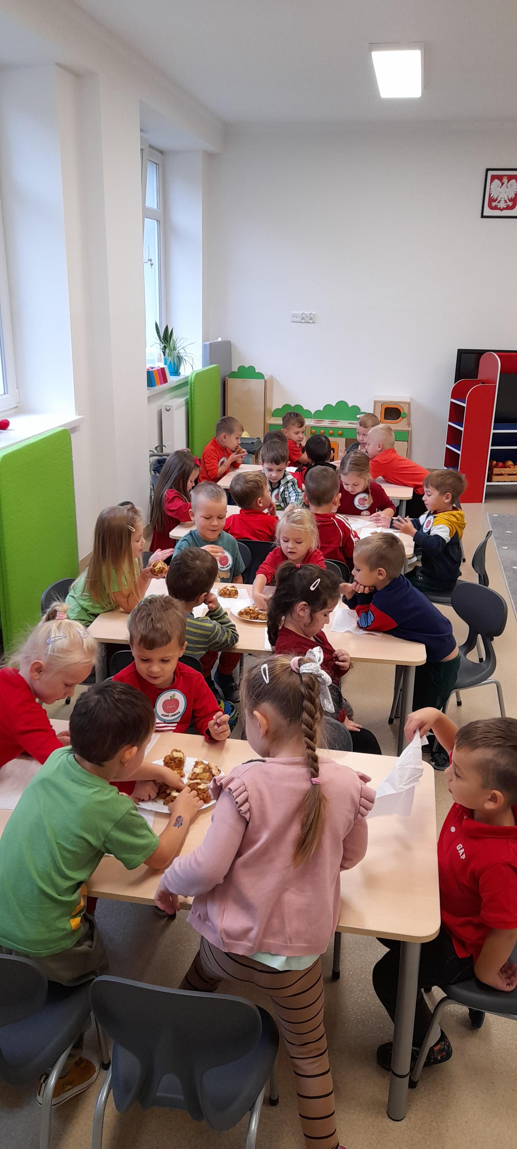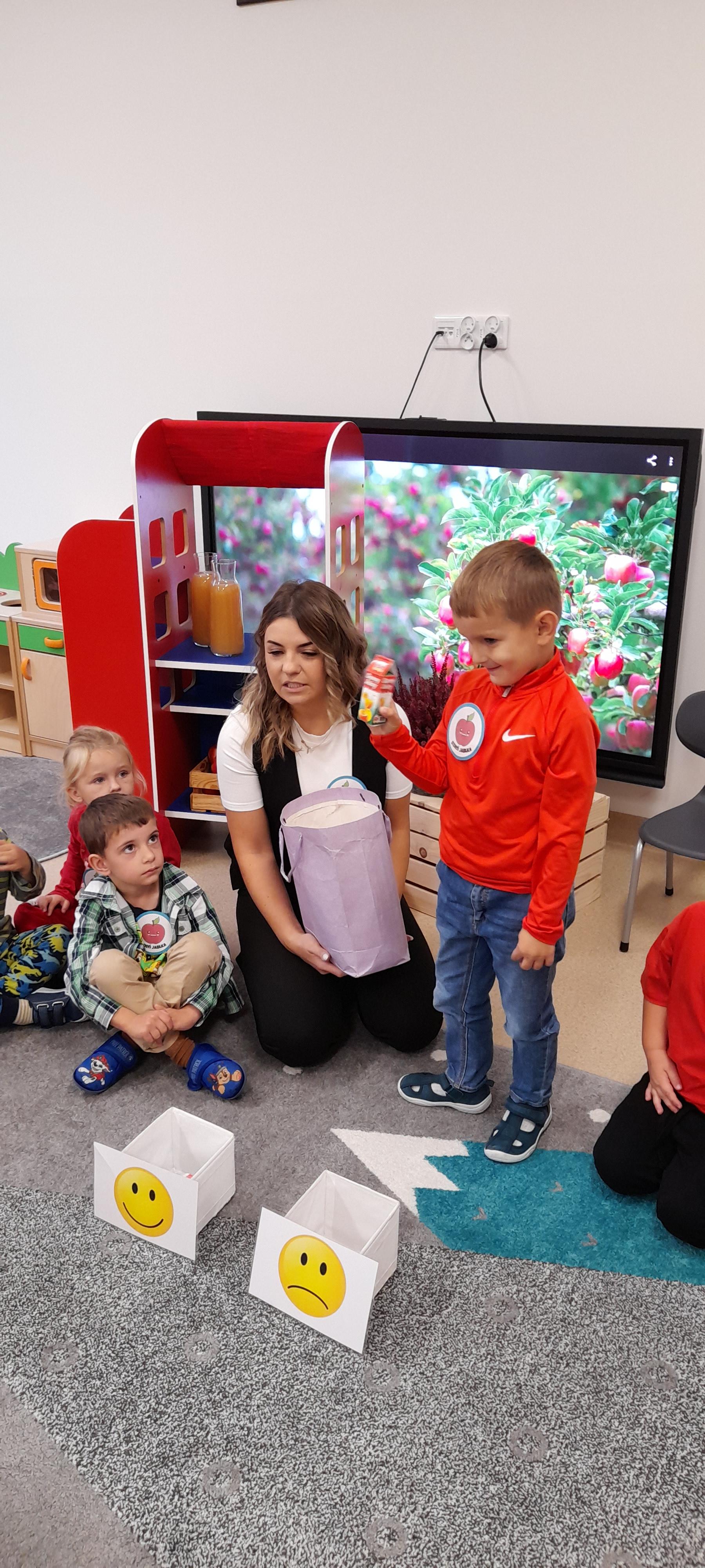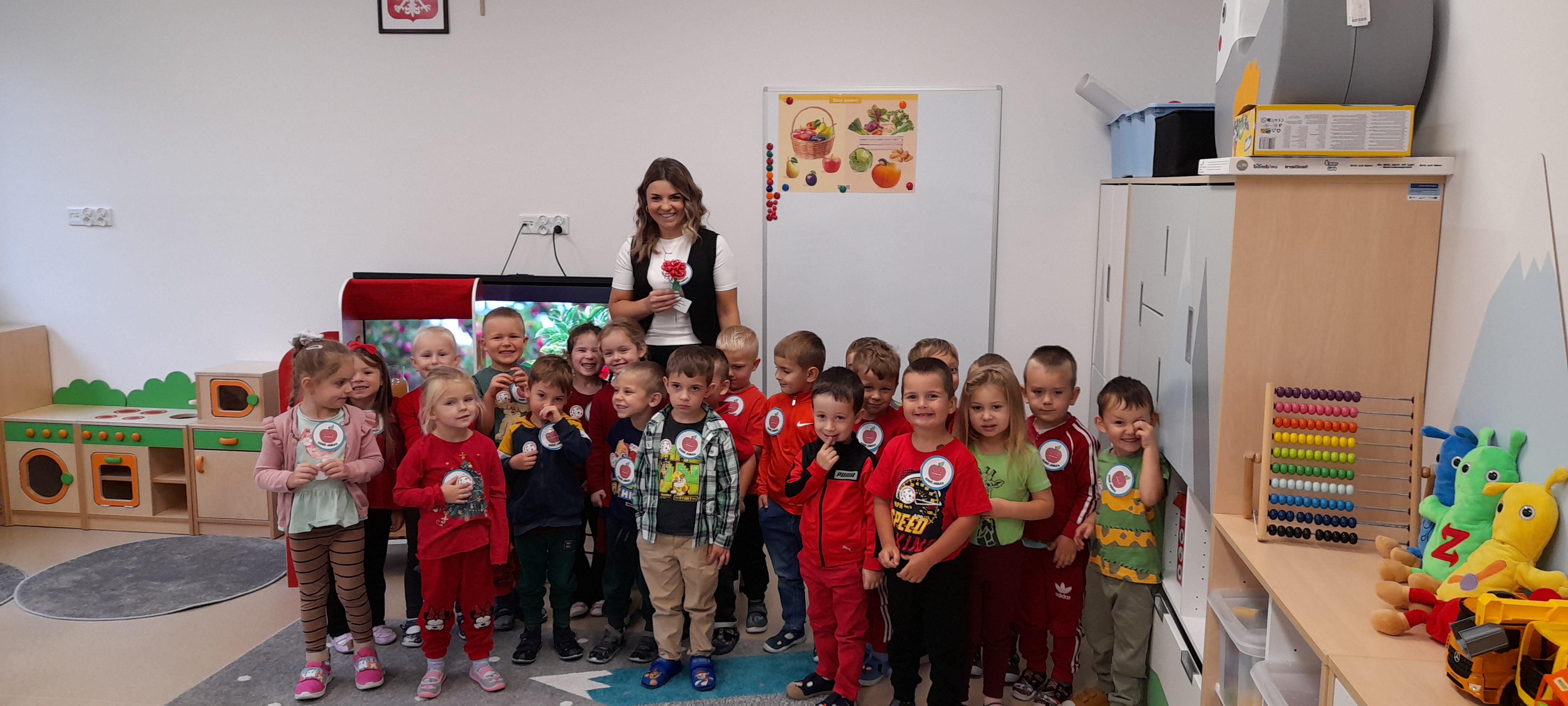W dniu dzisiejszym grupa "Smerfiki" obchodziła "Dzień Jabłka". Podczas wydarzenia gościliśmy Panią dietetyk Martynę Pruchnik z Gabinetu Dietetycznego Bonne Santé Jasło, która opowiedziała dzieciom o zdrowym stylu życia, roli owoców i warzyw w codziennej diecie oraz udzieliła praktycznych wskazówek, jak w prosty i smaczny sposób wprowadzać zdrowe produkty do codziennego jadłospisu. Przedszkolaki z zaciekawieniem wysłuchały w jaki sposób żywność wpływa na nasze zdrowie i codzienne funkcjonowanie. Pani dietetyk tłumaczyła dlaczego należy ograniczać spożycie słodyczy i słodkich napojów. Spotkanie było bardzo inspirujące i dostosowane do wieku dzieci. Serdeczne podziękowania kierujemy do Pani Martyny za poświęcony czas, ciekawe porady i wspaniałą współpracę. Dziękujemy również wszystkim rodzicom za zaangażowanie w Dniu Jabłka.