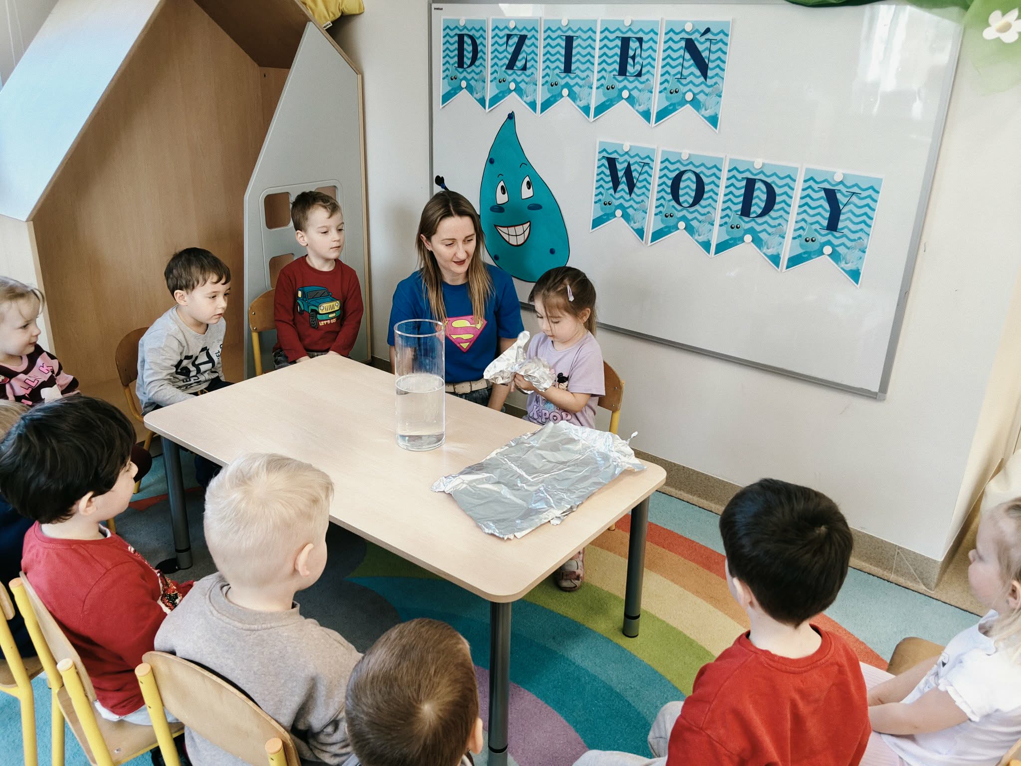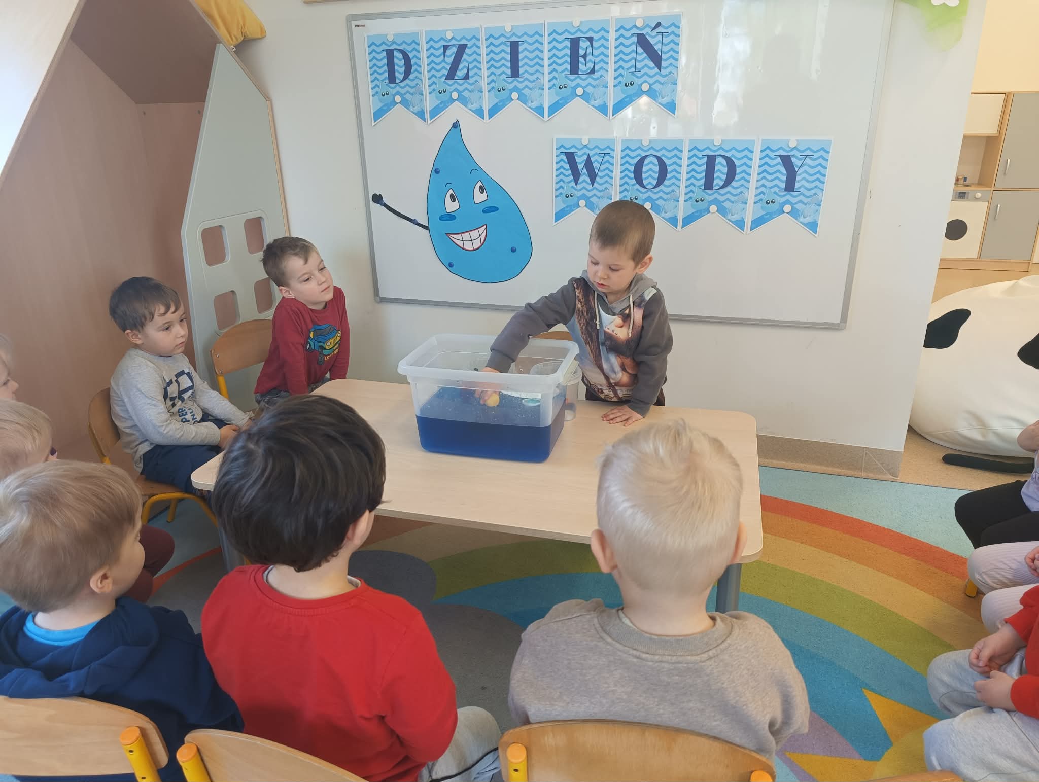 Dzień Wody w przedszkolu obchodzony 22 marca - to doskonała okazja do edukacji ekologicznej poprzez zabawę. Dzieci uczą się oszczędzania wody, poznają jej znaczenie dla życia, biorą udział w doświadczeniach badawczych (pływa/tonie, rozpuszczanie), kolorują kropelki i noszą niebieskie emblematy, co rozwija świadomość ekologiczną od najmłodszych lat.