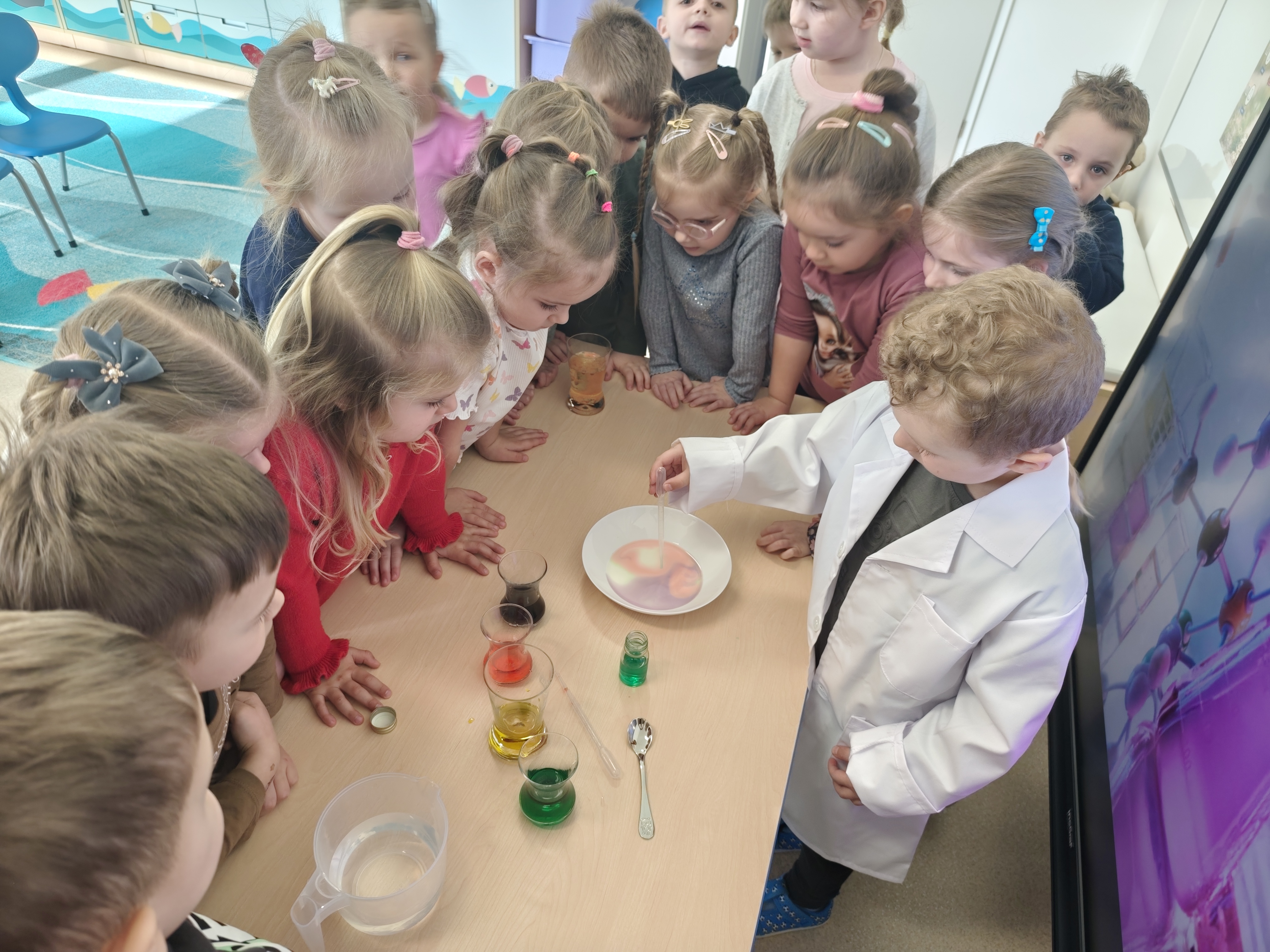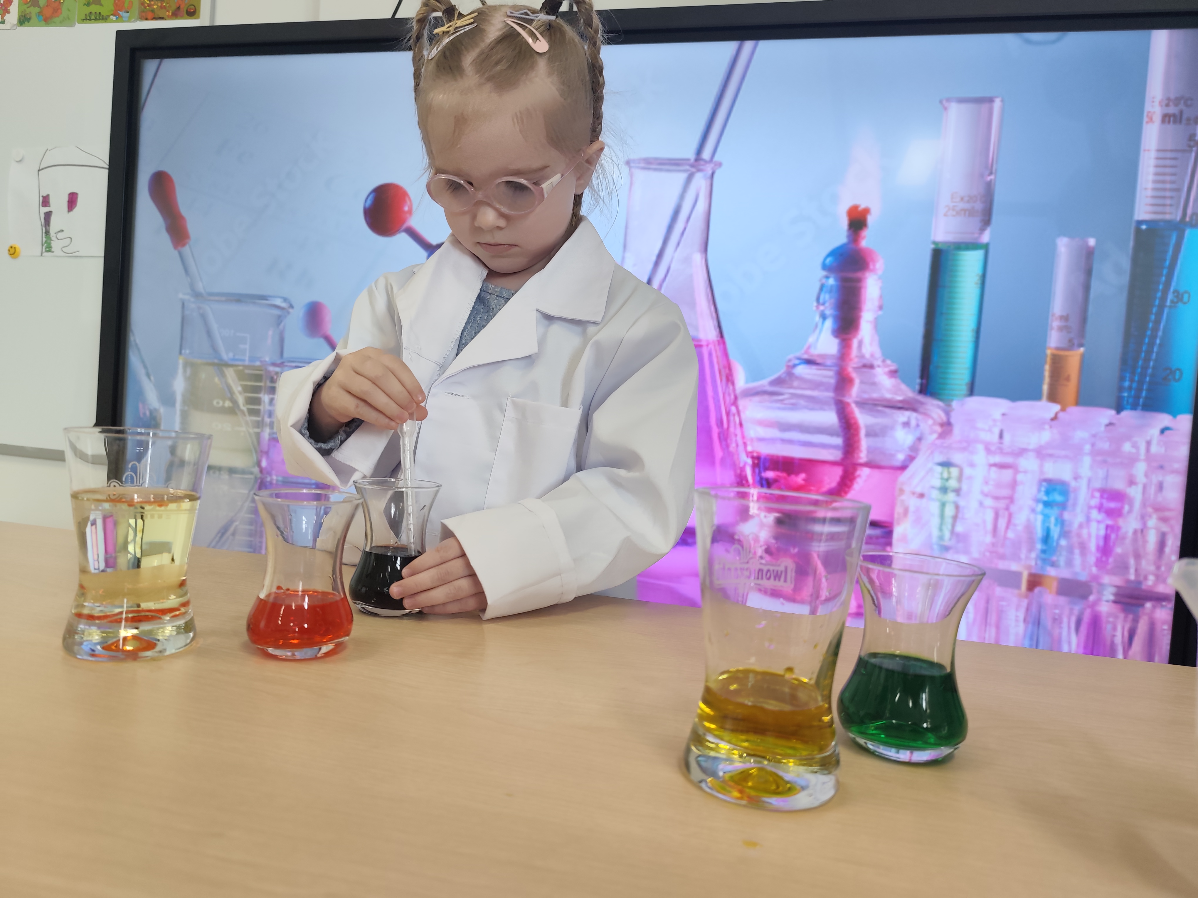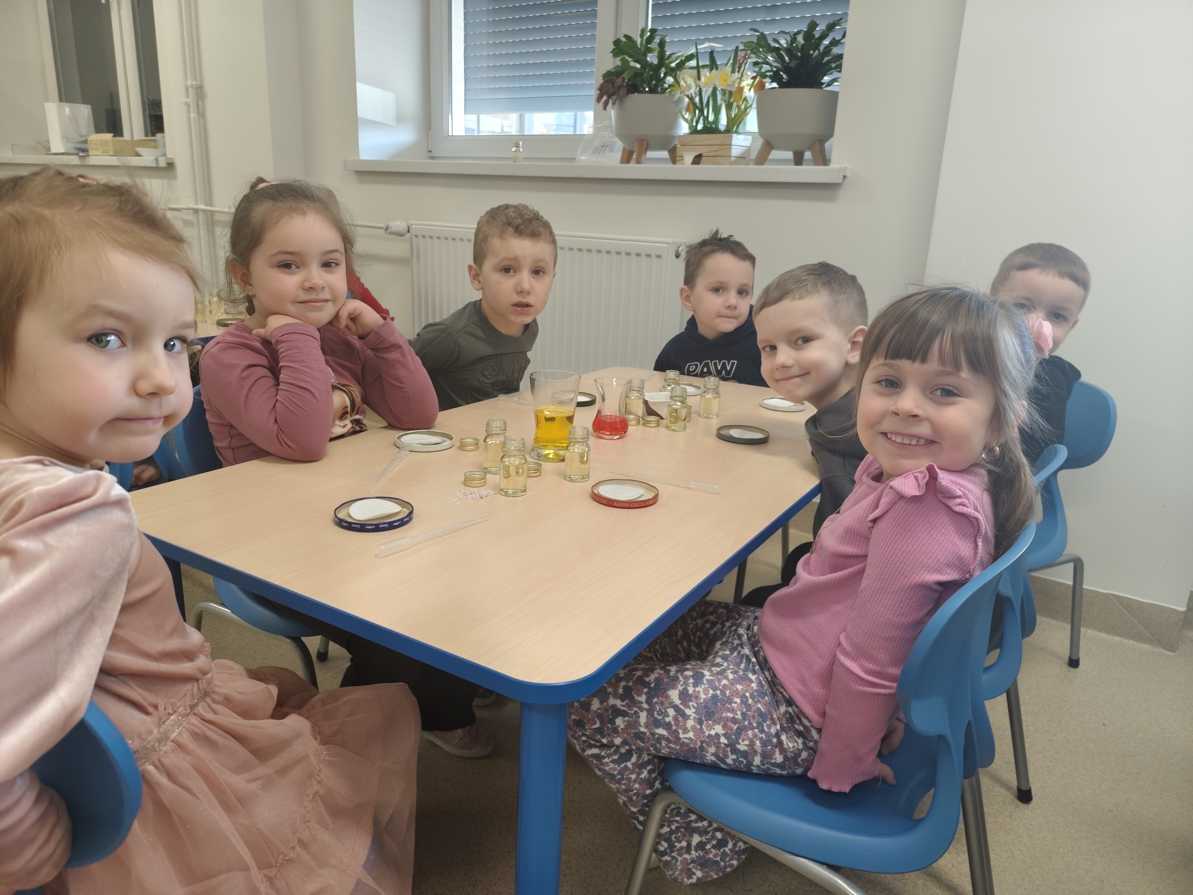 Dzieci w małym laboratorium wcieliły się w naukowców-przeprowadzały proste eksperymenty, takie jak miesznie substancji, obserwowanie reakcji czy badanie właściwości wody. Zajęcia rozwijały ciekawość poznawczą, umiejetnośc obserwacji oraz wyciaganie wniosków. Dzieci wykazały postawę prawdziwych naukowców.