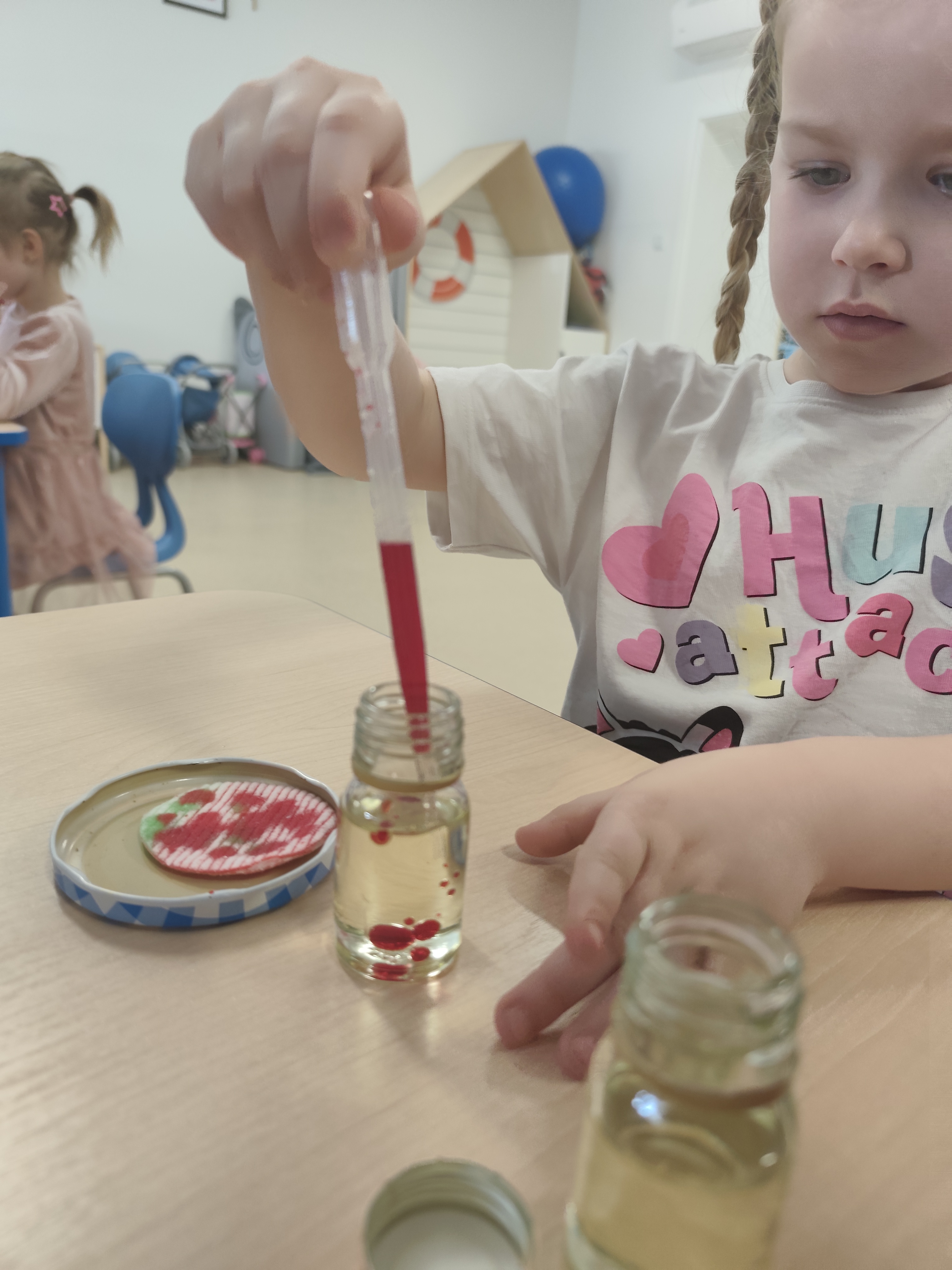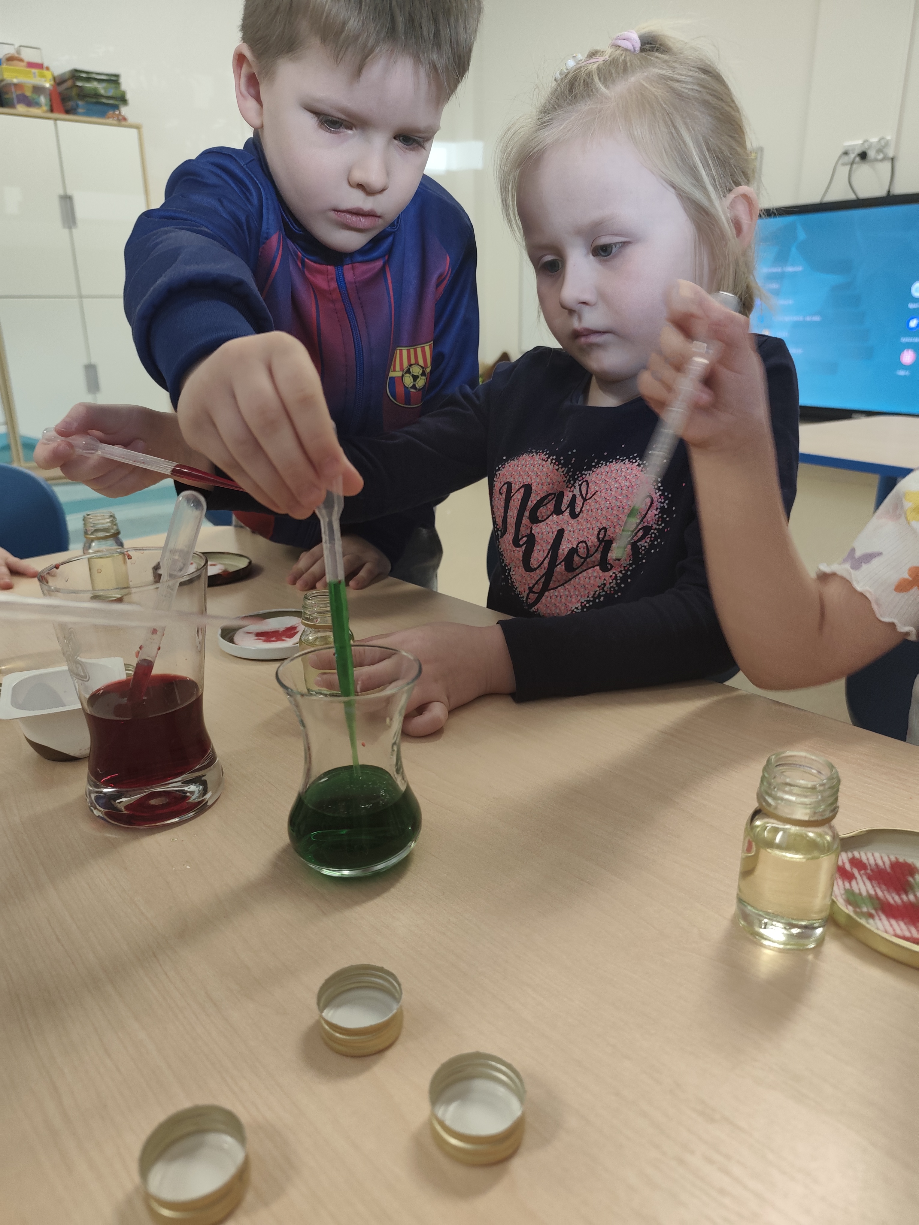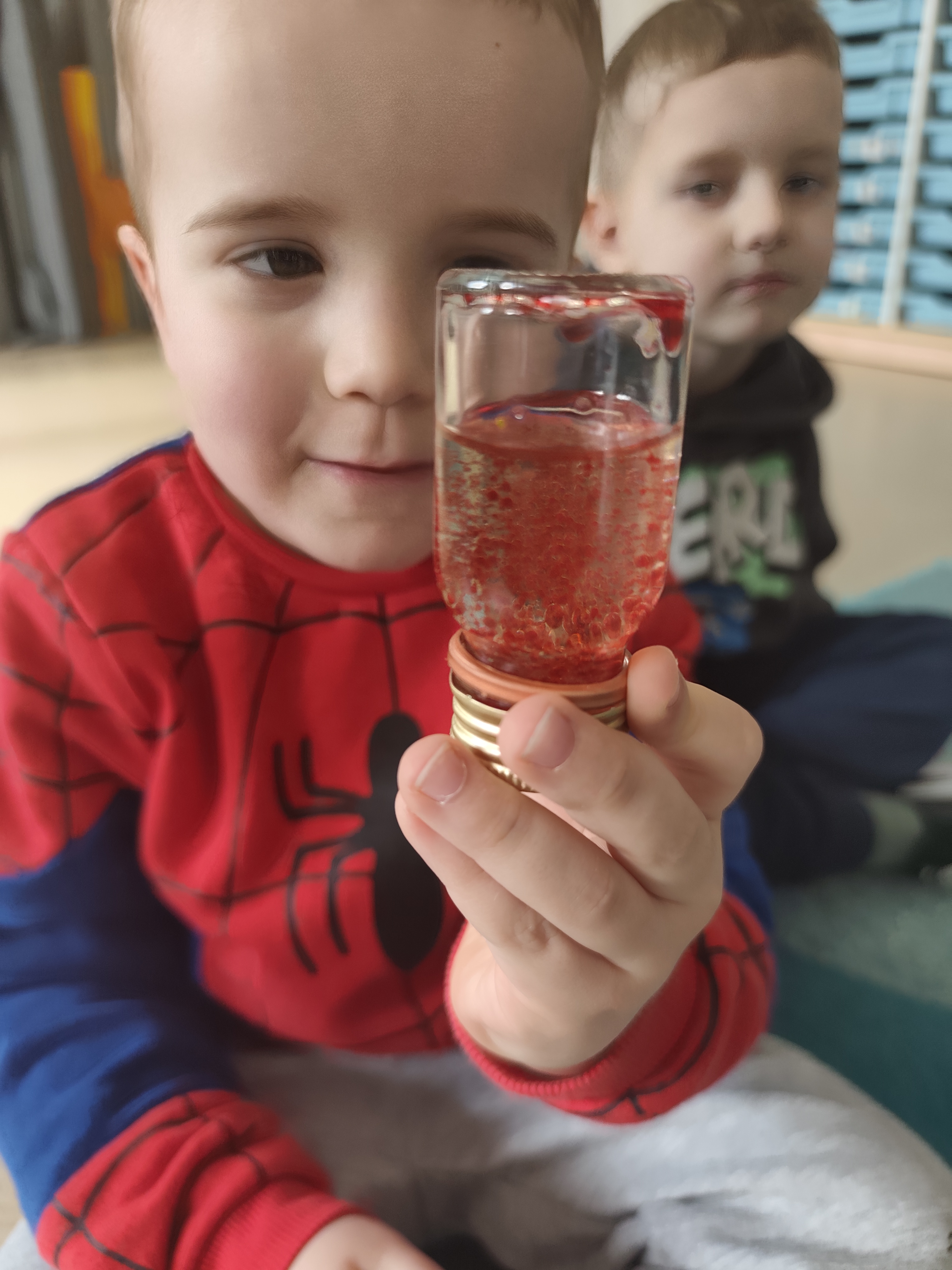 W ramach tematyki "Odkrywcy" w przedszkolu zrealizowano zajęcia z wykorzystaniem sensorycznych słoiczków oraz przedszkolnego małego laboratorium. Dzieci miały okazje samodzielnie tworzyć kolorowe słoiczki z olejem, barwnikami i kolorowymi różnymi drobnymi emementami, obserwując mieszanie sie kolorów oraz efekt opadania i unoszenia się cząsteczek.