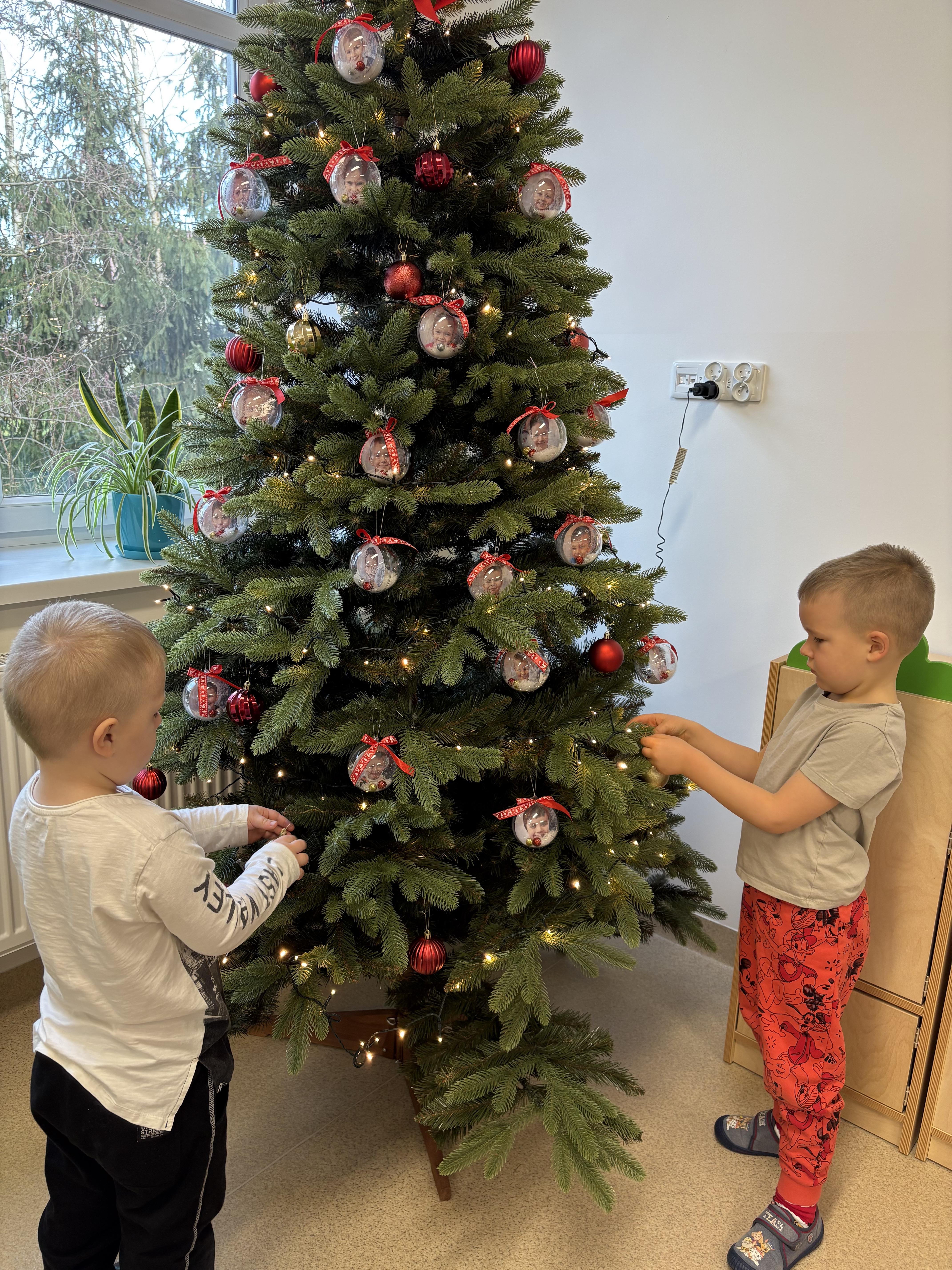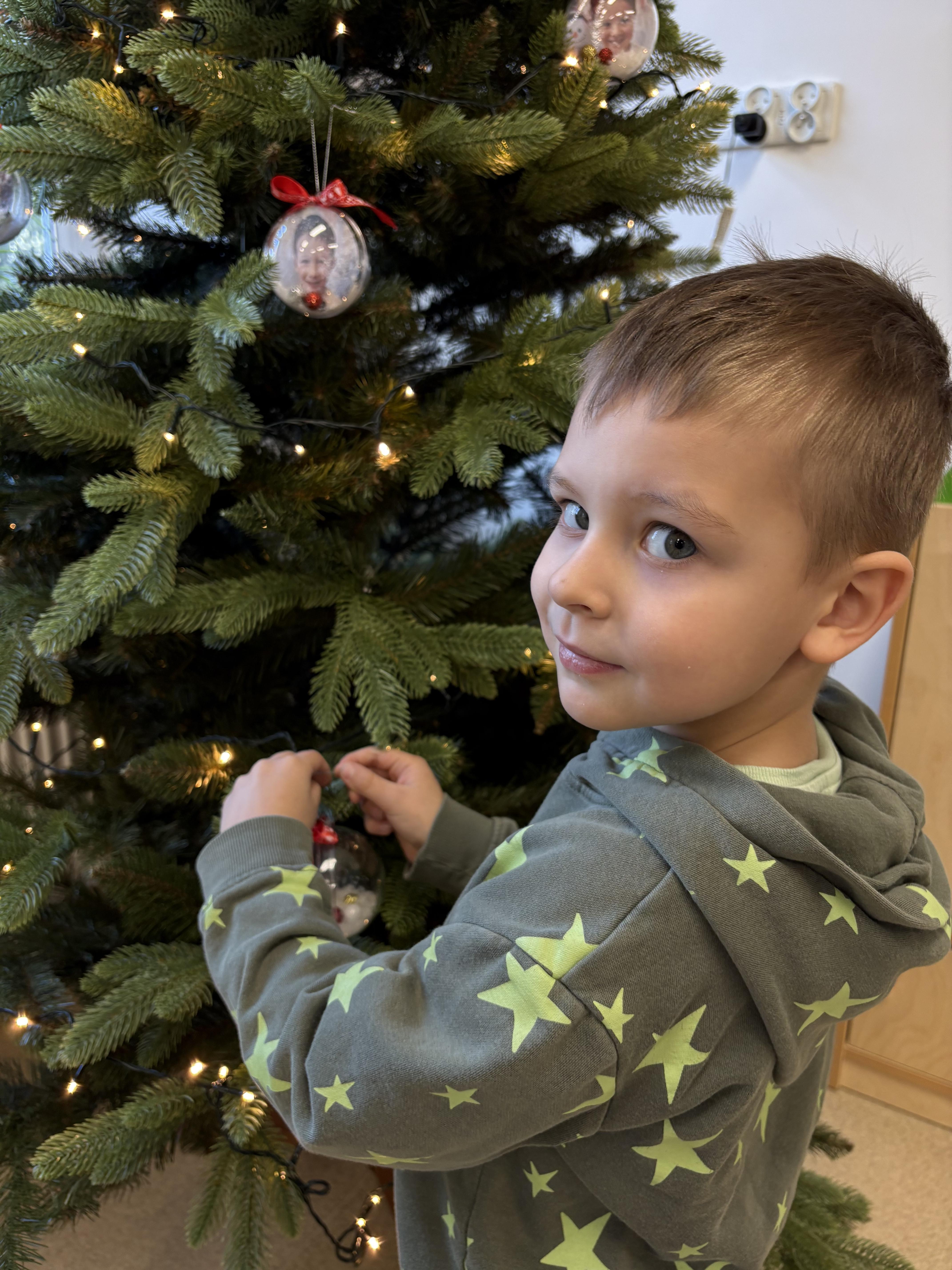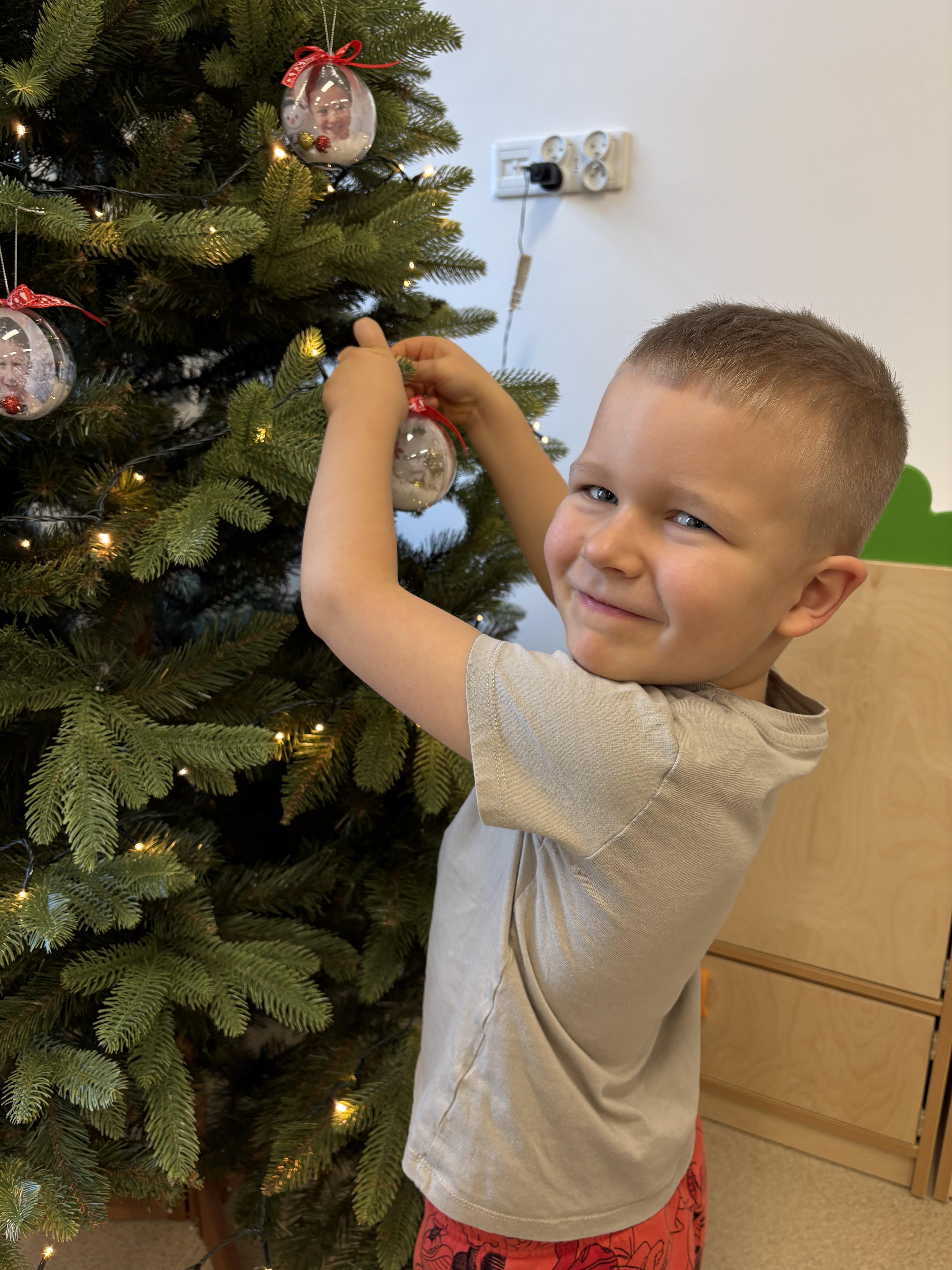 Nasze przedszkolaki z wielkim zaangażowaniem i radością ubierały choinkę. Każde dziecko mogło wybrać swoją ozdobę i zawiesić ją w wybranym miejscu — dzięki temu nasza choinka jest wyjątkowa, kolorowa i pełna dziecięcej kreatywności. Dziękujemy naszym małym pomocnikom — wykonali kawał świetnej roboty!