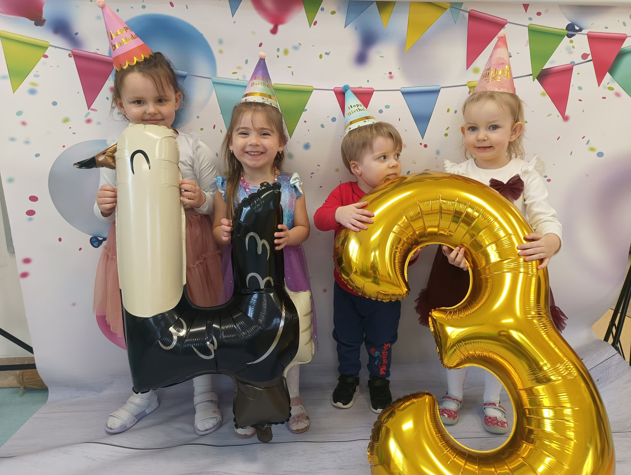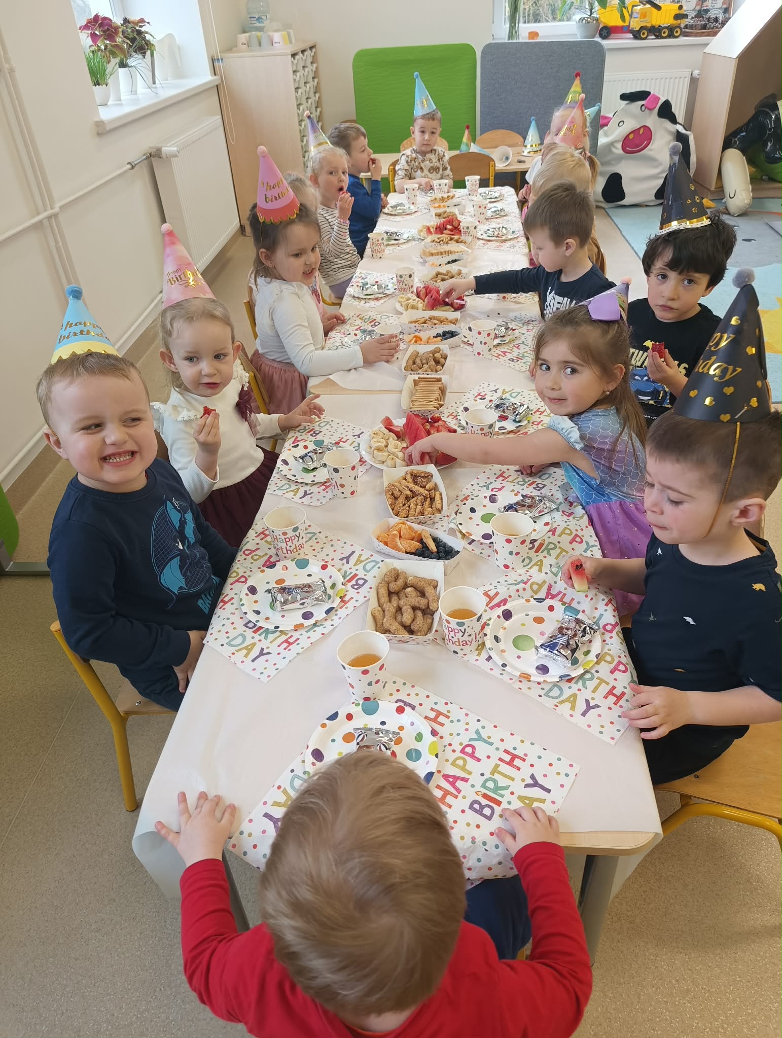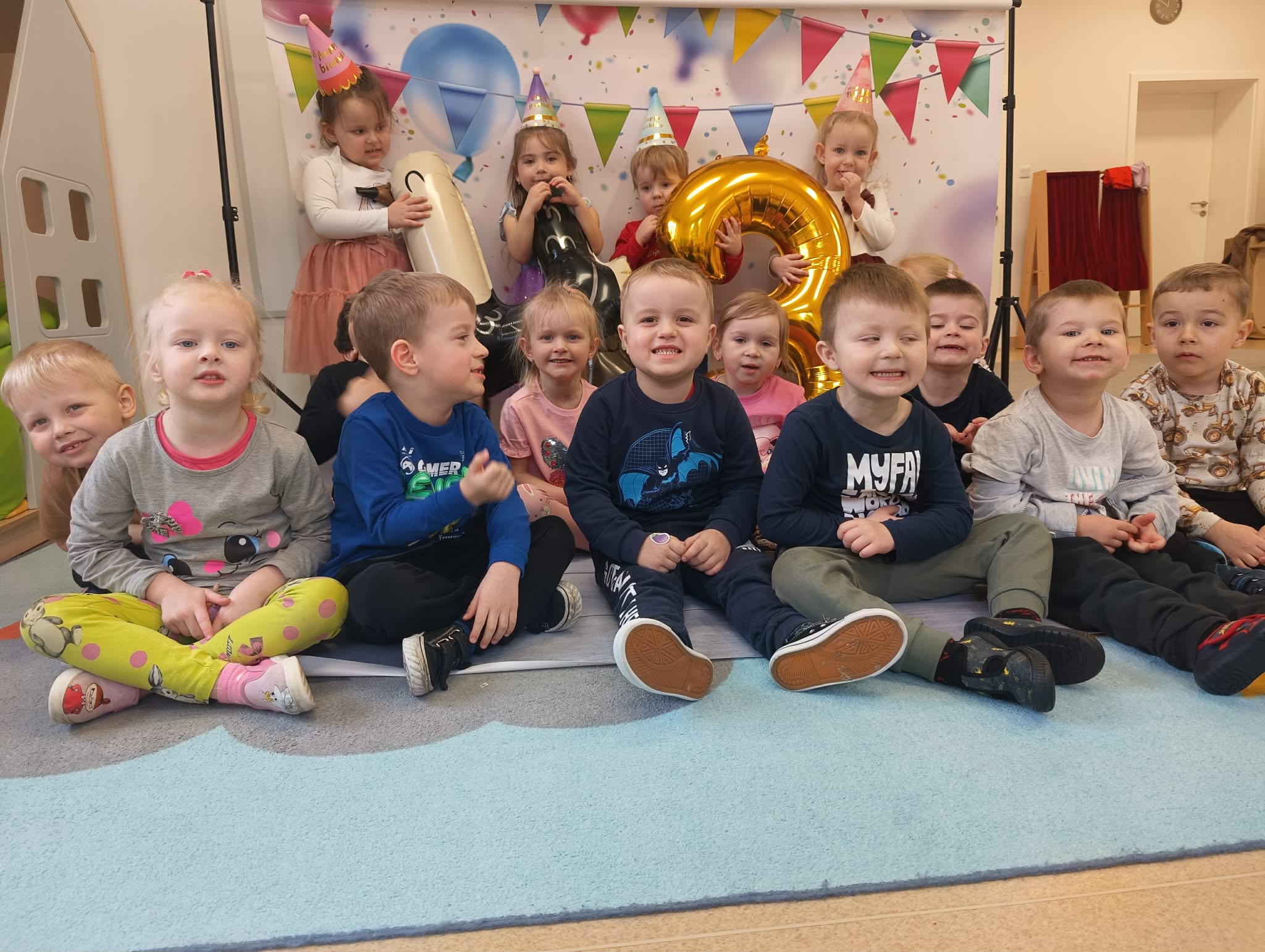 "Dziś w przedszkolu wielka sprawa,bo urodzin nadszedł czas! Niech się śmieje buzia mała,radość niech otacza nas!
