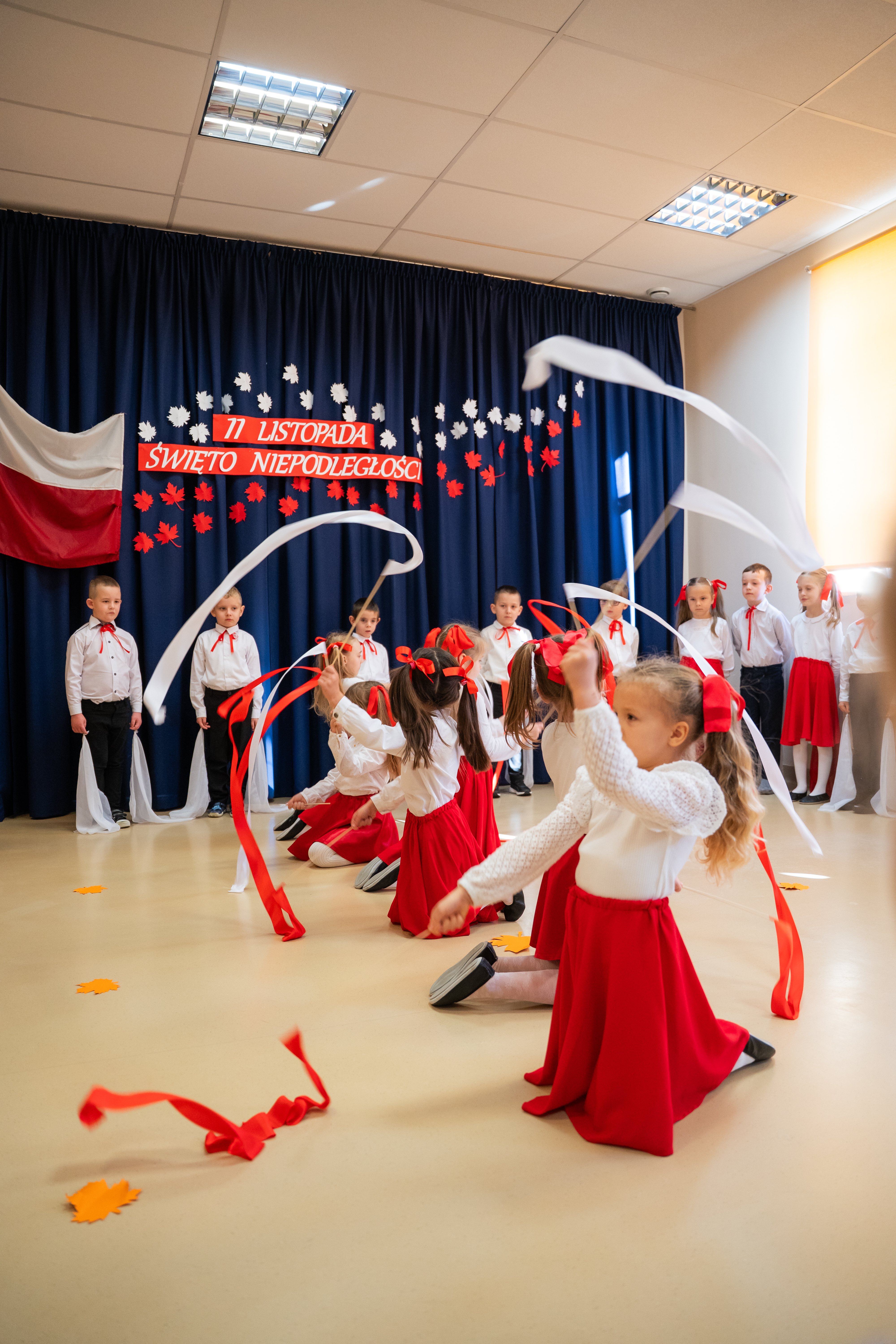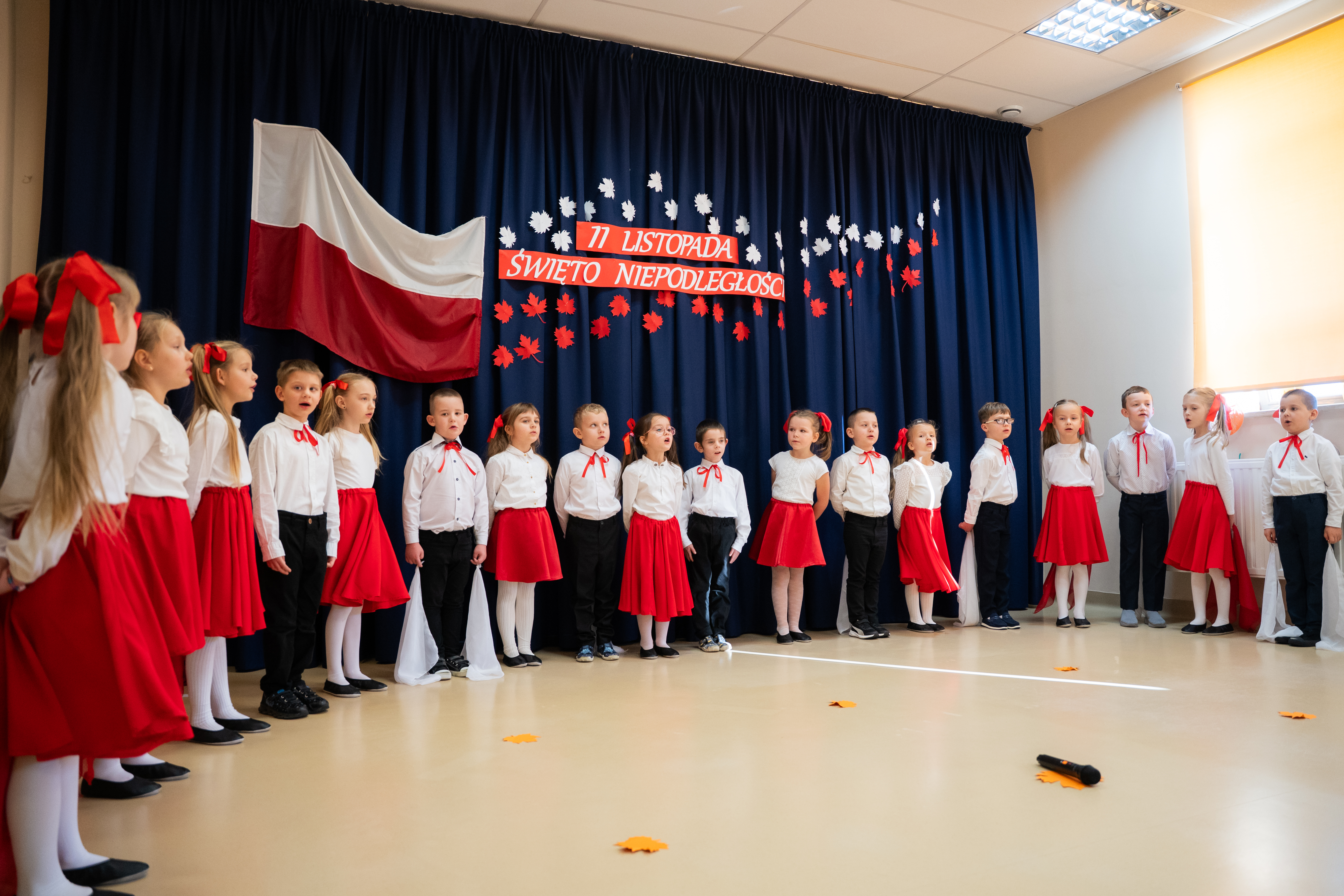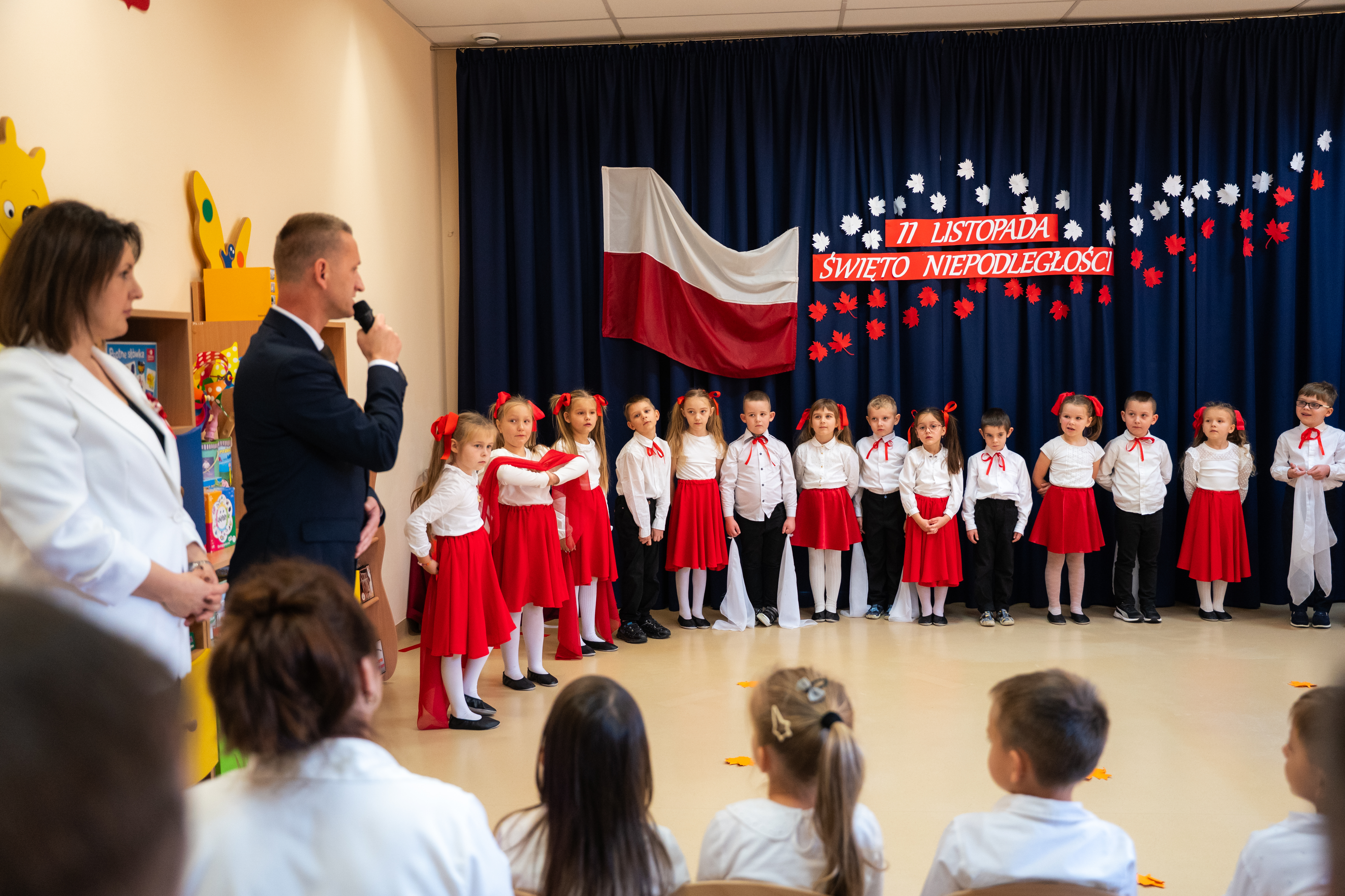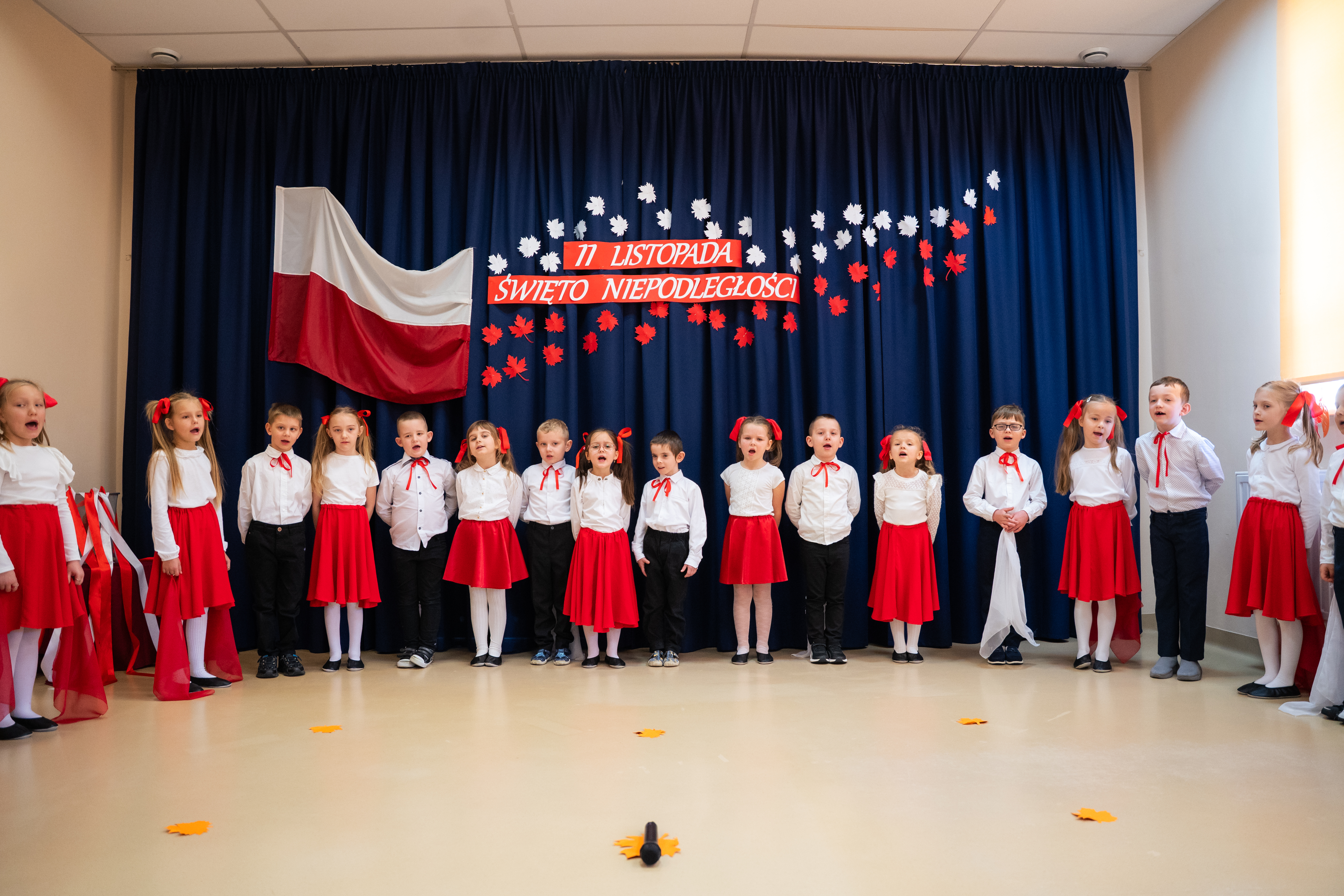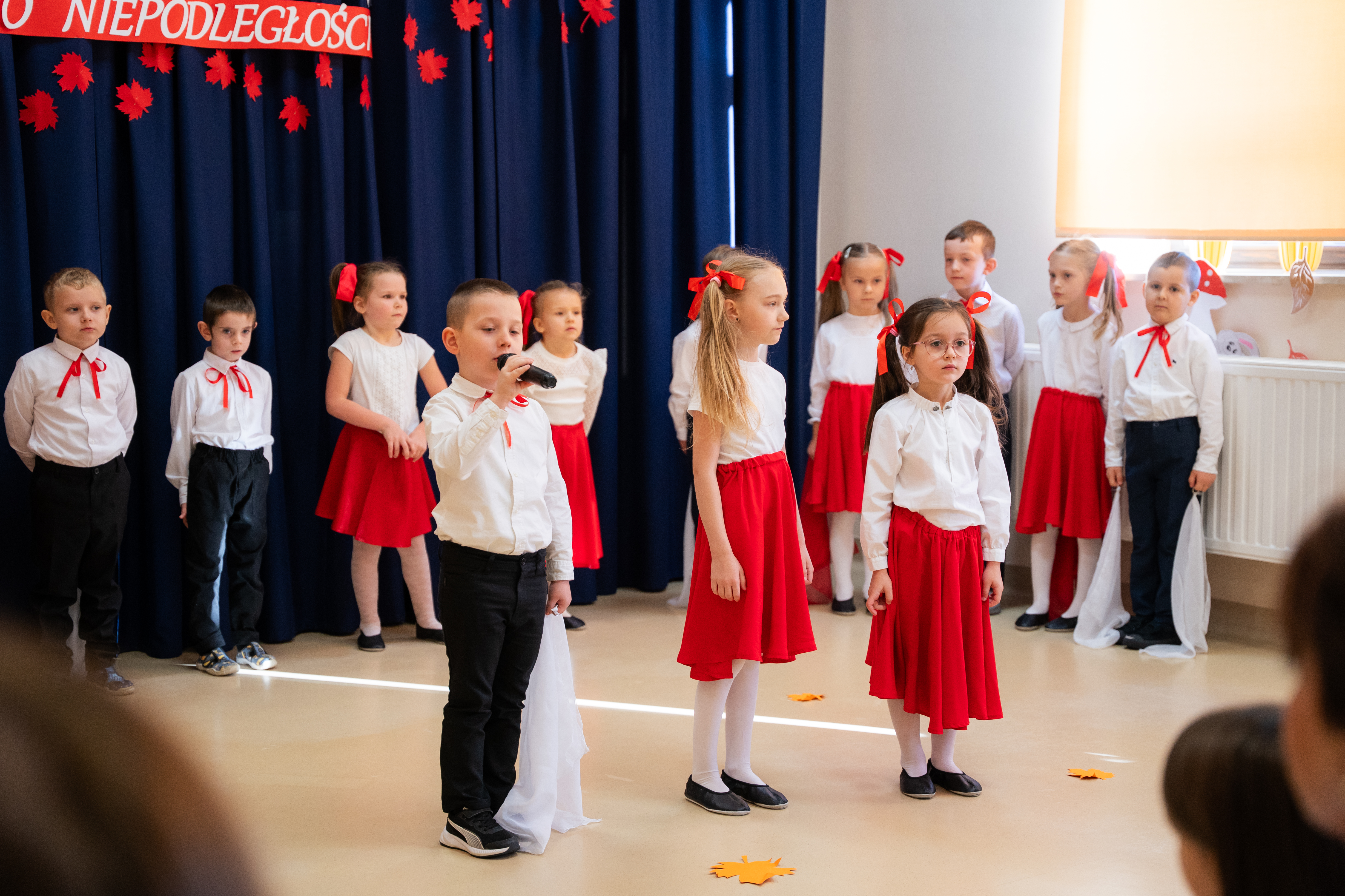 Dnia 7 listopada 2025 r. dzieci z grupy "Słoneczka" zaprezentowały montaż słowno-muzyczny upamiętniający dzień odzyskania przez Polskę NIepodległości. Podczas występu odśpiewano również wspólnie hymn "Mazurek Dąbrowskiego".