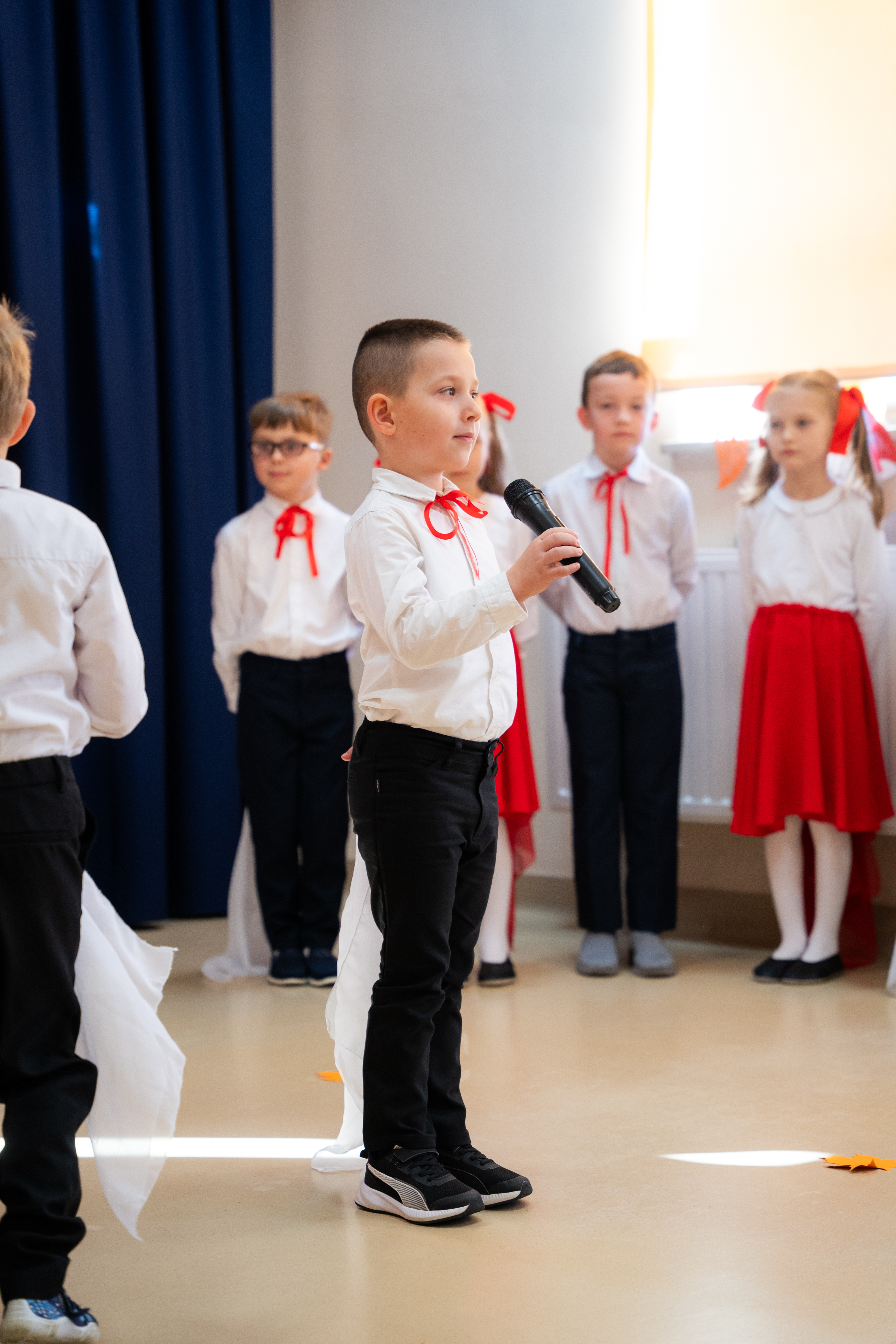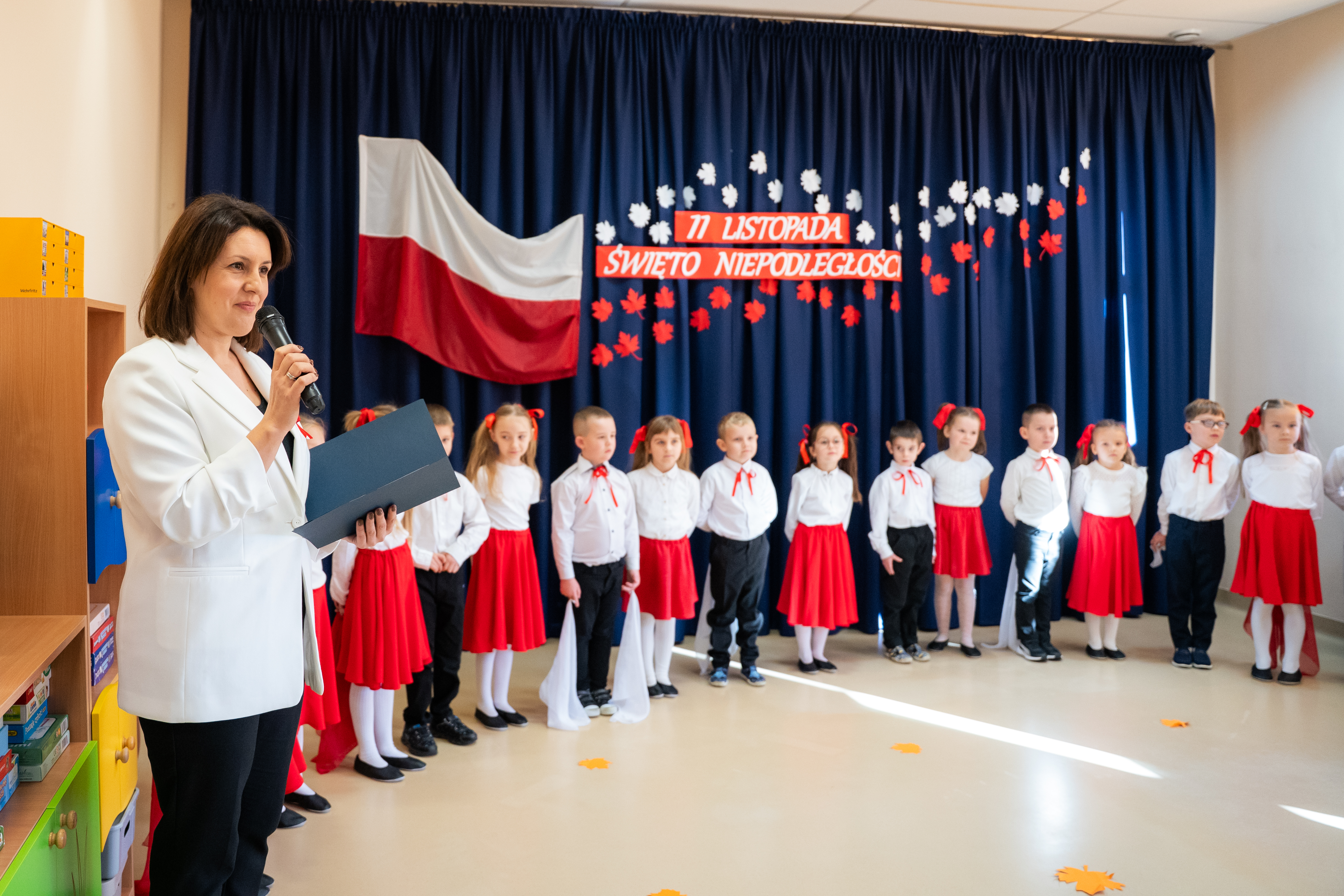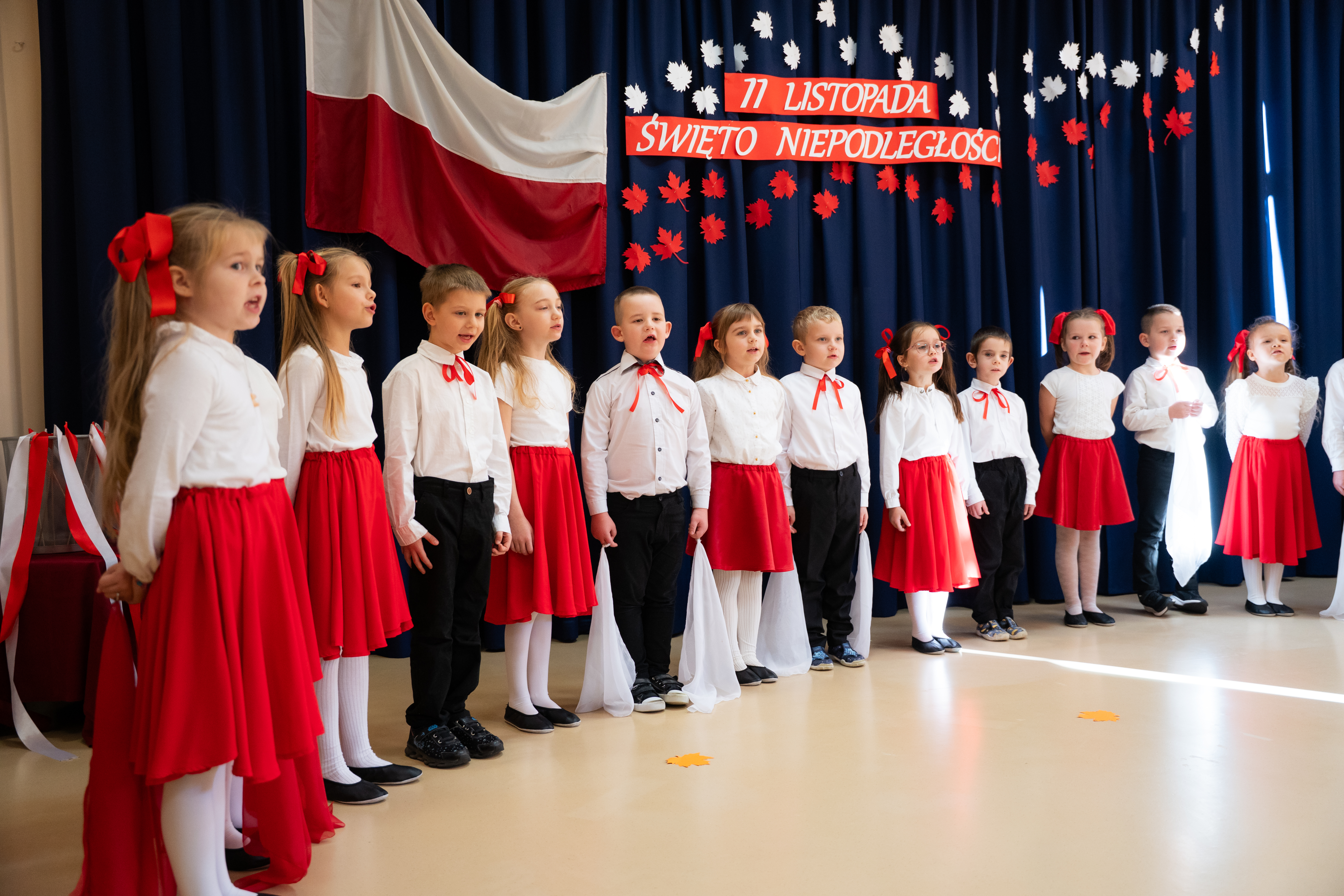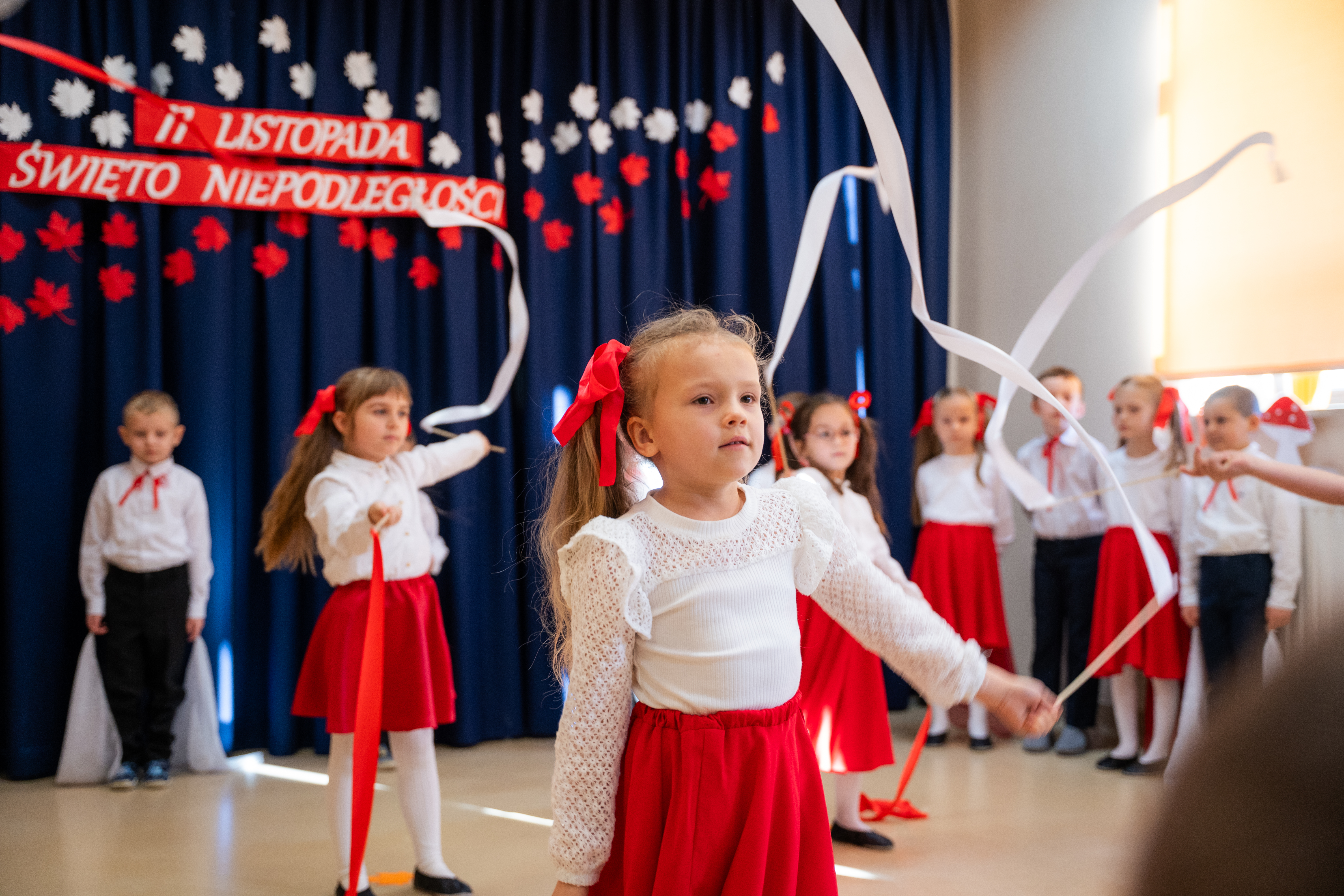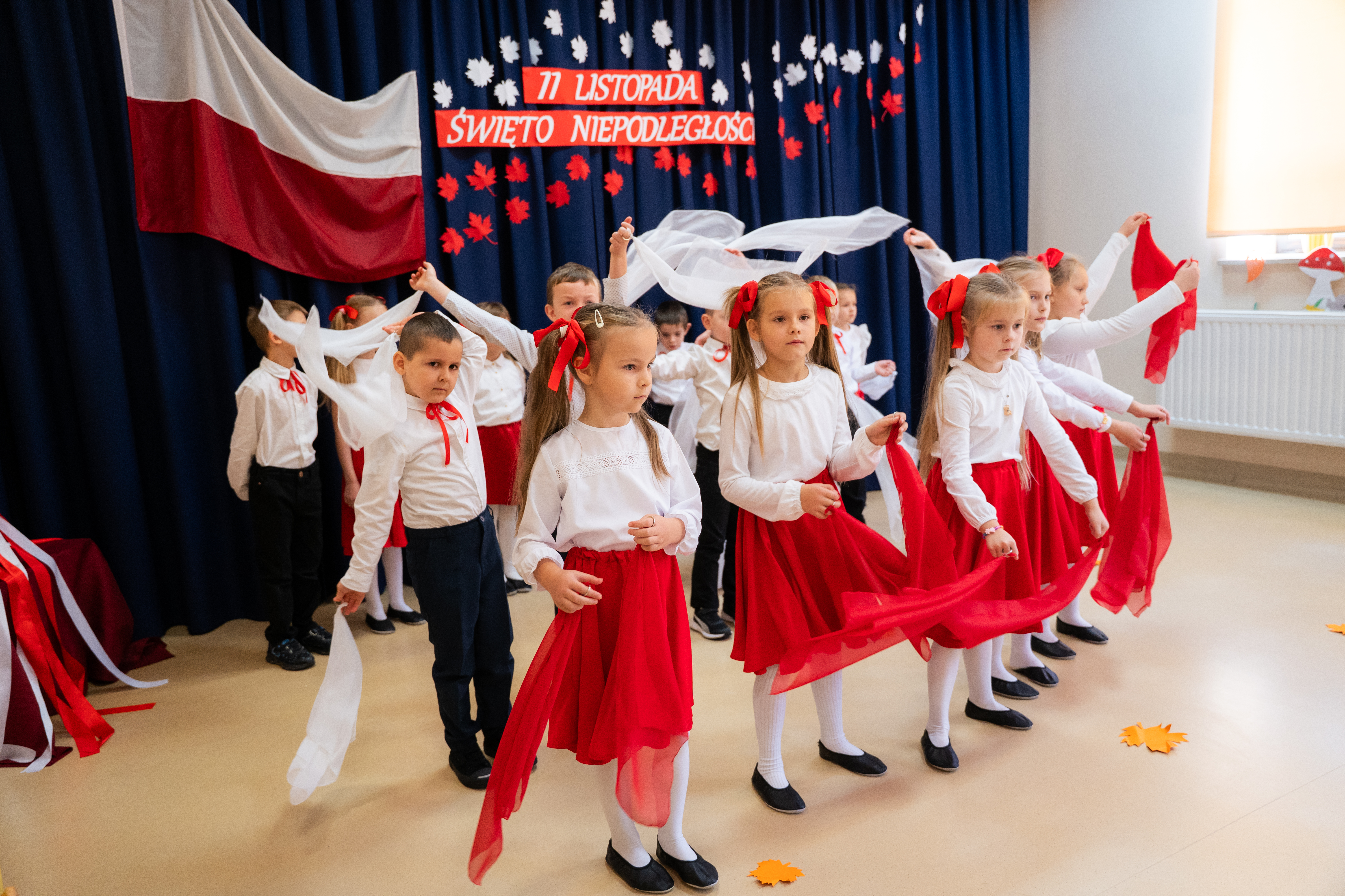 Dnia 7 listopada 2025 r. dzieci z grupy "Słoneczka" zaprezentowały montaż słowno-muzyczny upamiętniający dzień odzyskania przez Polskę NIepodległości. Podczas występu odśpiewano również wspólnie hymn "Mazurek Dąbrowskiego".