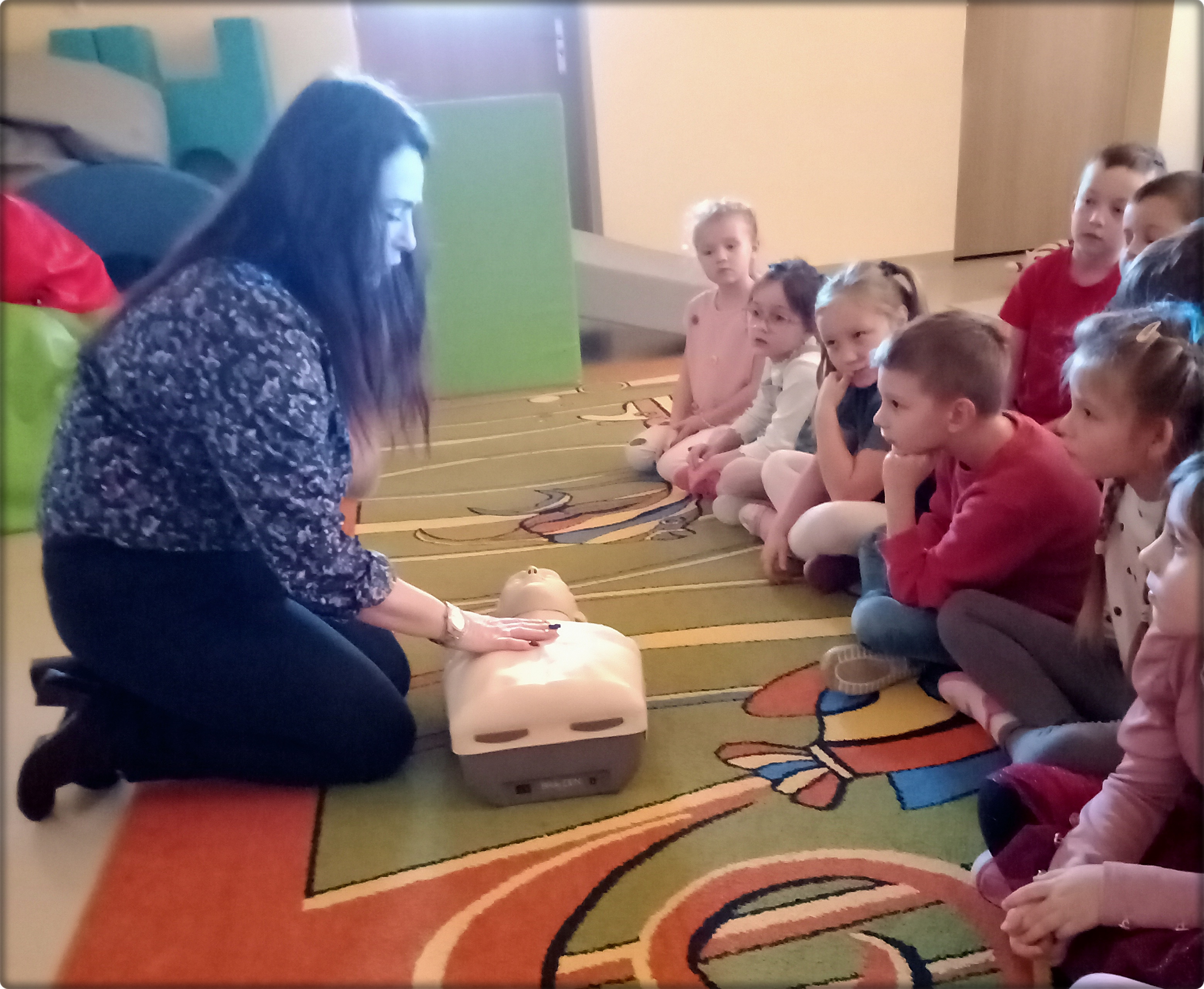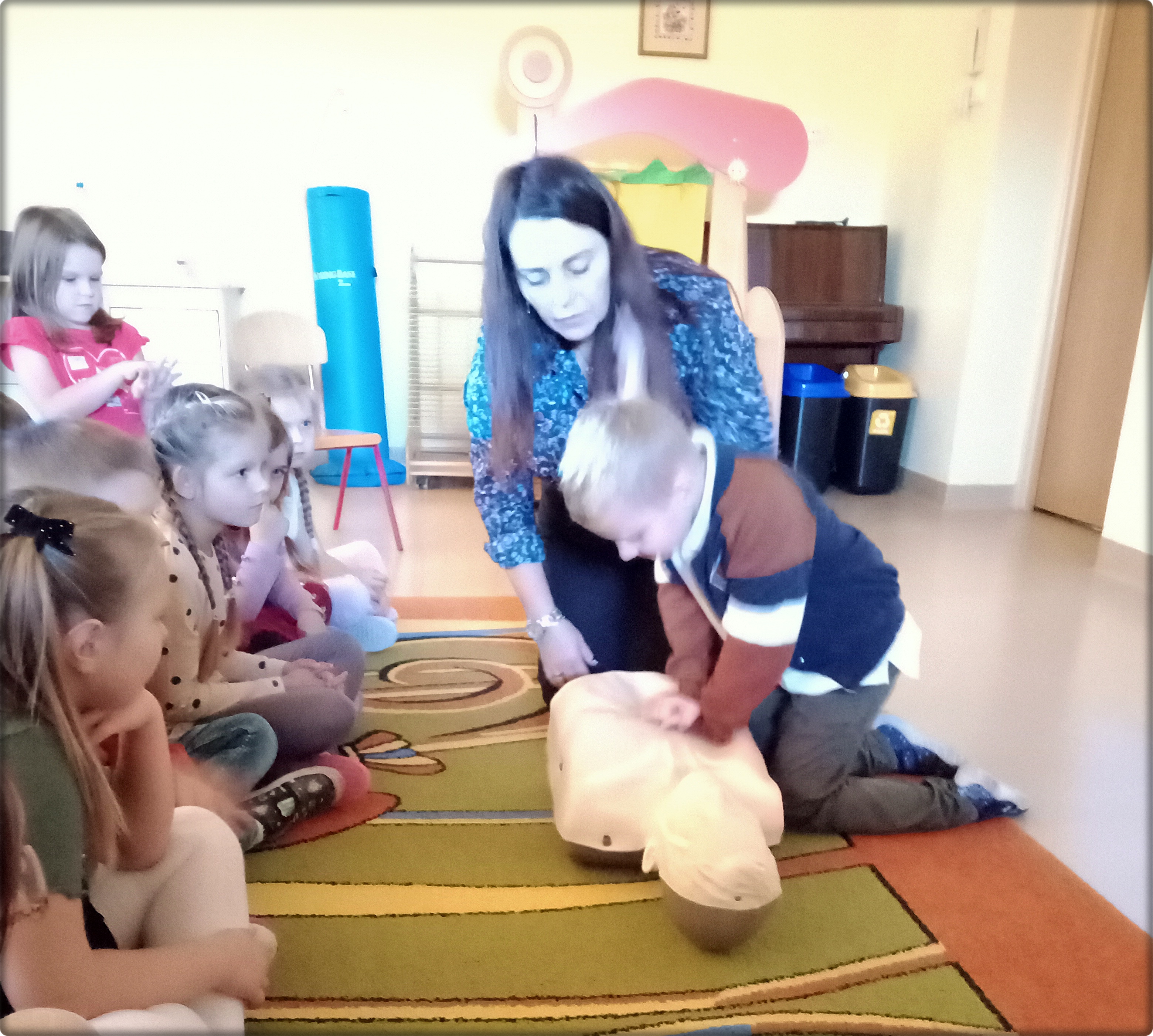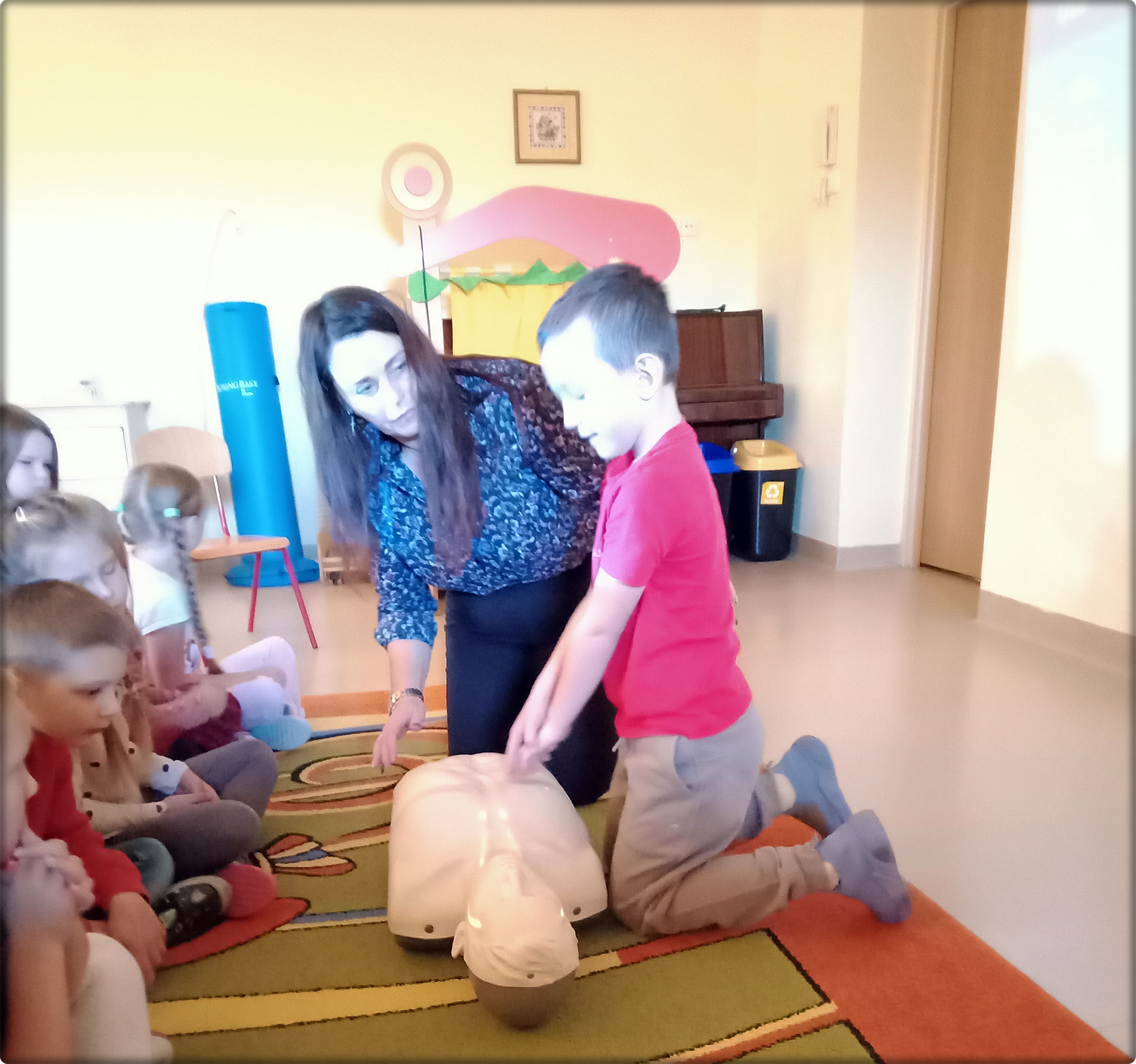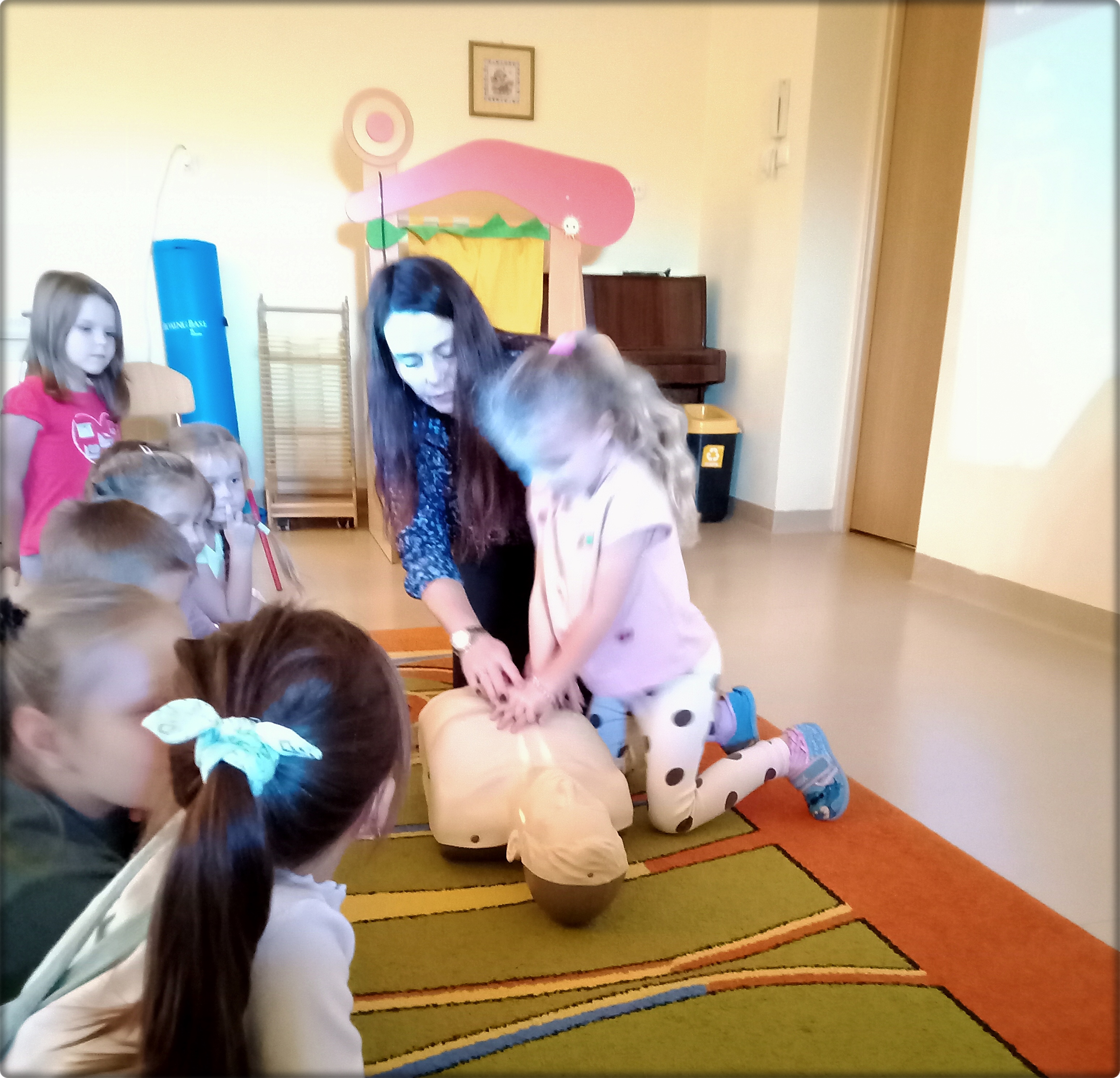 Dnia 31 października dzieci uczestniczyły w cyklu zajęć edukacyjnych z zakresu udzielania pierwszej pomocy przedmedycznej, które miały na celu kształtowanie pozytywnych i bezpiecznych postaw. Przedszkolaki dowiedziały się w jaki sposób udziela się pierwszej pomocy, jak pomóc poszkodowanym zanim przyjedzie pogotowie ratunkowe. Nauczyły się podstawowych numerów alarmowych oraz jak wezwać pomoc przez telefon. Następnie przedszkolaki przystąpiły do zadań praktycznych, gdzie uczyły się układać poszkodowanego w pozycję boczną oraz uczyły się masażu serca na fantomie. Wiadomości na ten temat utrwaliły poprzez krótki film instruktażowy. Zdobyta wiedza i ćwiczenia praktyczne sprawiły, że dzieci poczuły się "małymi ratownikami".