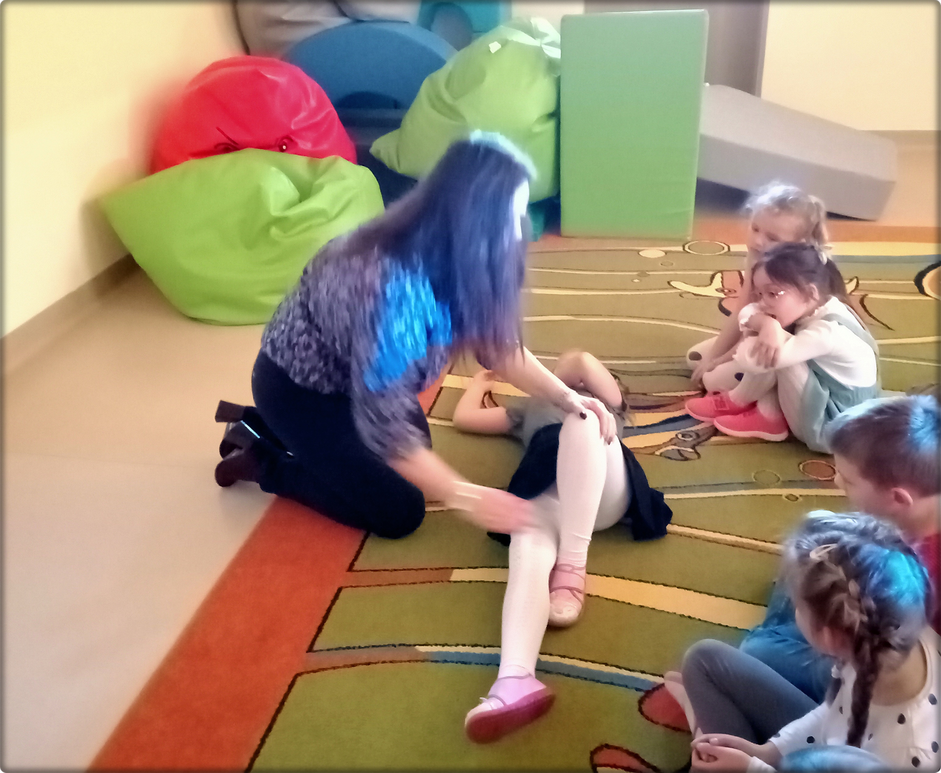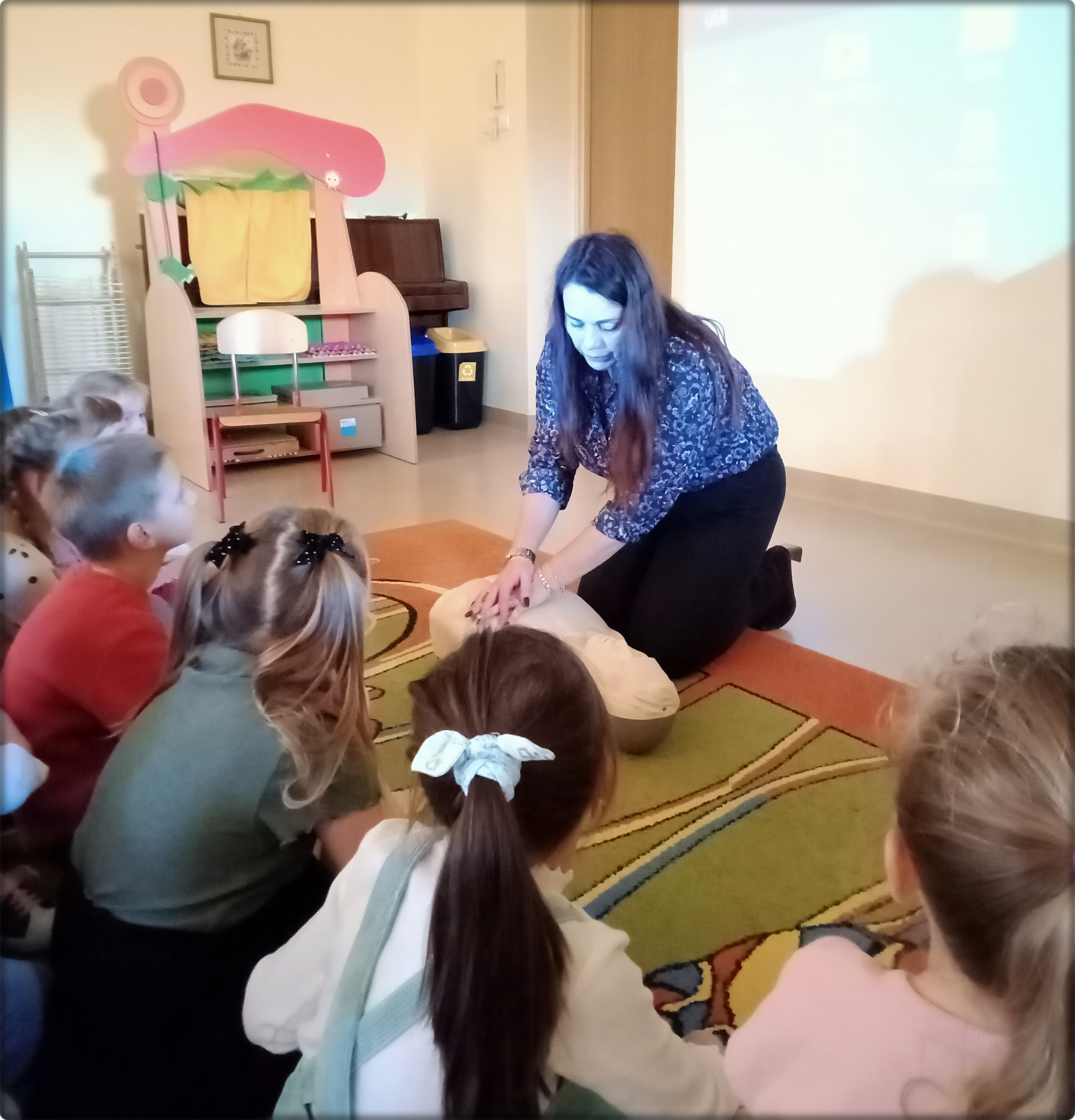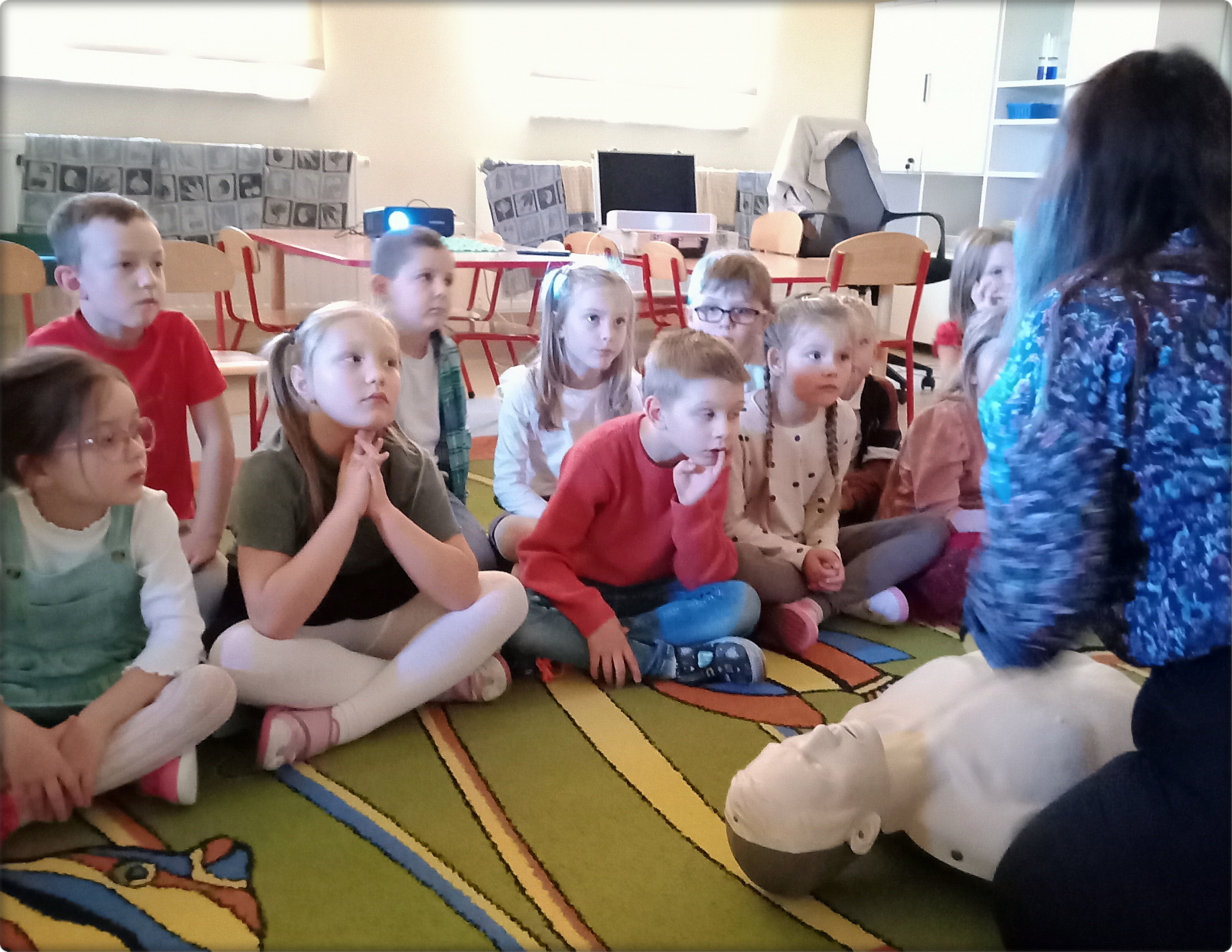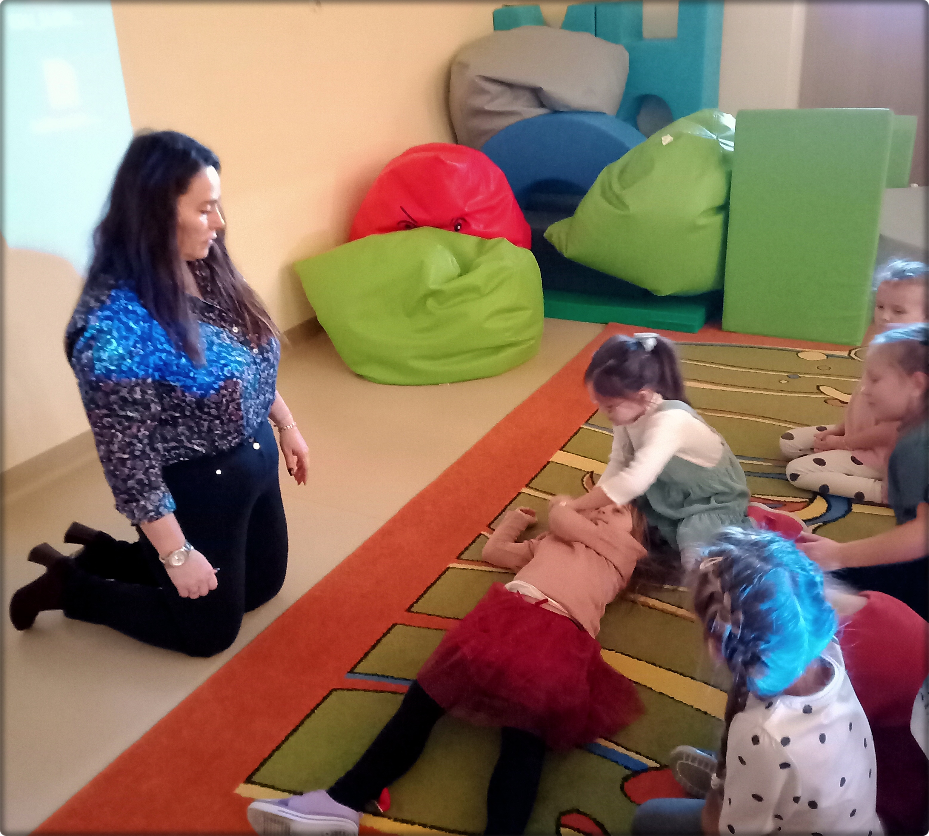 Dnia 31 października dzieci uczestniczyły w cyklu zajęć edukacyjnych z zakresu udzielania pierwszej pomocy przedmedycznej, które miały na celu kształtowanie pozytywnych i bezpiecznych postaw. Przedszkolaki dowiedziały się w jaki sposób udziela się pierwszej pomocy, jak pomóc poszkodowanym zanim przyjedzie pogotowie ratunkowe. Nauczyły się podstawowych numerów alarmowych oraz jak wezwać pomoc przez telefon. Następnie przedszkolaki przystąpiły do zadań praktycznych, gdzie uczyły się układać poszkodowanego w pozycję boczną oraz uczyły się masażu serca na fantomie. Wiadomości na ten temat utrwaliły poprzez krótki film instruktażowy. Zdobyta wiedza i ćwiczenia praktyczne sprawiły, że dzieci poczuły się "małymi ratownikami".