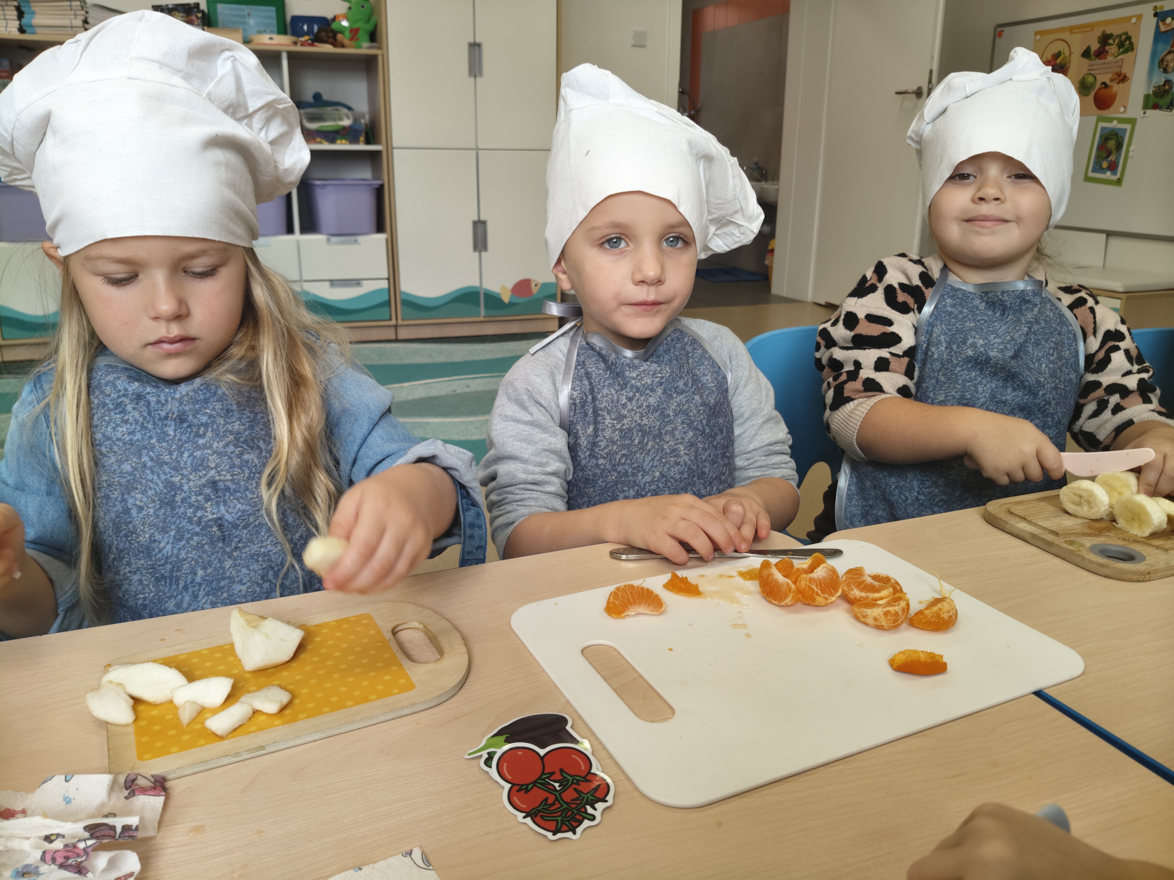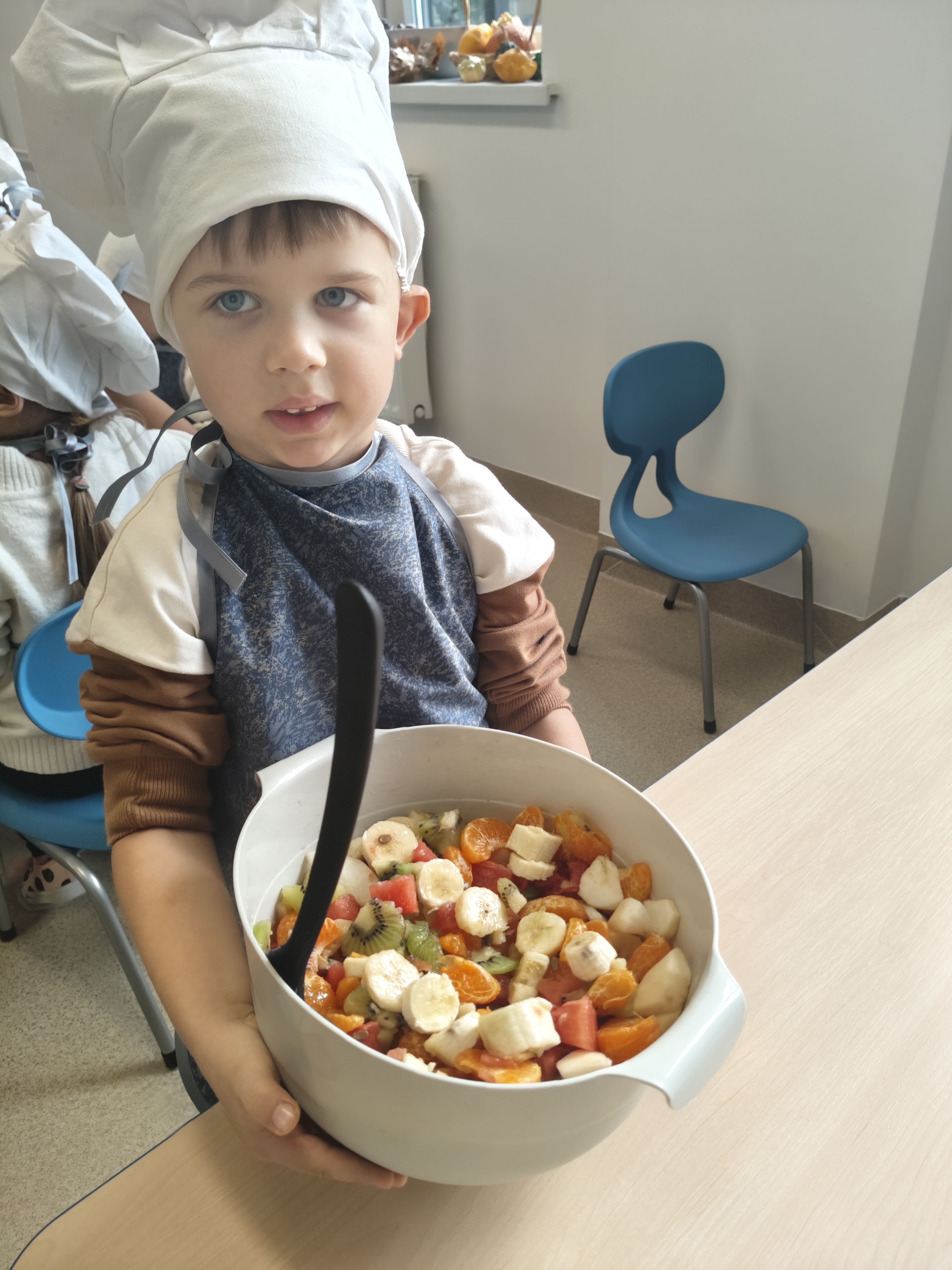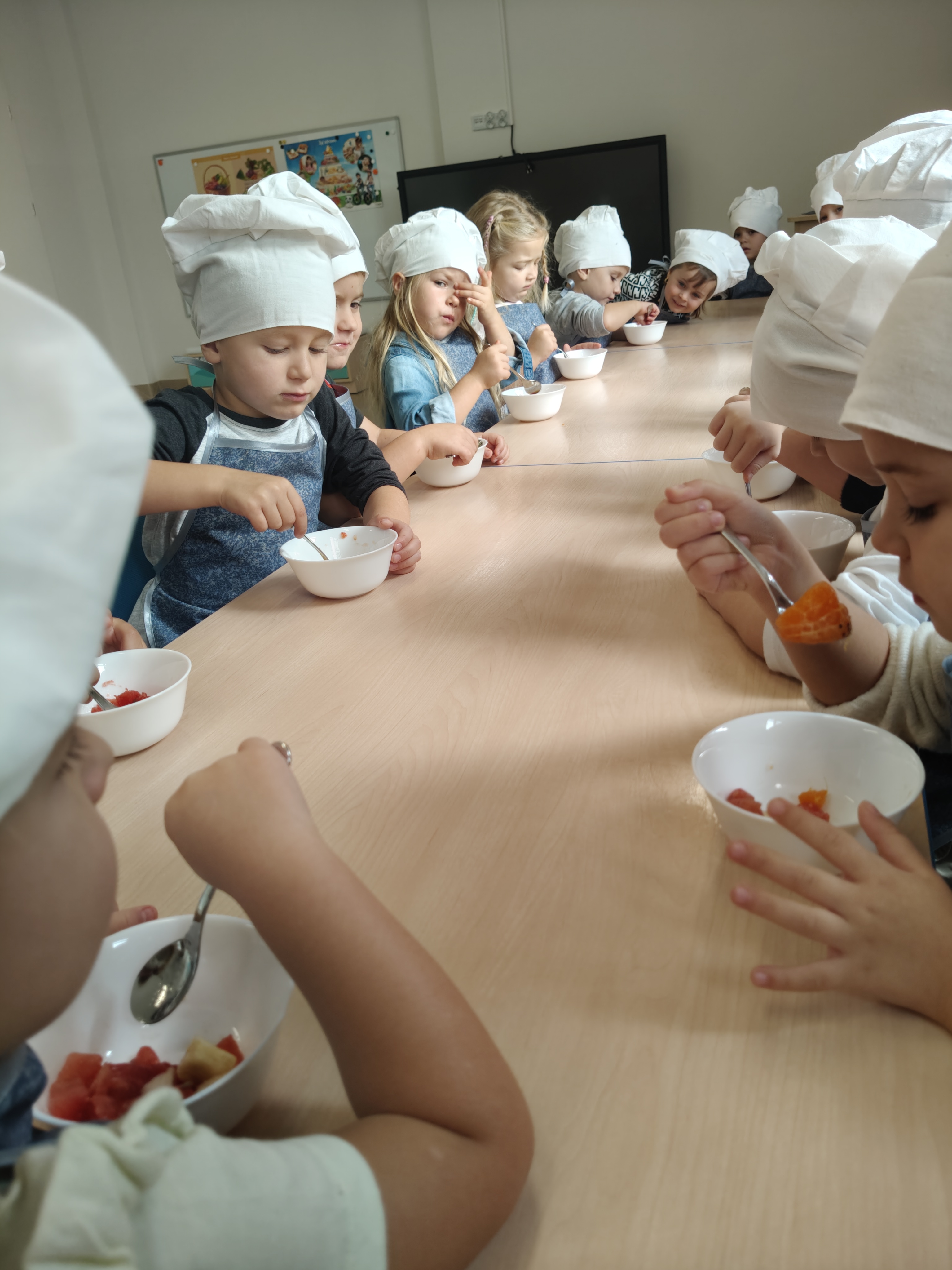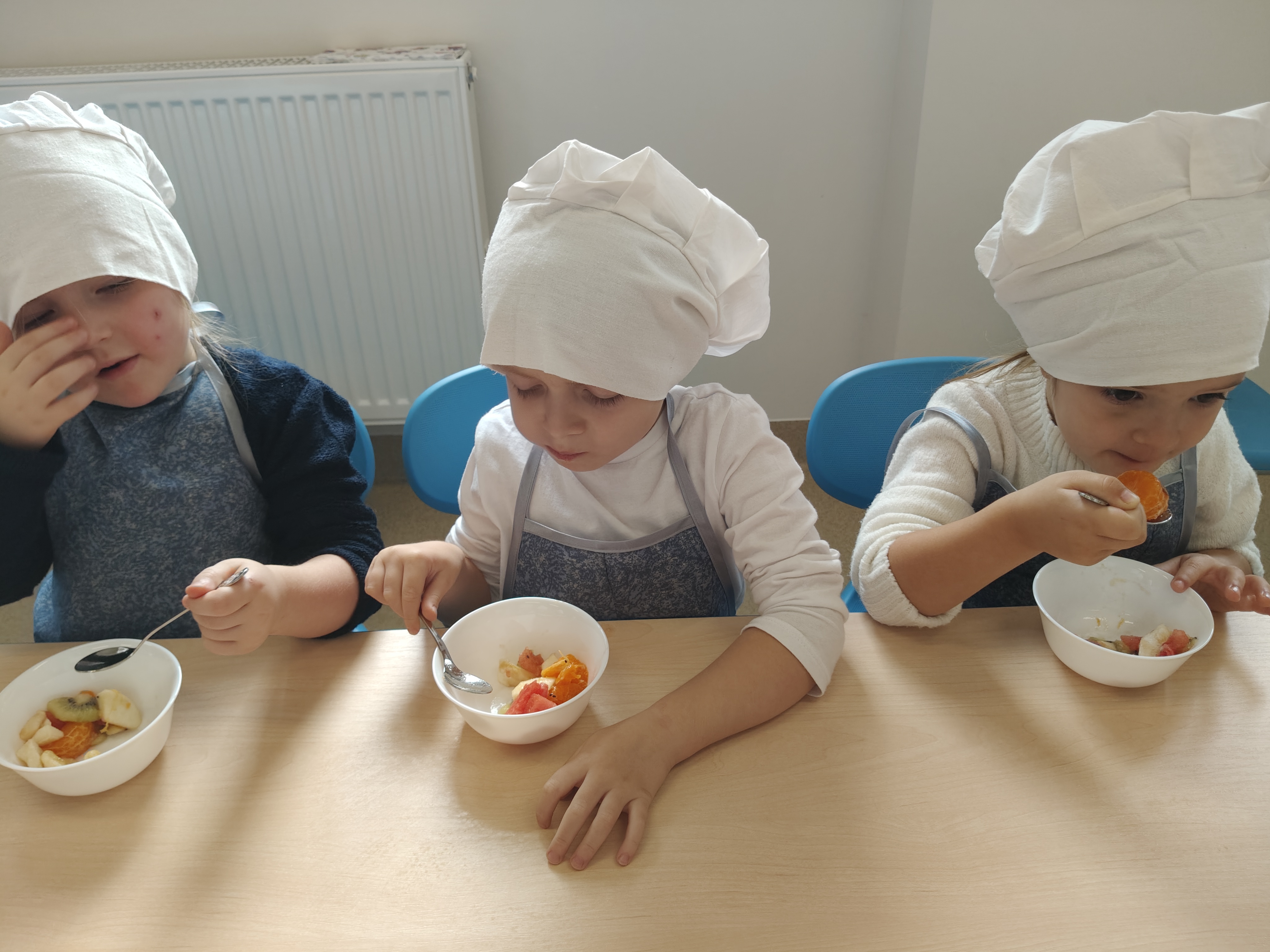 Rybki samodzielnie przygotowały pyszną, kolorową i witaminową sałatkę owocową. Wszyscy mieli soczyste minki na widok tak smakowitych owoców i każdy ochoczo zabrał się do pracy. Przed przystąpieniem do pracy dzieci dokładnie umyły ręce, pamiętając o zasadach higieny. Założyły fartuszki oraz czapki na głowę wcielając się w rolę kucharzy. Przedszkolaki pokazały, że potrafią bezpiecznie posługiwać się nożem podczas krojenia owoców na małe kawałki. Degustacja sałatki owocowej była bardzo przyjemna.