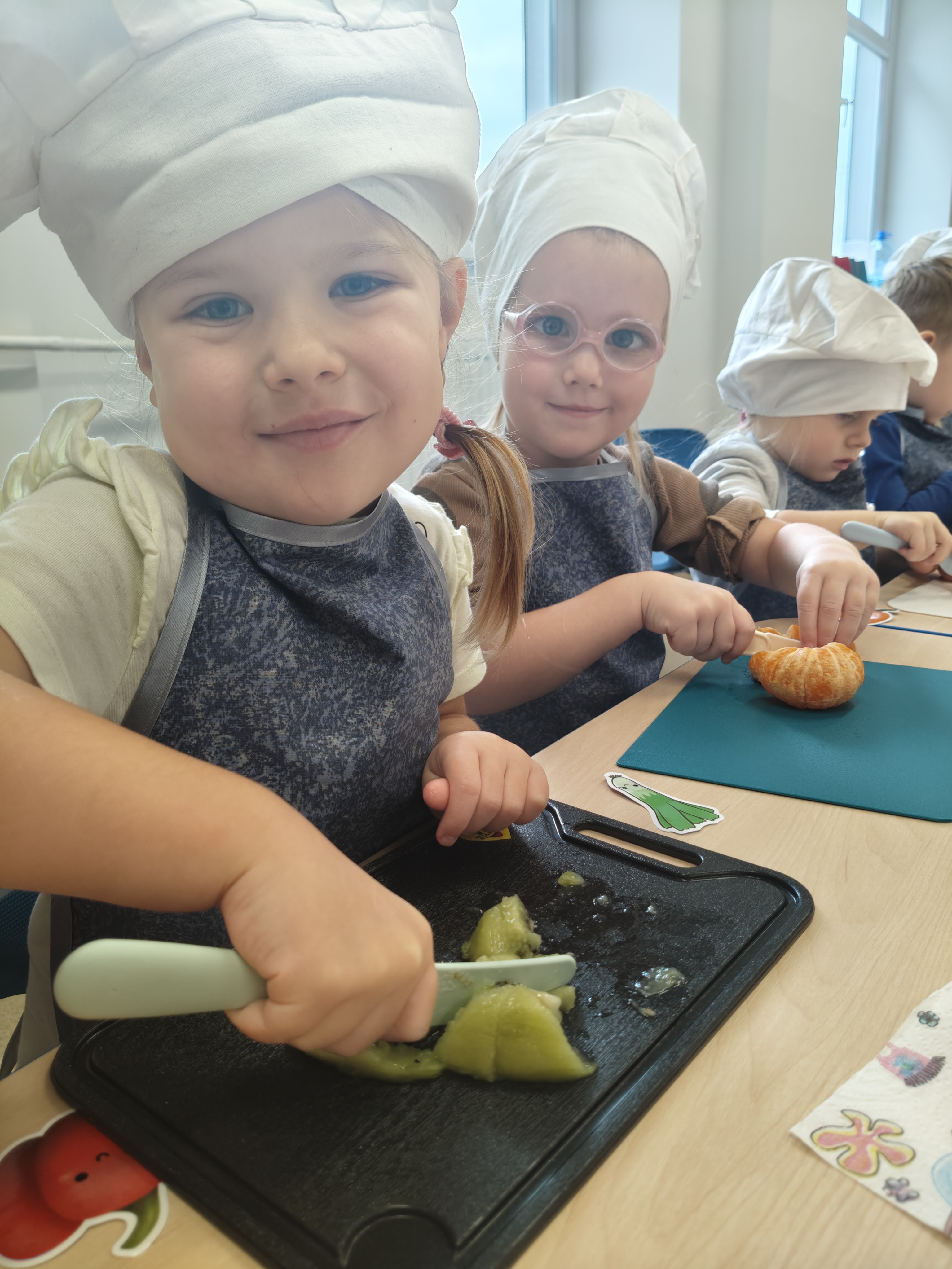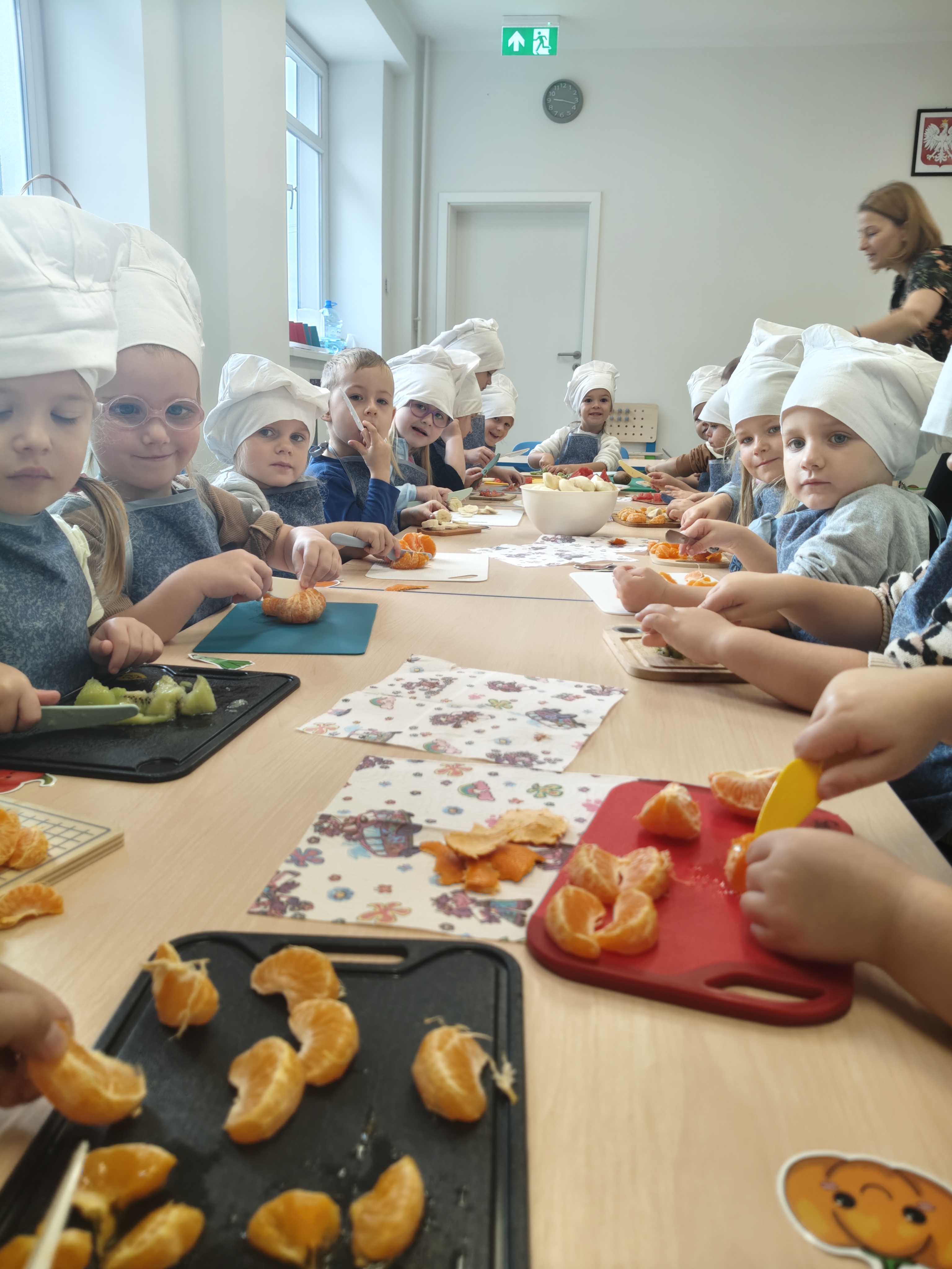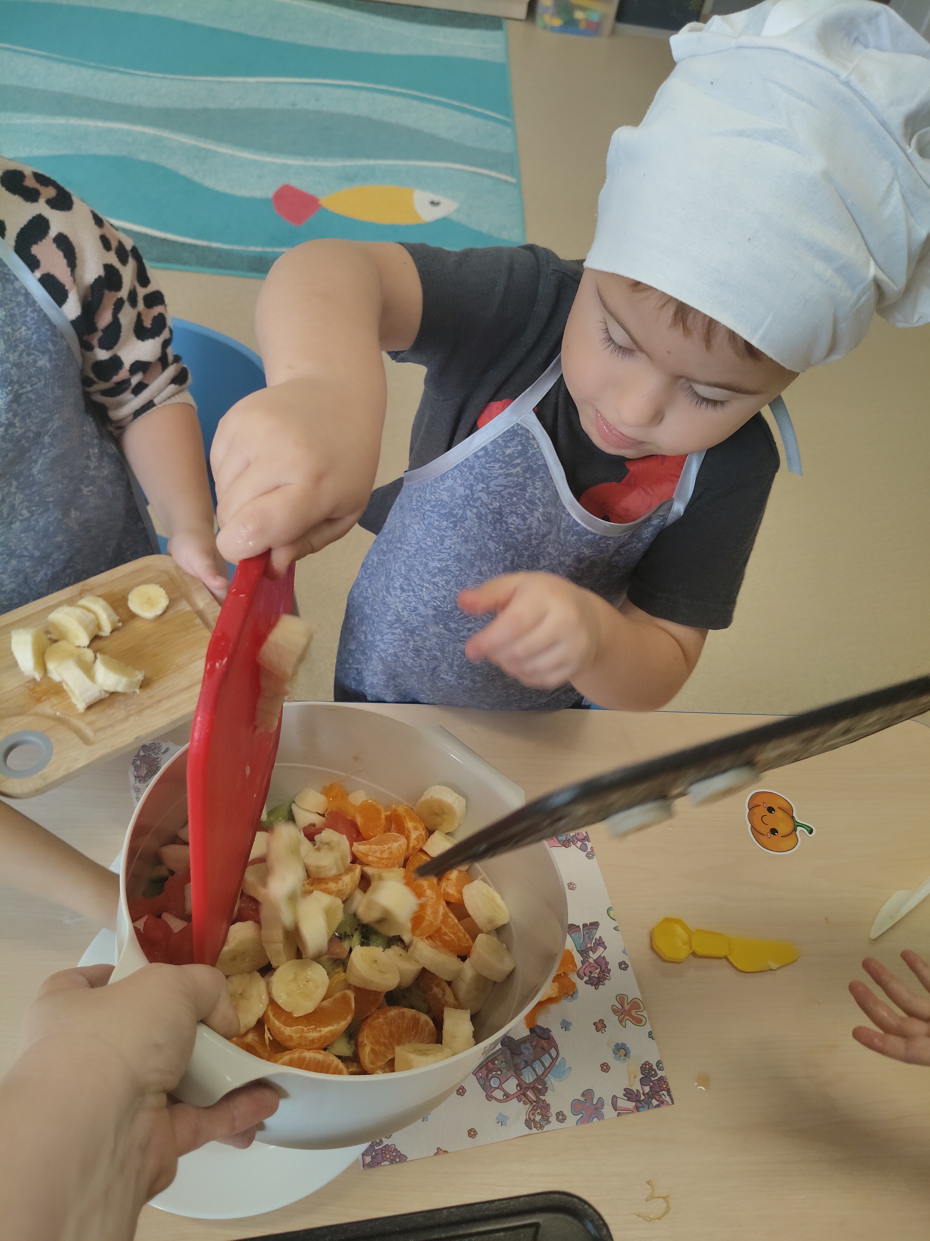 Rybki samodzielnie przygotowały pyszną, kolorową i witaminową sałatkę owocową. Wszyscy mieli soczyste minki na widok tak smakowitych owoców i każdy ochoczo zabrał się do pracy. Przed przystąpieniem do pracy dzieci dokładnie umyły ręce, pamiętając o zasadach higieny. Założyły fartuszki oraz czapki na głowę wcielając się w rolę kucharzy. Przedszkolaki pokazały, że potrafią bezpiecznie posługiwać się nożem podczas krojenia owoców na małe kawałki. Degustacja sałatki owocowej była bardzo przyjemna.