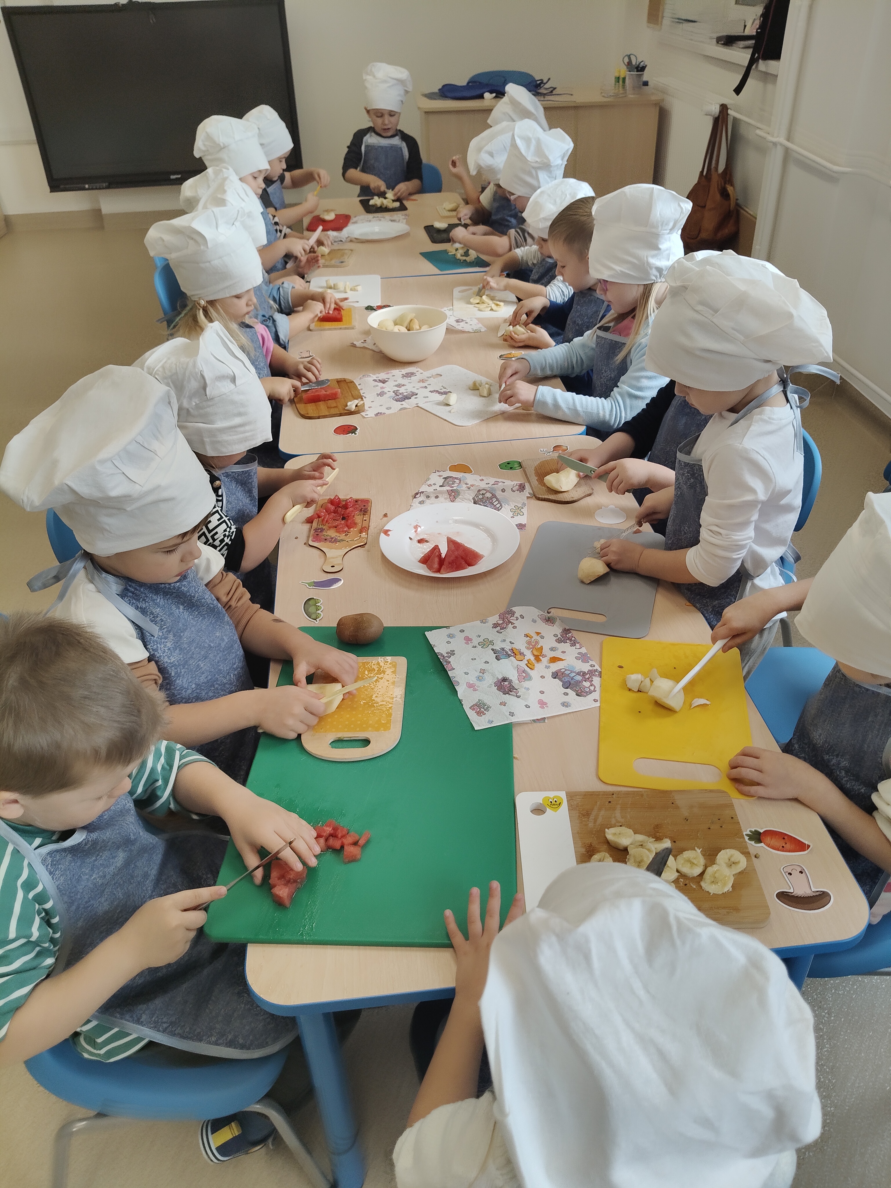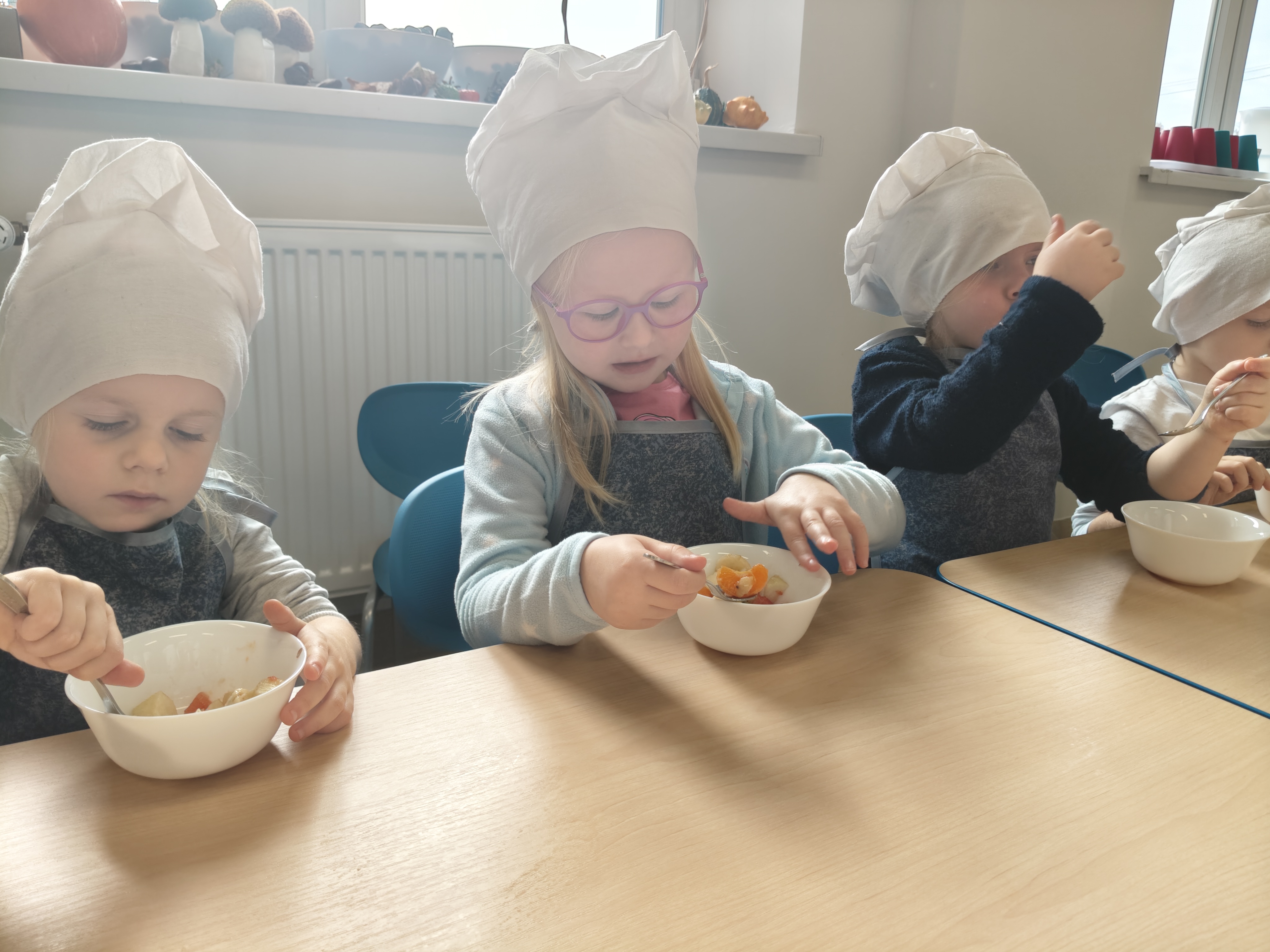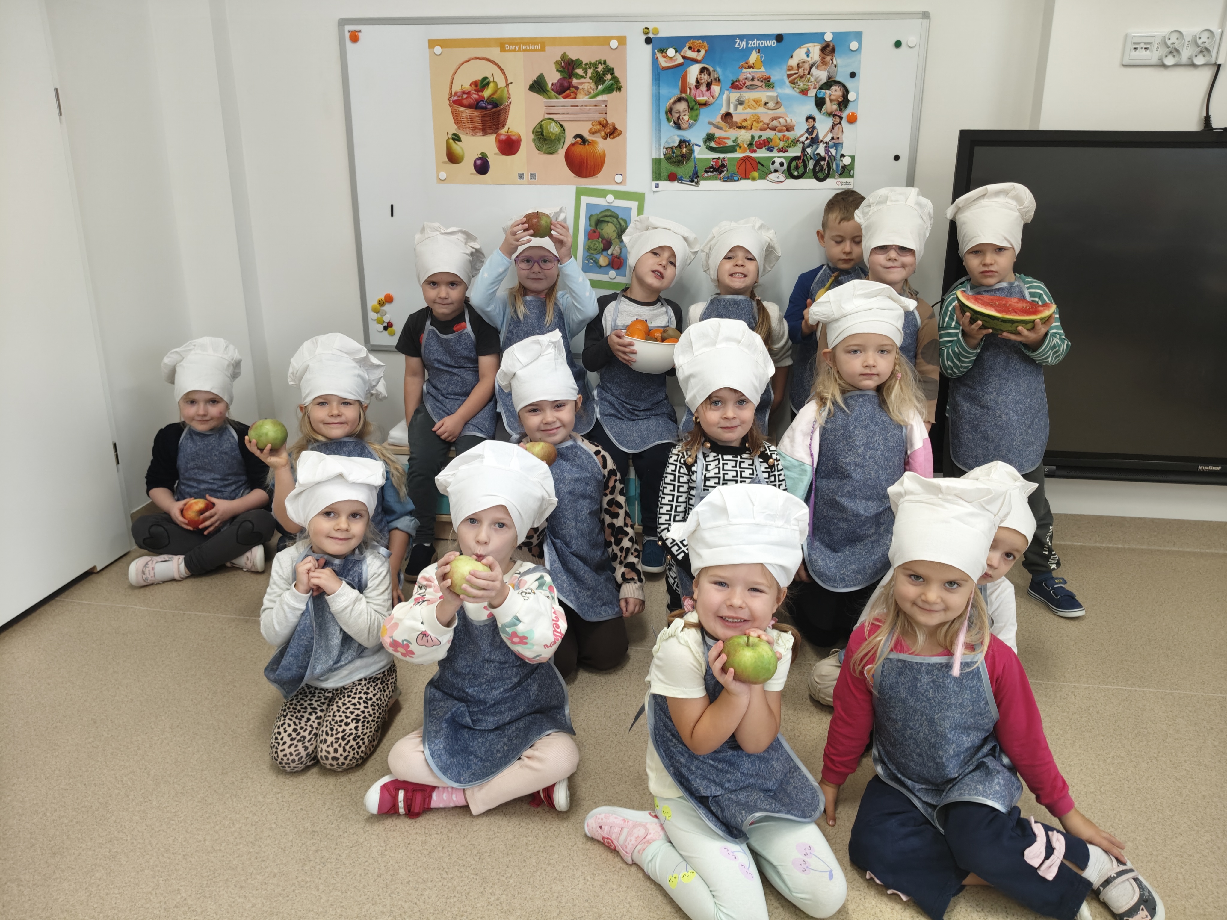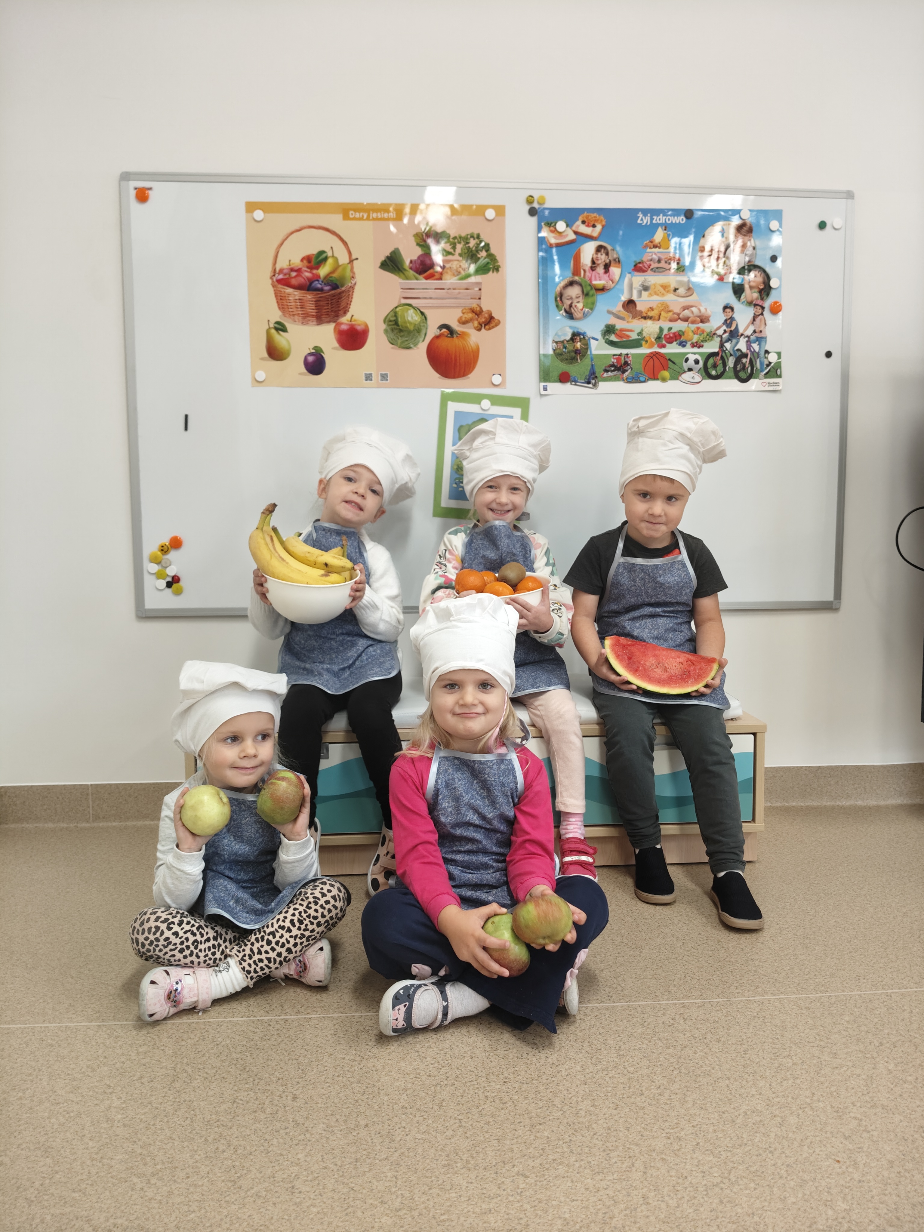 Rybki samodzielnie przygotowały pyszną, kolorową i witaminową sałatkę owocową. Wszyscy mieli soczyste minki na widok tak smakowitych owoców i każdy ochoczo zabrał się do pracy. Przed przystąpieniem do pracy dzieci dokładnie umyły ręce, pamiętając o zasadach higieny. Założyły fartuszki oraz czapki na głowę wcielając się w rolę kucharzy. Przedszkolaki pokazały, że potrafią bezpiecznie posługiwać się nożem podczas krojenia owoców na małe kawałki. Degustacja sałatki owocowej była bardzo przyjemna.