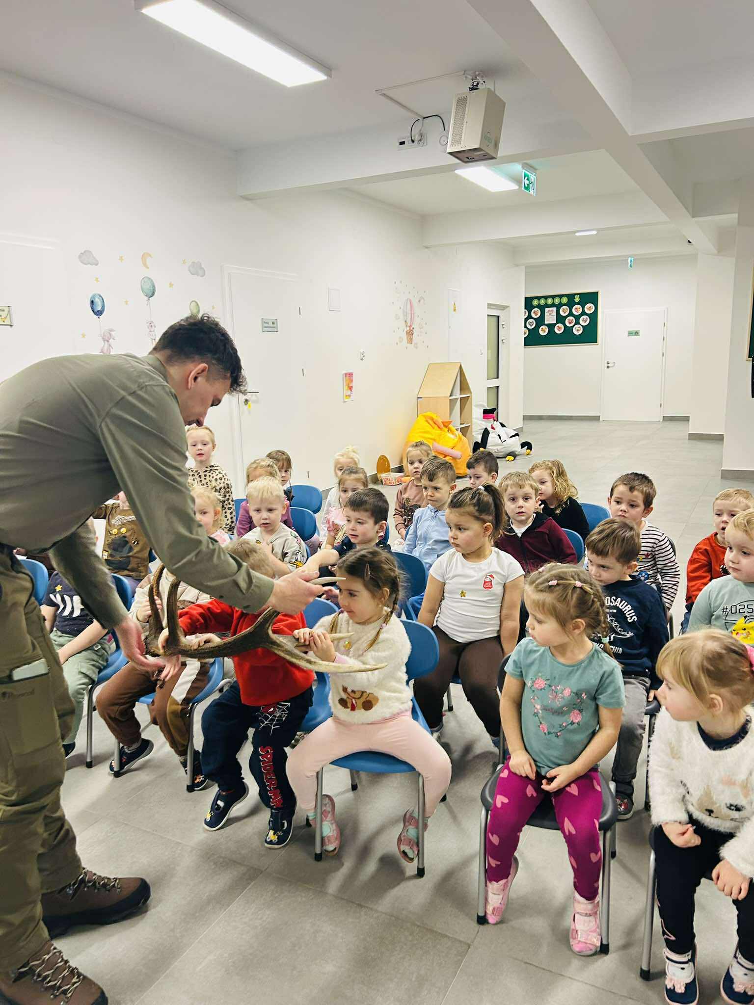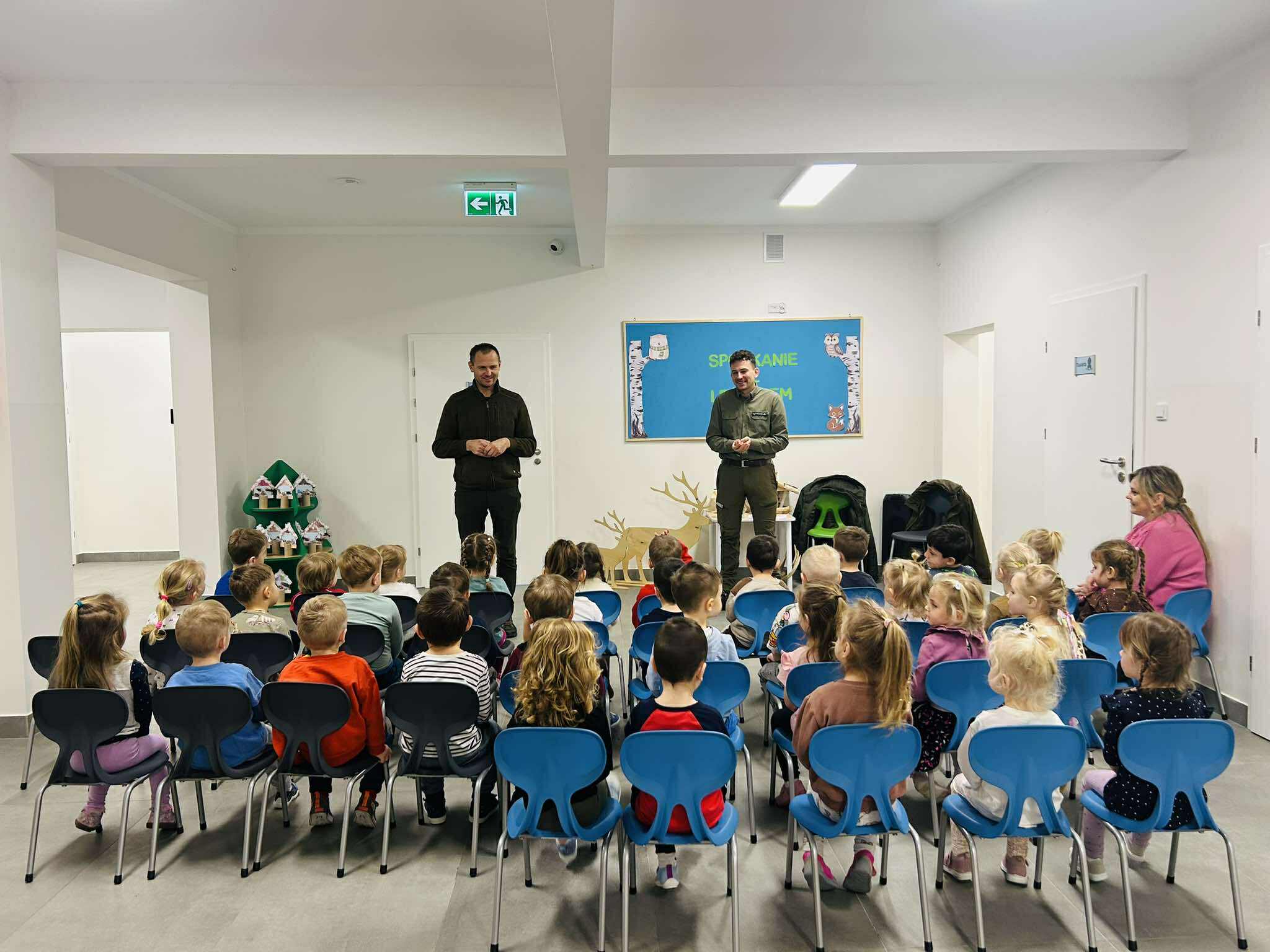 Dnia 29 stycznia do naszego przedszkola zawitali leśnicy. Celem tego spotkania było zapoznanie dzieci z pracą leśnika i środowiskiem leśnym. Na początku spotkania goście zaprezentowali dzieciom swój mundur. W dalszej części dzieci poznały zwierzęta leśne i ich warunki życia. Panowie zainteresowali dzieci swoimi opowieściami o zwierzętach i ptakach. Podczas spotkania pobudzone był również zmysły zapachu i dotyku podczas oglądania poroża oraz kuli tłuszczowych dla ptaków. Na koniec spotkania dzieci miały możliwość zadawania pytań. Dzięki tym zajęciom dzieci poszerzyły wiadomości o lesie i jego mieszkańcach, nauczyły się jak należy pomagać zwierzętom zimą. Na pamiątkę tego interesującego spotkania przedszkolaki otrzymały karmnik do ogrodu przedszkolnego oraz breloczki.