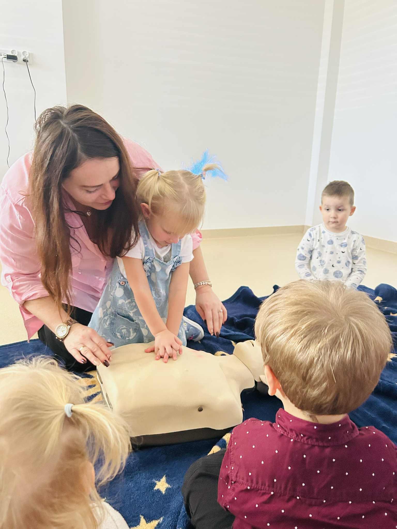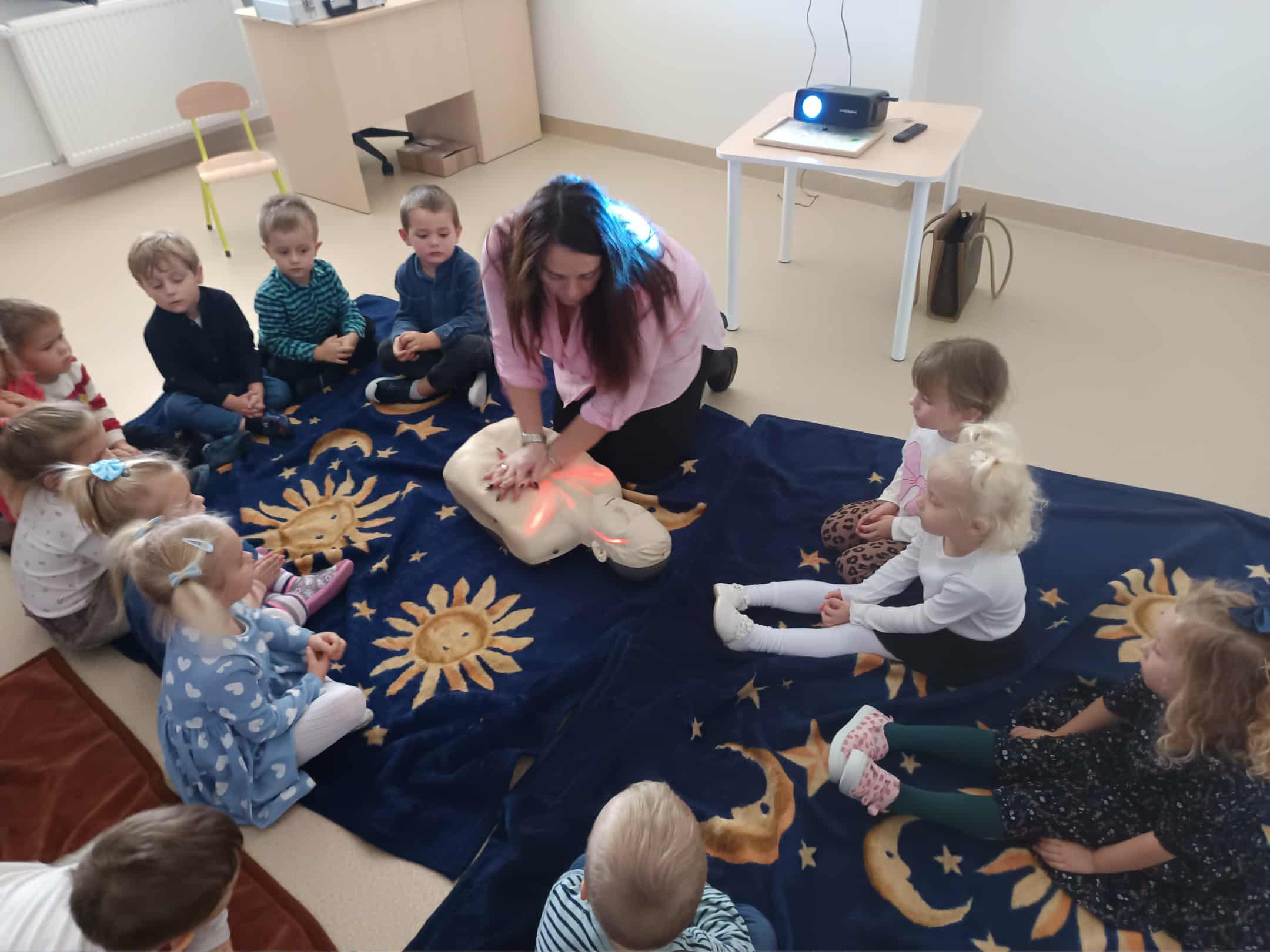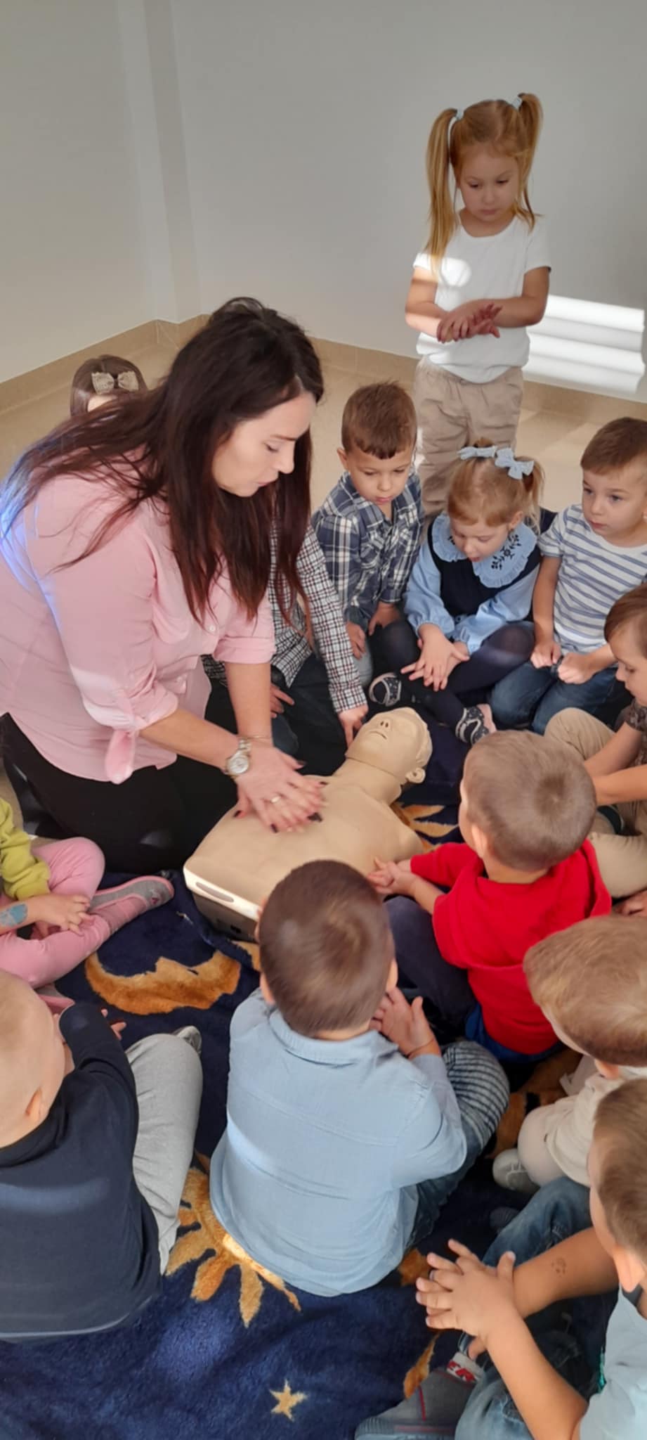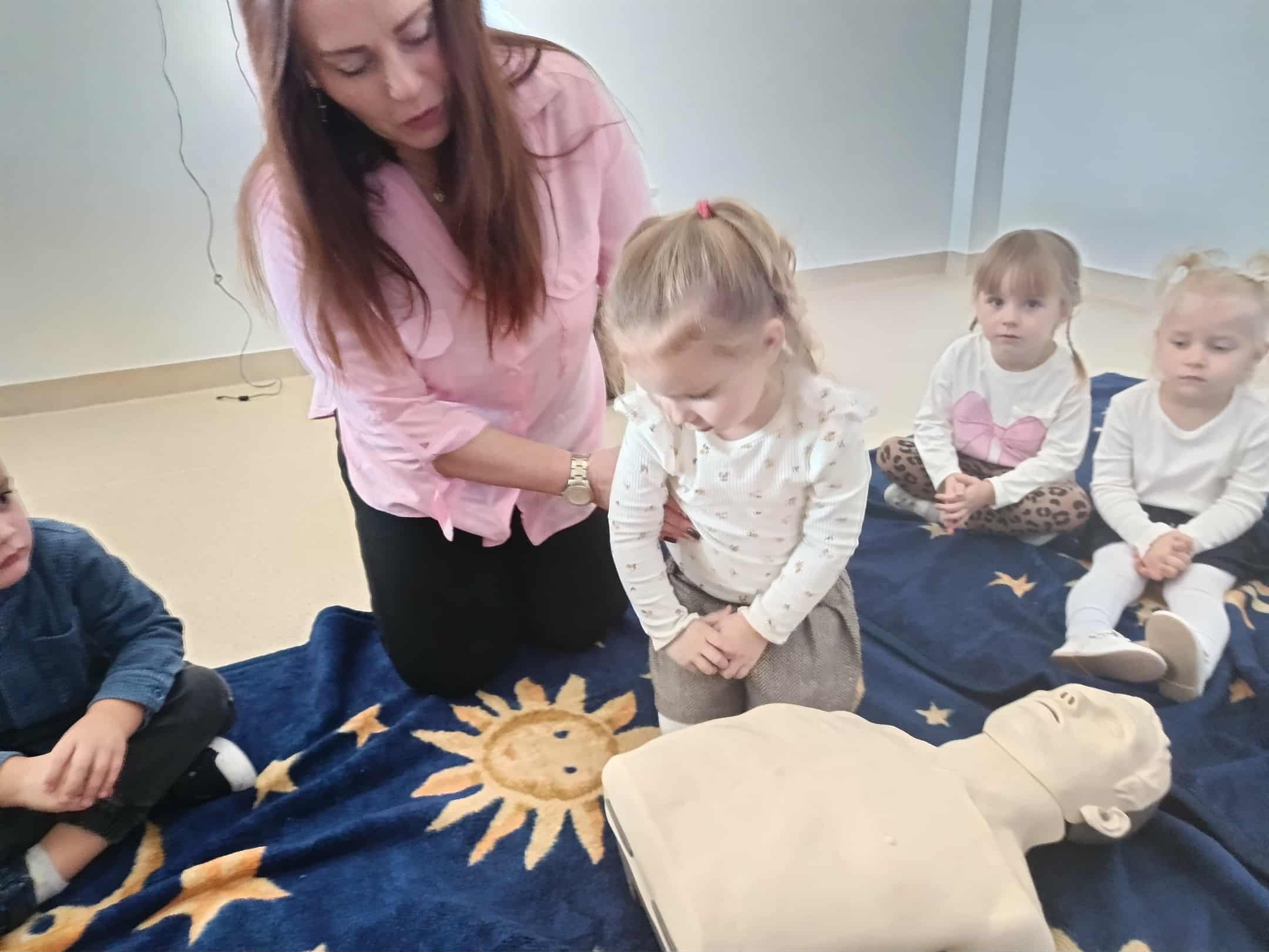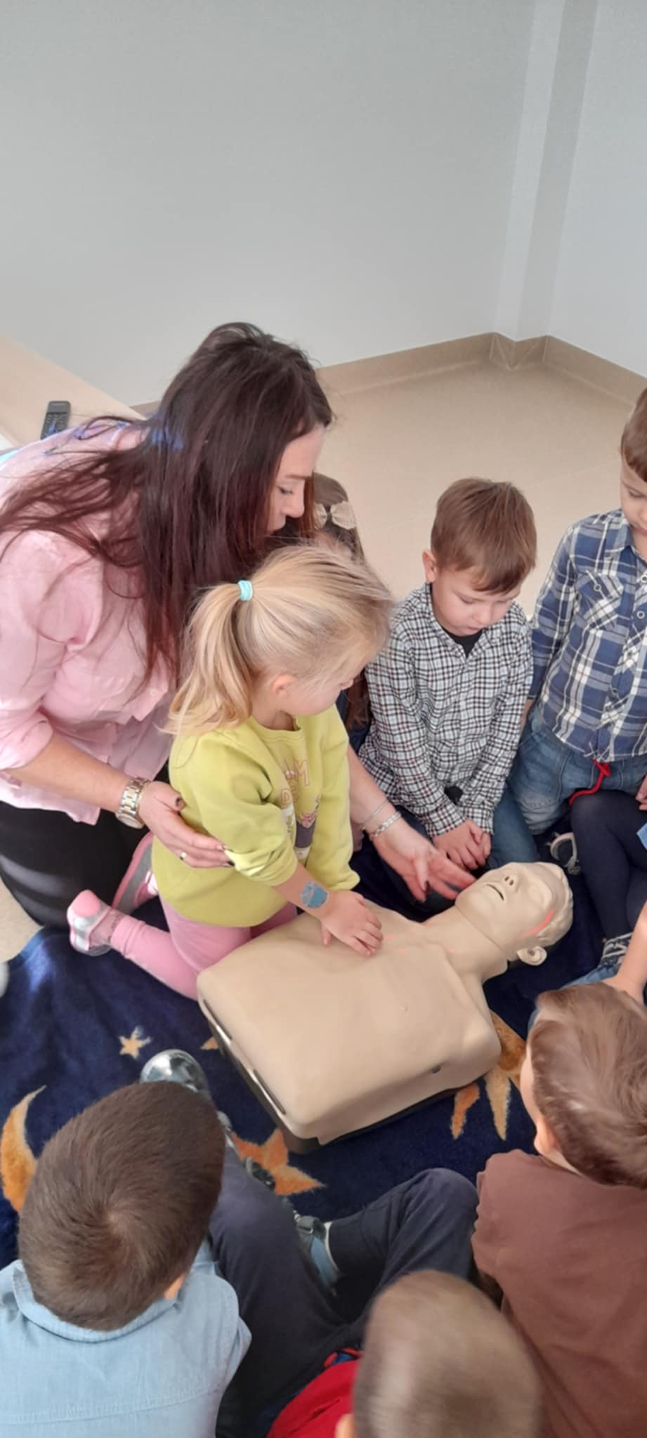 W dniach 30-31.10.2025 r. dzieci ze wszystkich grup wiekowych uczestniczyły w warsztatach z zakresu umiejętności udzielania pierwszej pomocy przedmedycznej. Poznawały ważne numery alarmowe, zasady wykonania resuscytacji czy pozycji bocznej ustalonej.