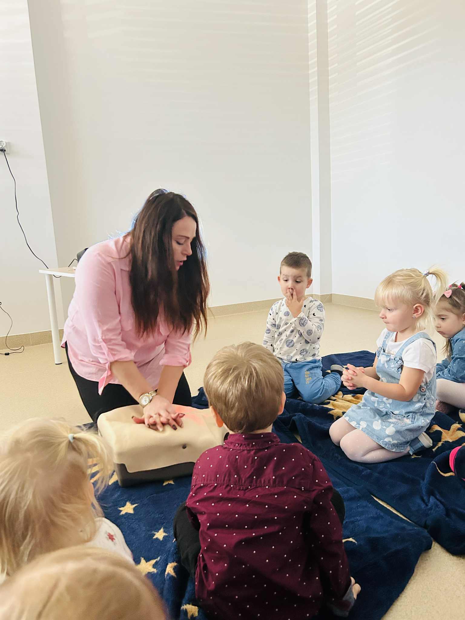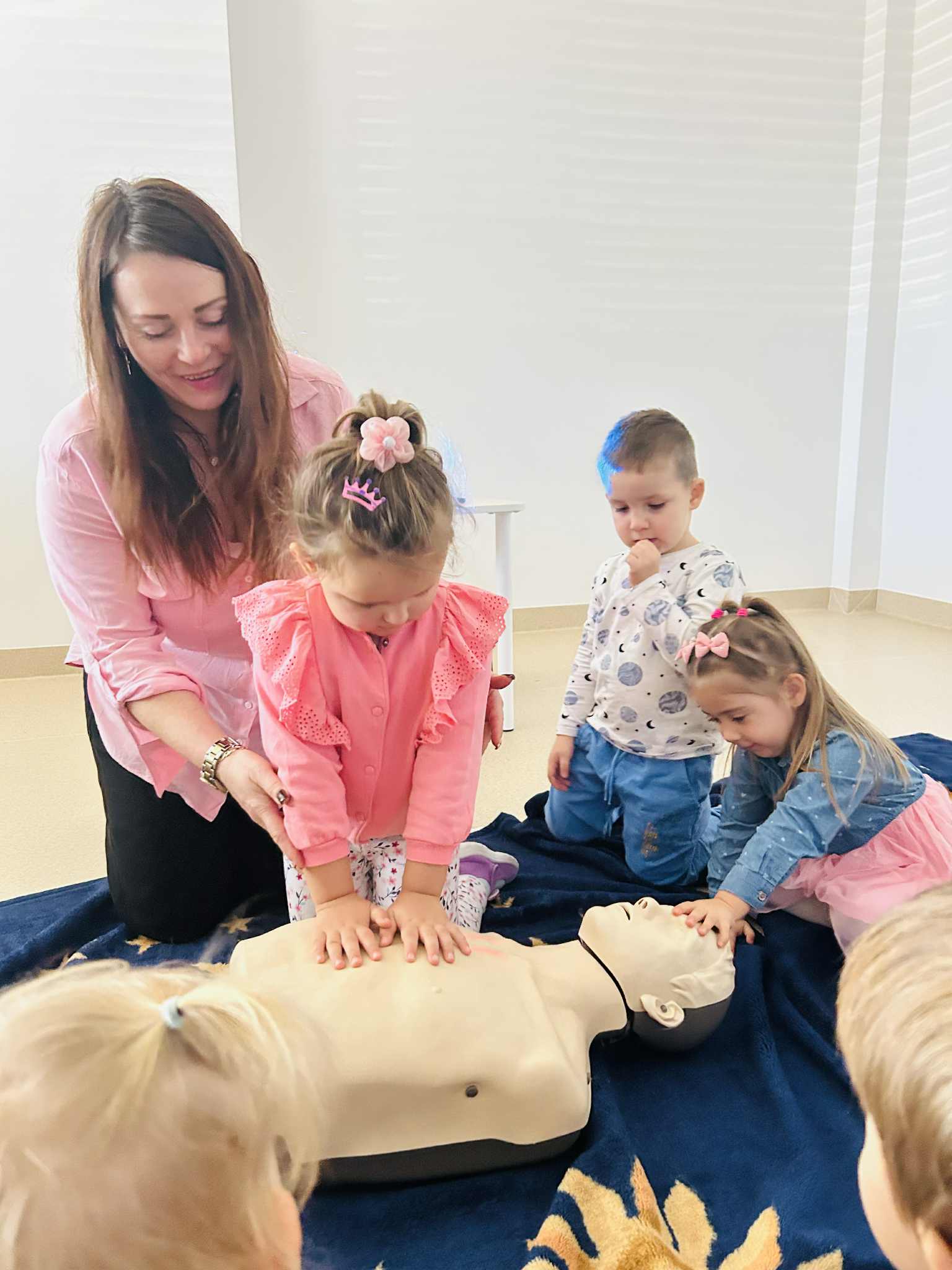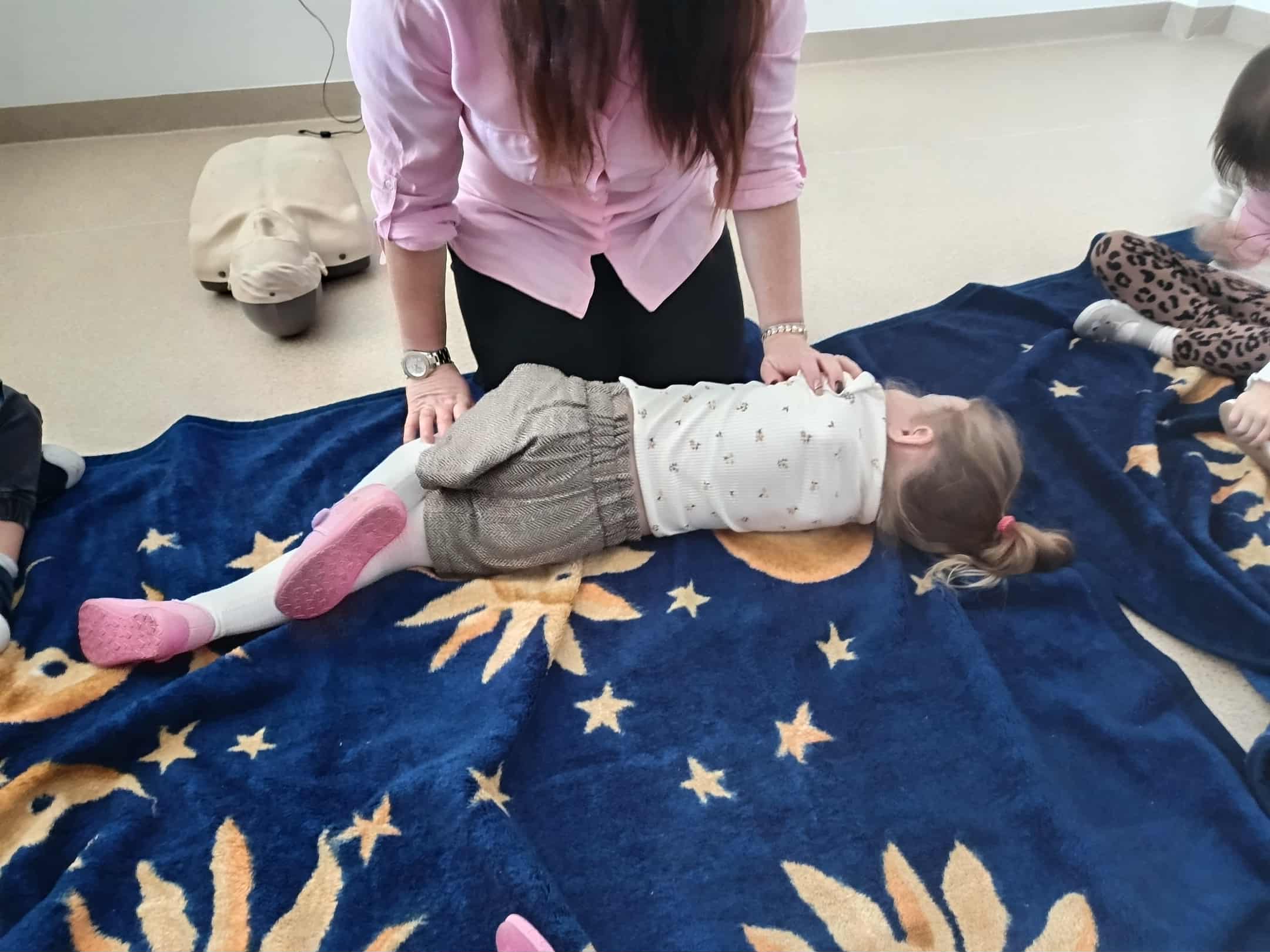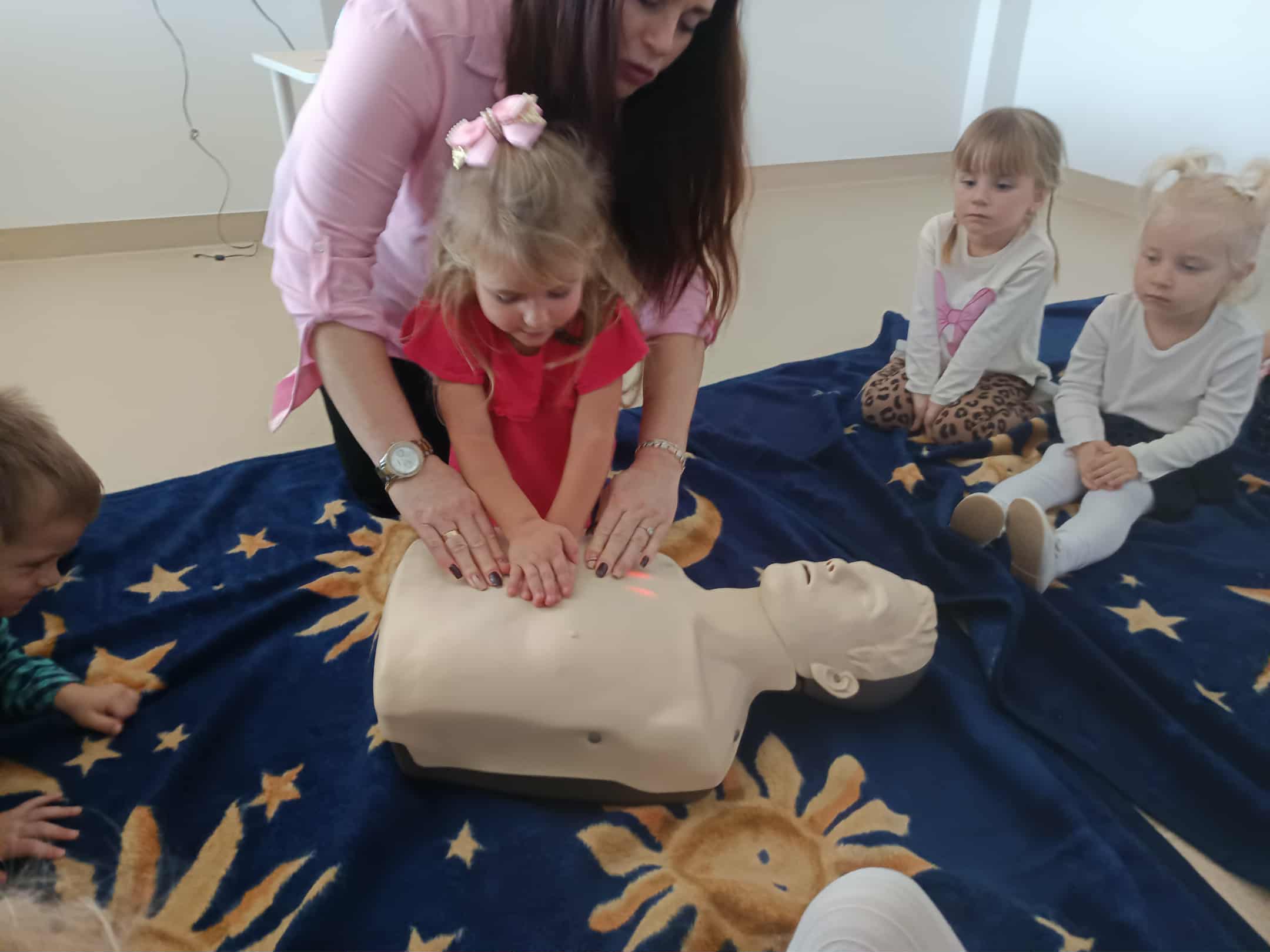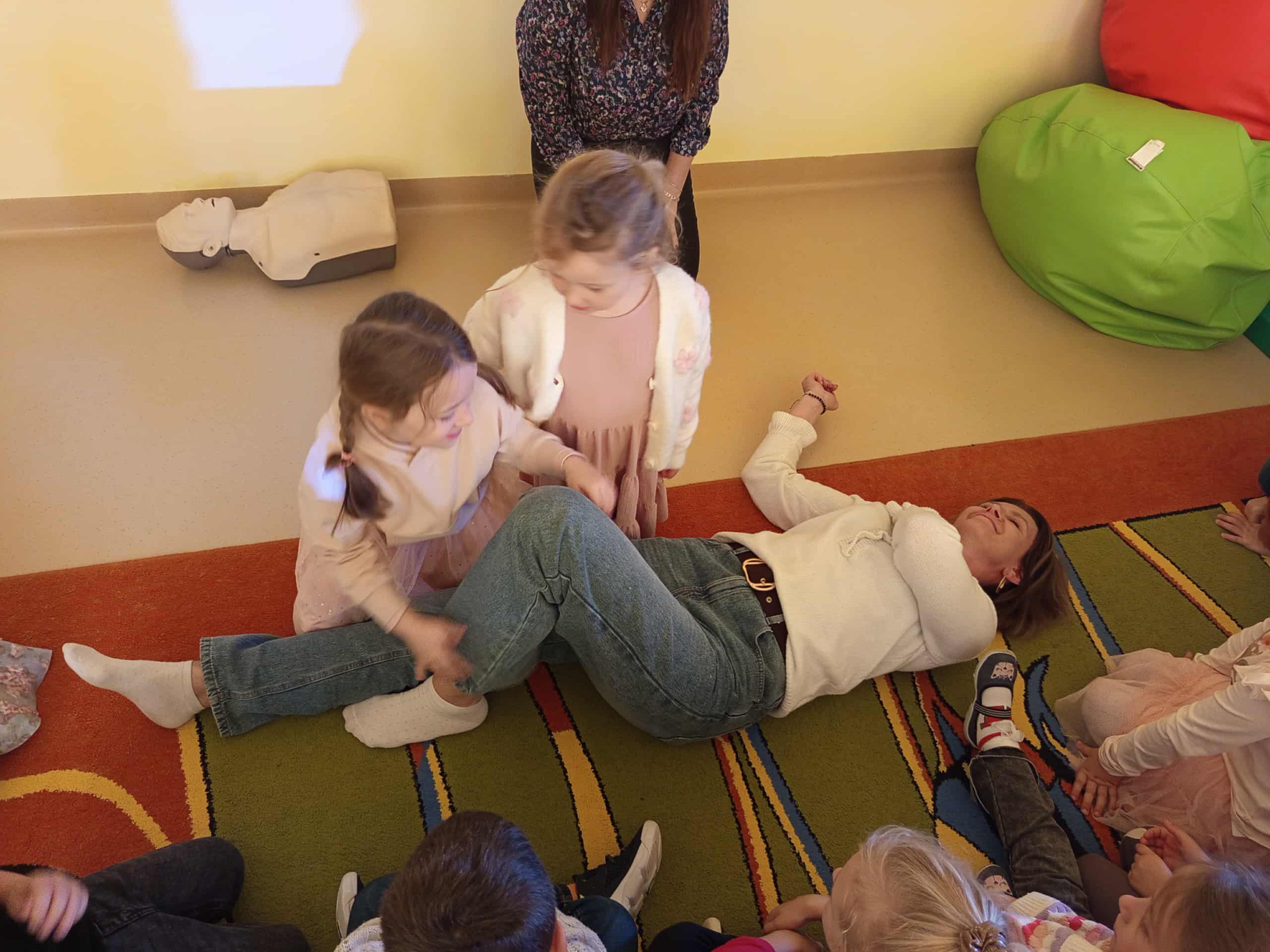 W dniach 30-31.10.2025 r. dzieci ze wszystkich grup wiekowych uczestniczyły w warsztatach z zakresu umiejętności udzielania pierwszej pomocy przedmedycznej. Poznawały ważne numery alarmowe, zasady wykonania resuscytacji czy pozycji bocznej ustalonej.