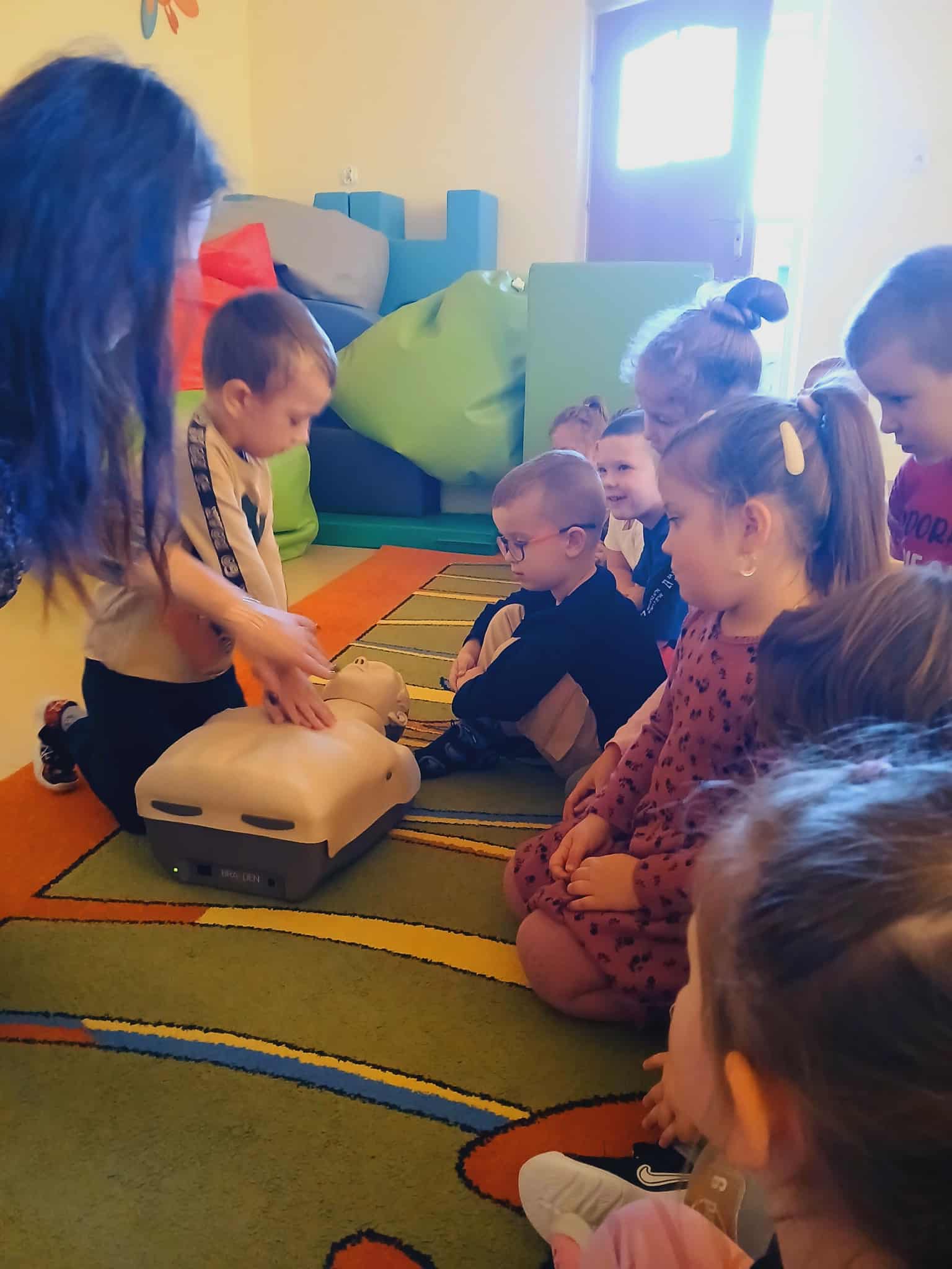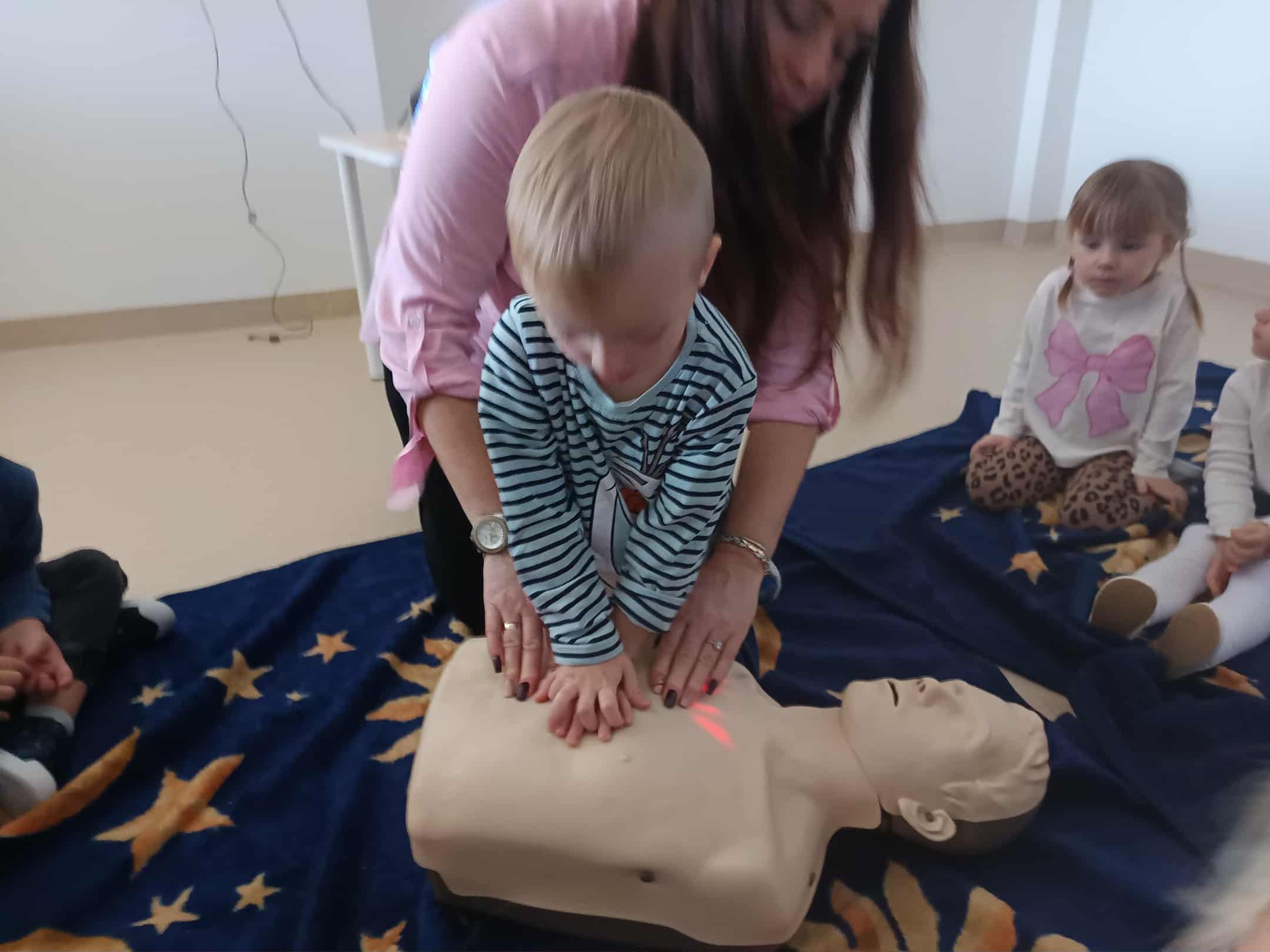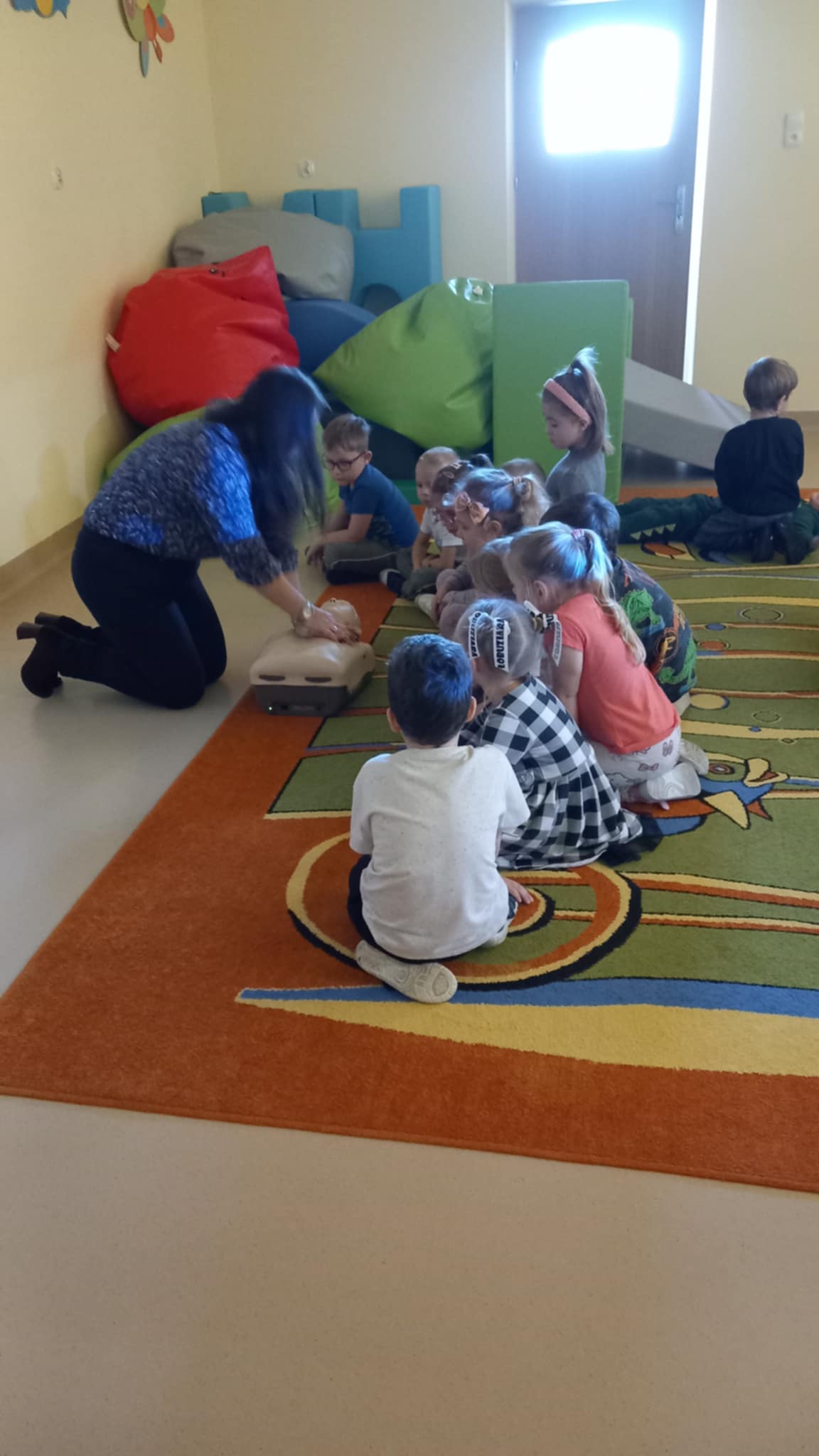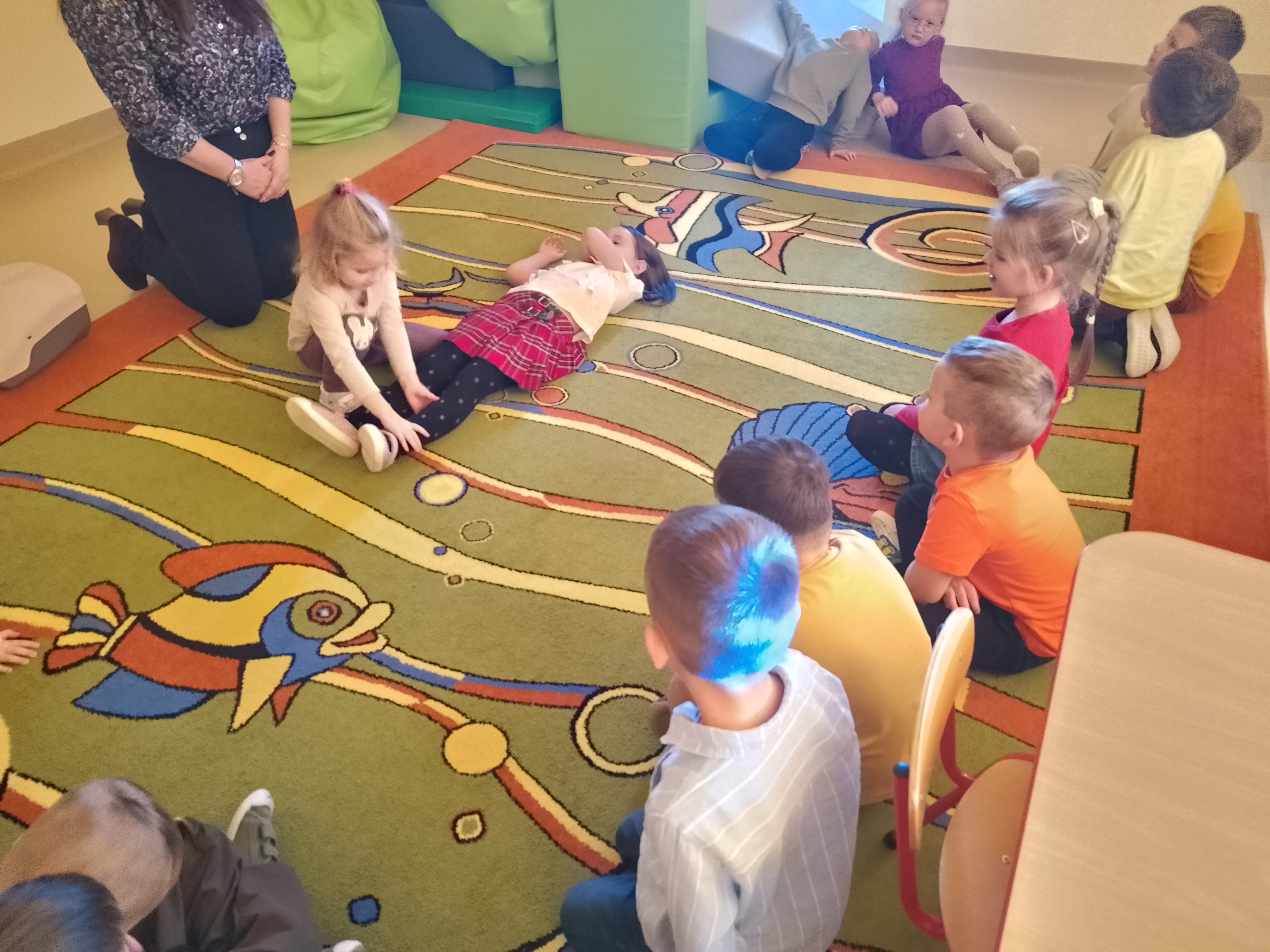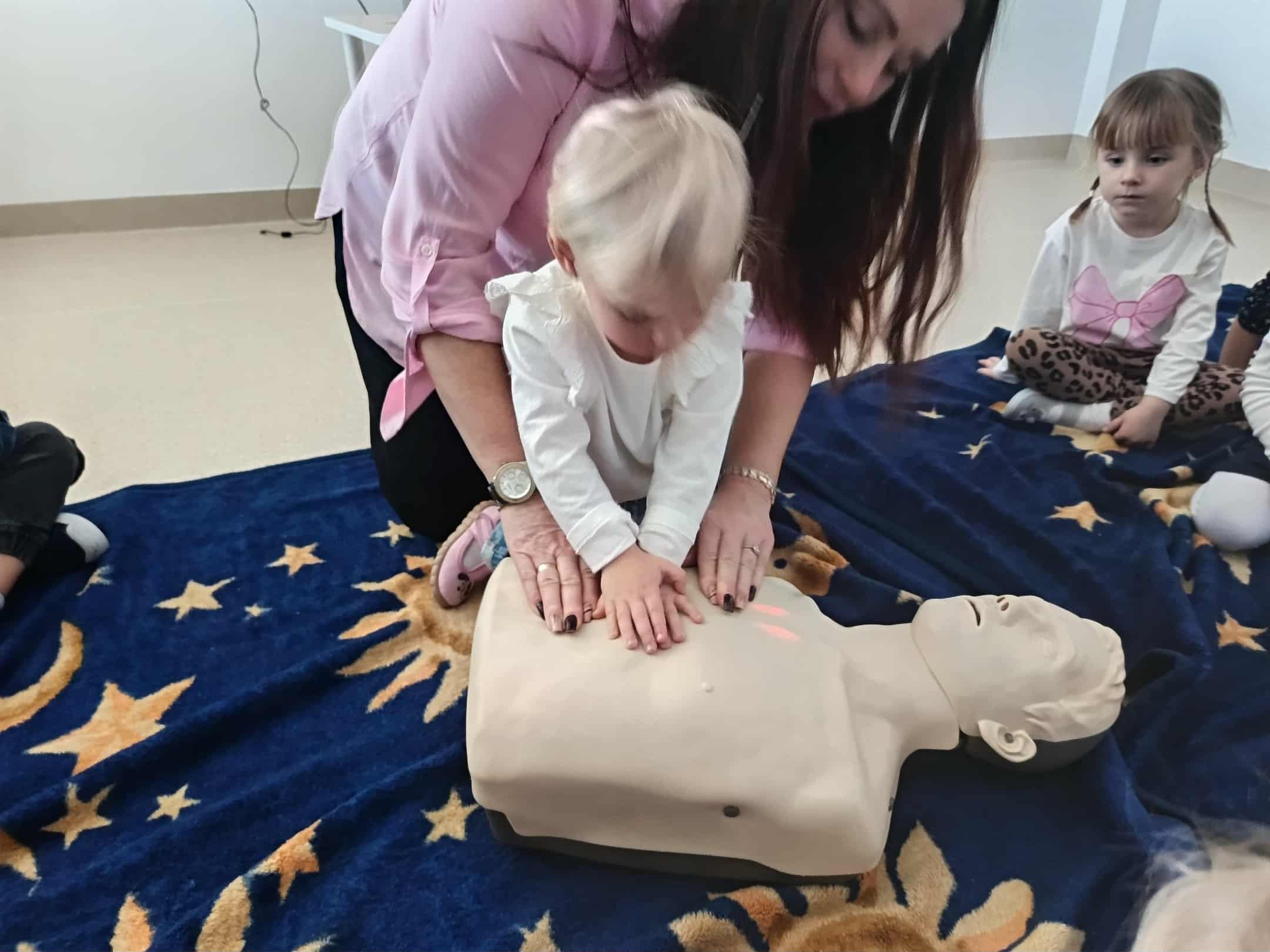W dniach 30-31.10.2025 r. dzieci ze wszystkich grup wiekowych uczestniczyły w warsztatach z zakresu umiejętności udzielania pierwszej pomocy przedmedycznej. Poznawały ważne numery alarmowe, zasady wykonania resuscytacji czy pozycji bocznej ustalonej.