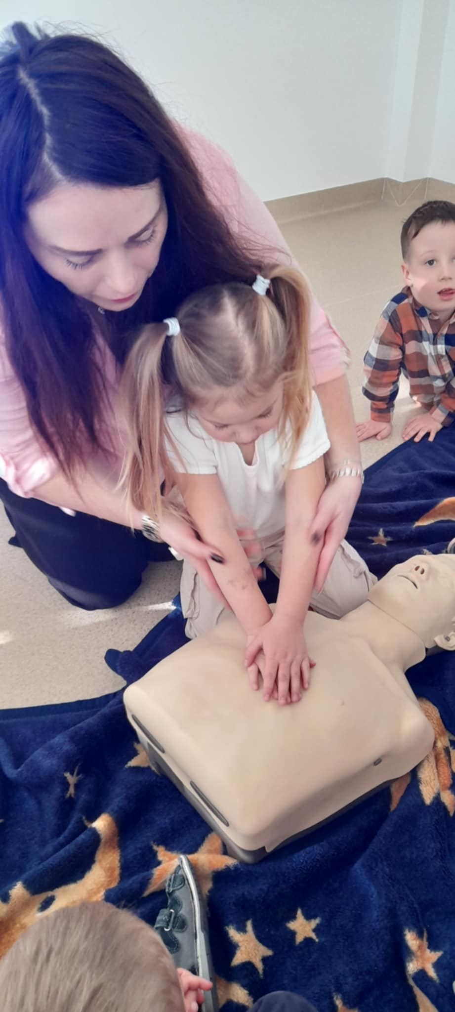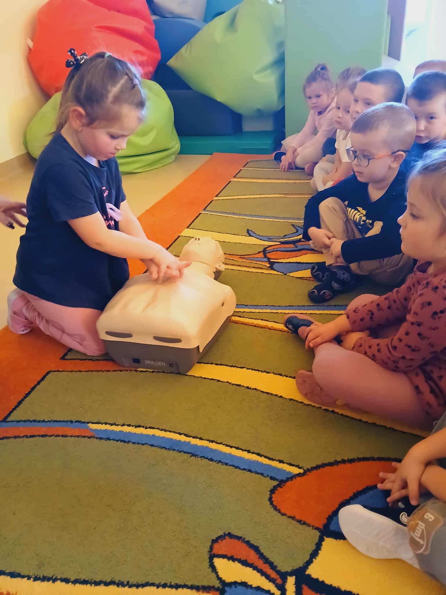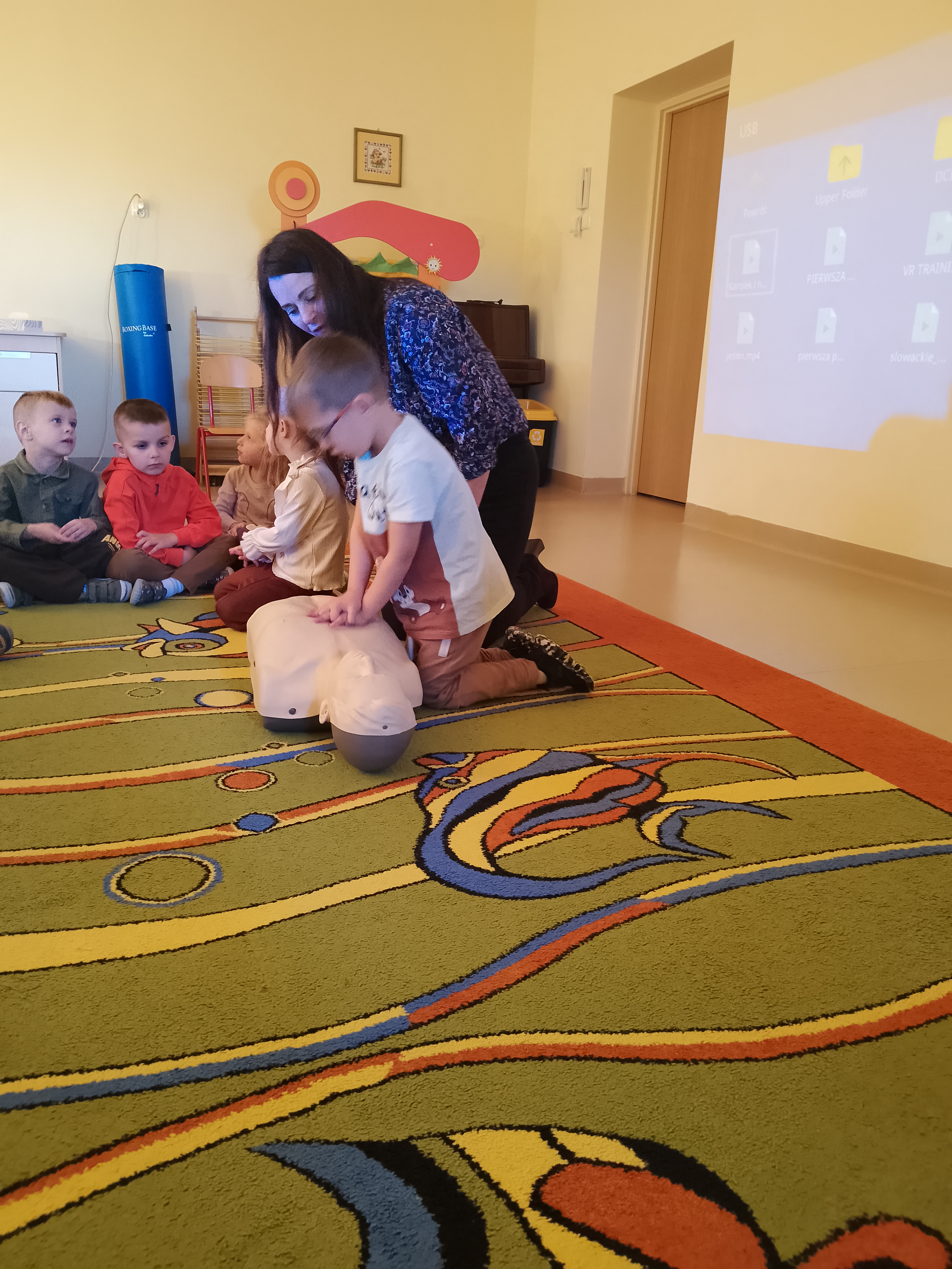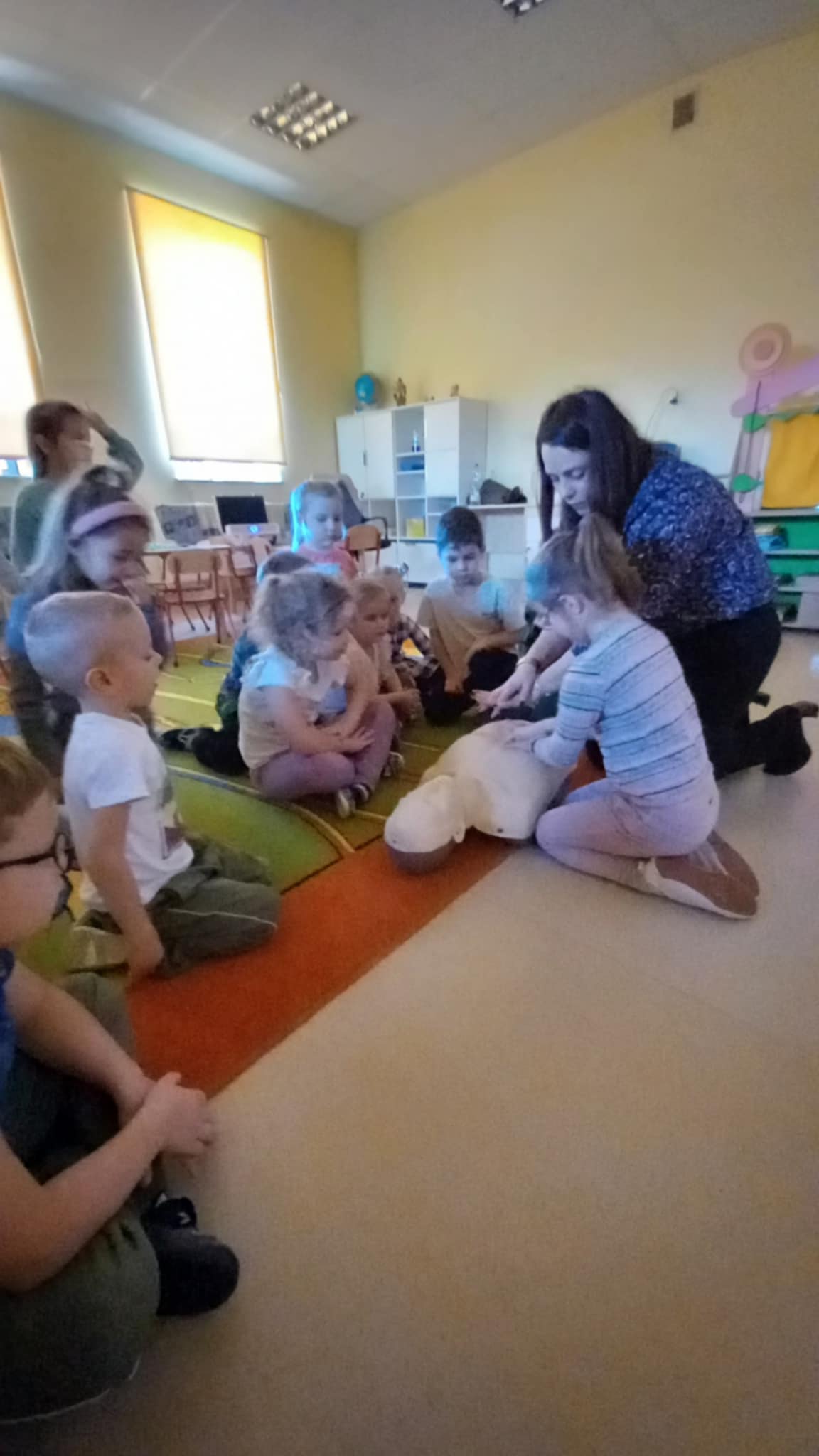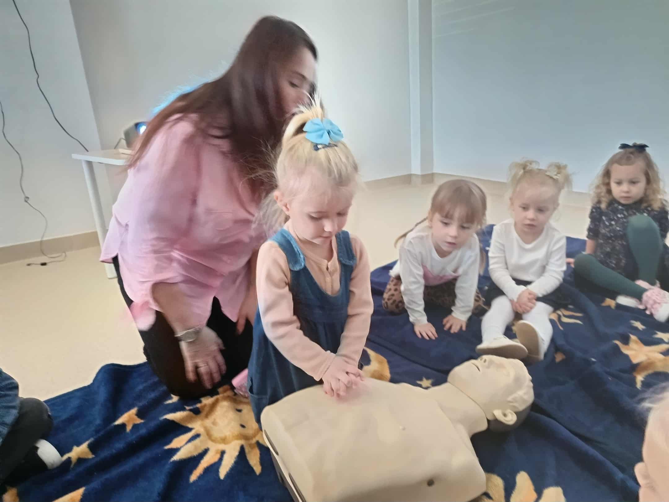 W dniach 30-31.10.2025 r. dzieci ze wszystkich grup wiekowych uczestniczyły w warsztatach z zakresu umiejętności udzielania pierwszej pomocy przedmedycznej. Poznawały ważne numery alarmowe, zasady wykonania resuscytacji czy pozycji bocznej ustalonej.