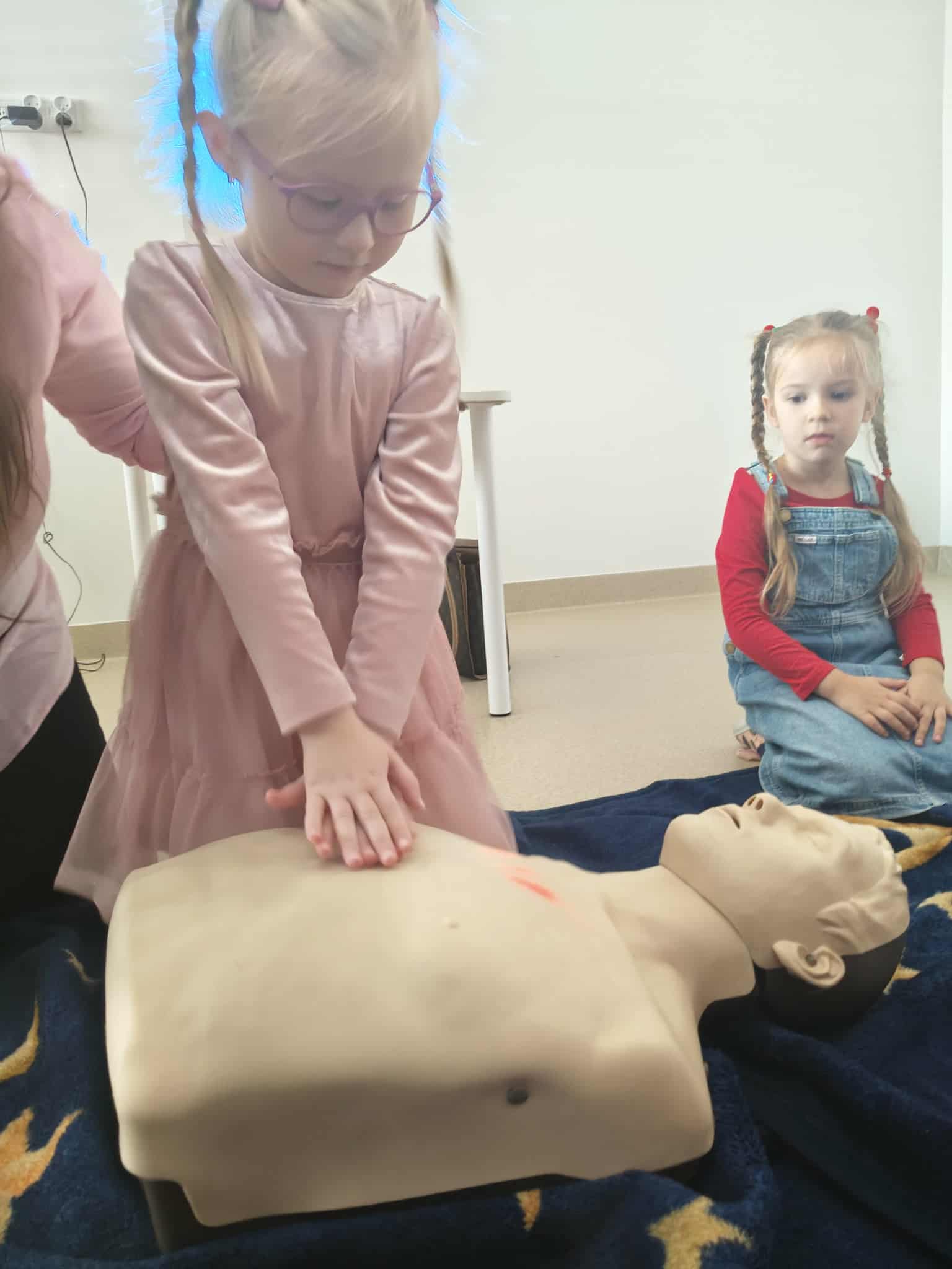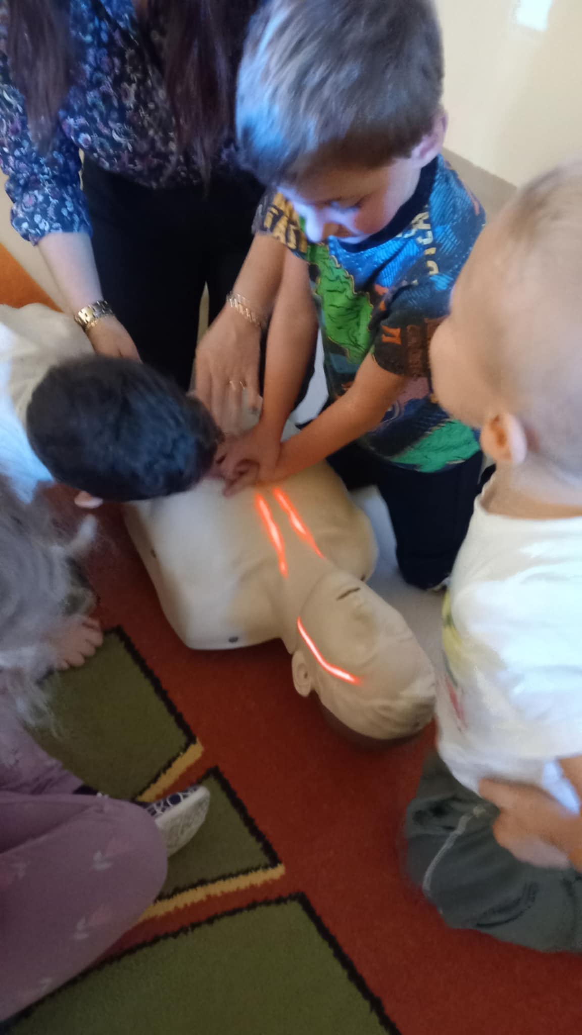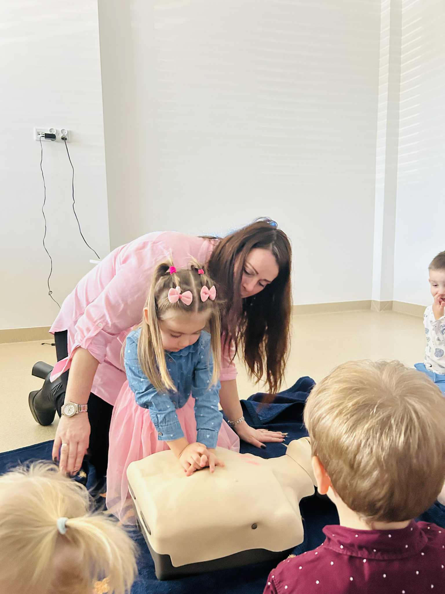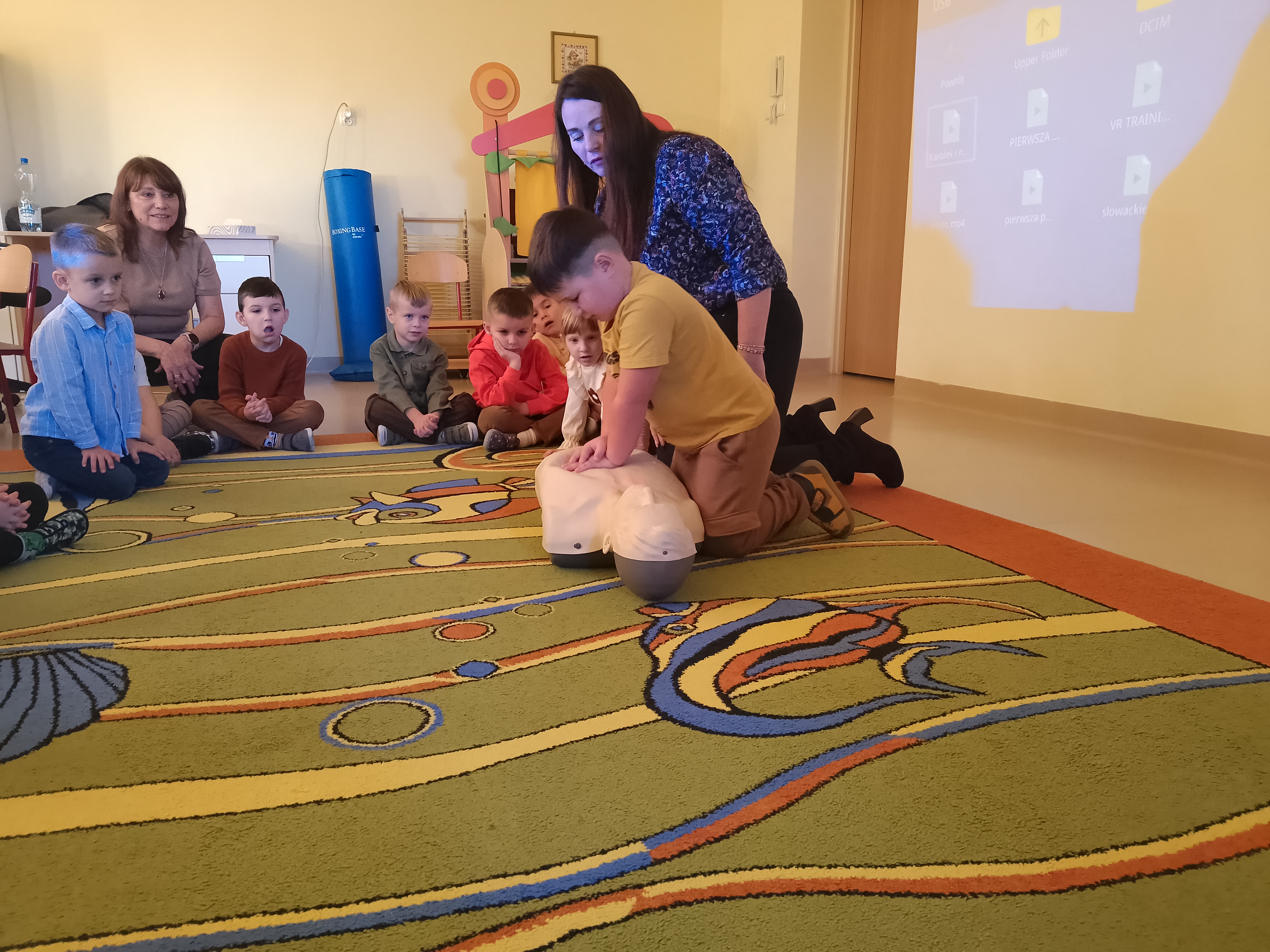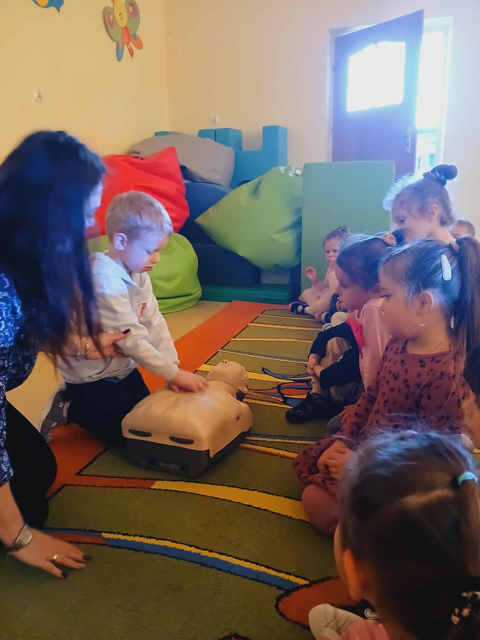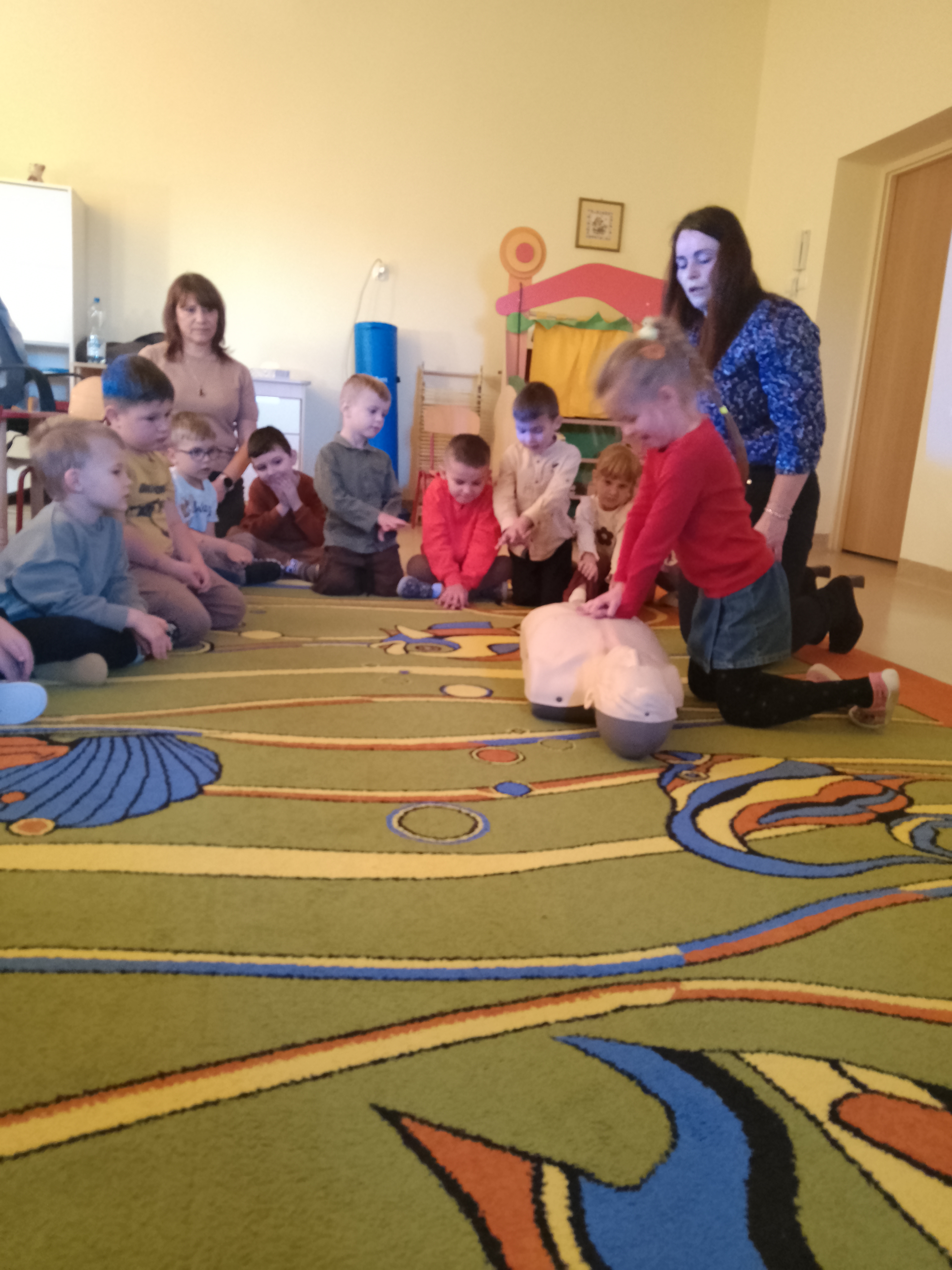 W dniach 30-31.10.2025 r. dzieci ze wszystkich grup wiekowych uczestniczyły w warsztatach z zakresu umiejętności udzielania pierwszej pomocy przedmedycznej. Poznawały ważne numery alarmowe, zasady wykonania resuscytacji czy pozycji bocznej ustalonej.
