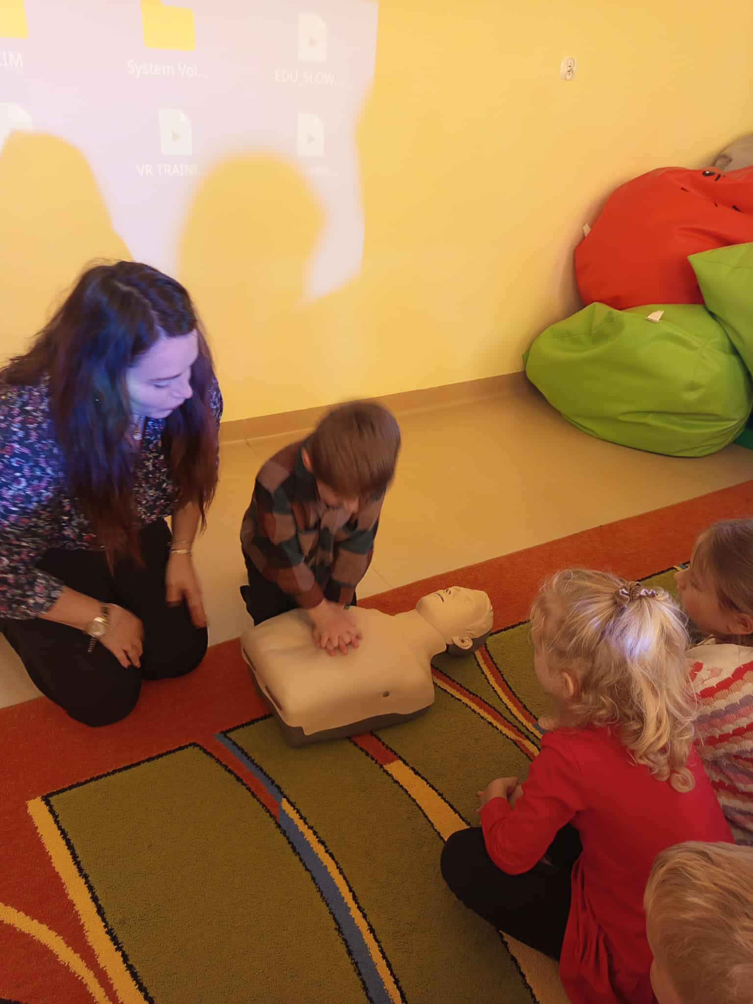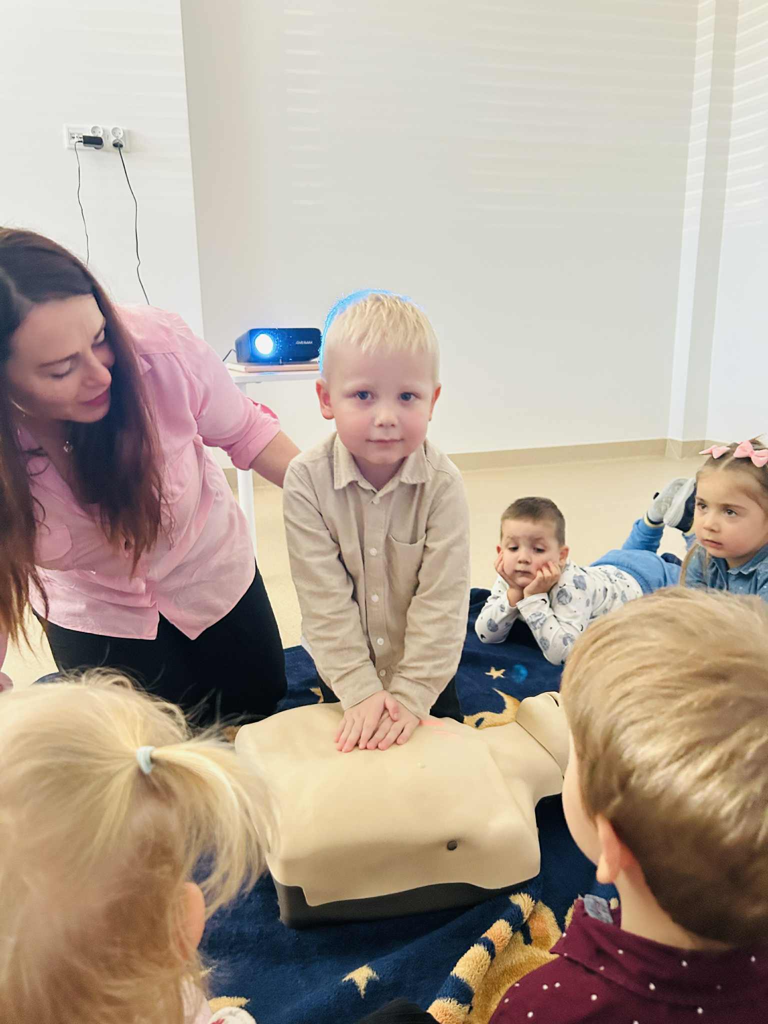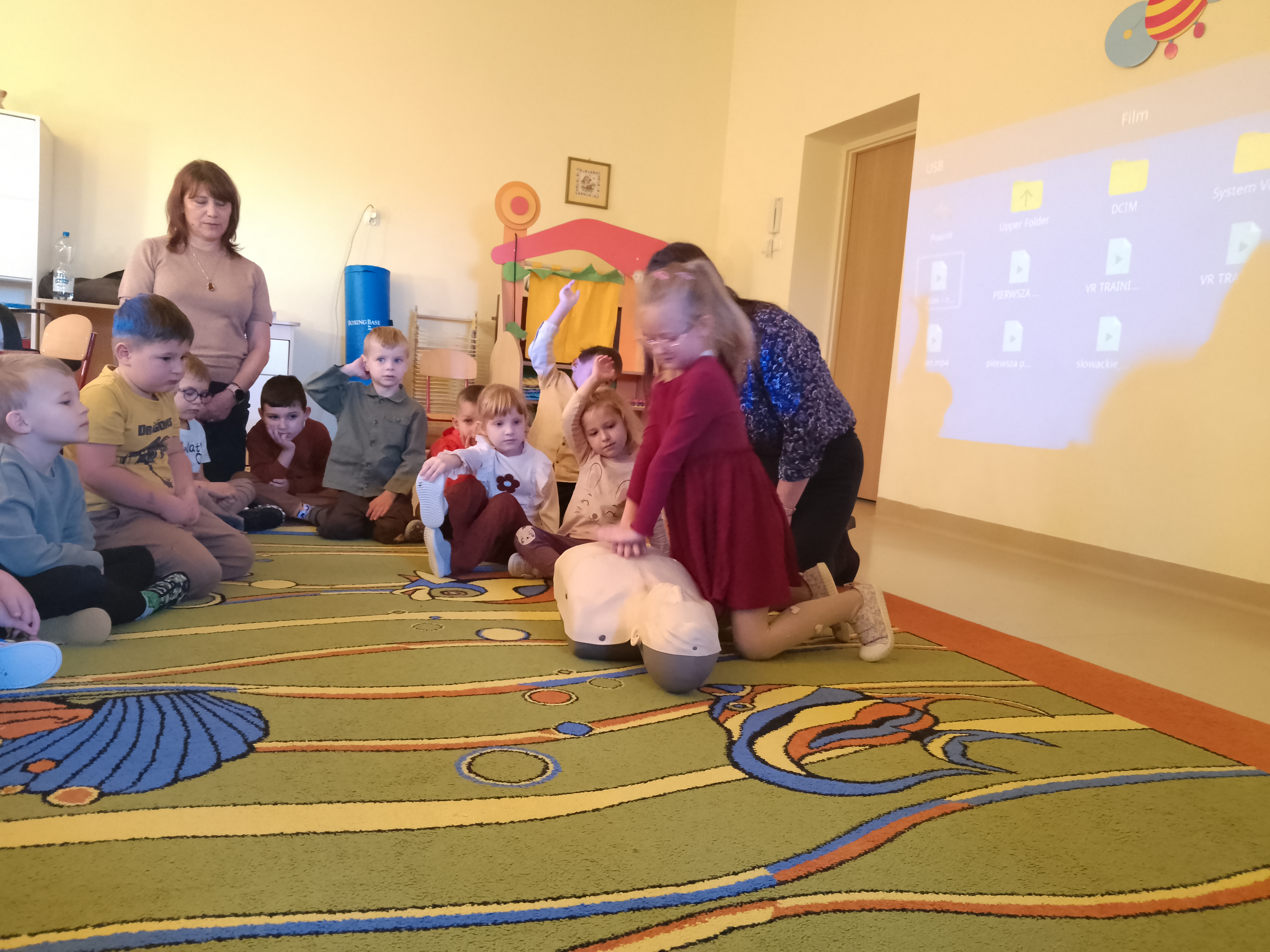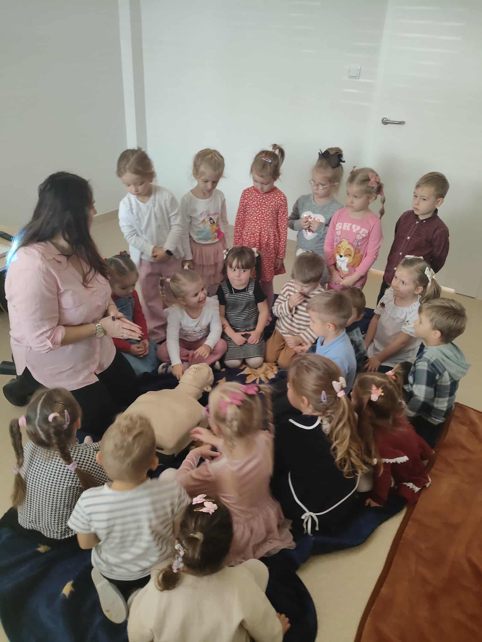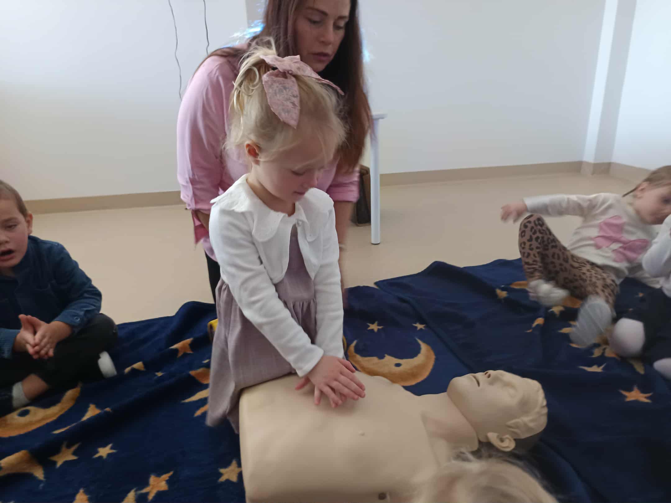 W dniach 30-31.10.2025 r. dzieci ze wszystkich grup wiekowych uczestniczyły w warsztatach z zakresu umiejętności udzielania pierwszej pomocy przedmedycznej. Poznawały ważne numery alarmowe, zasady wykonania resuscytacji czy pozycji bocznej ustalonej.
