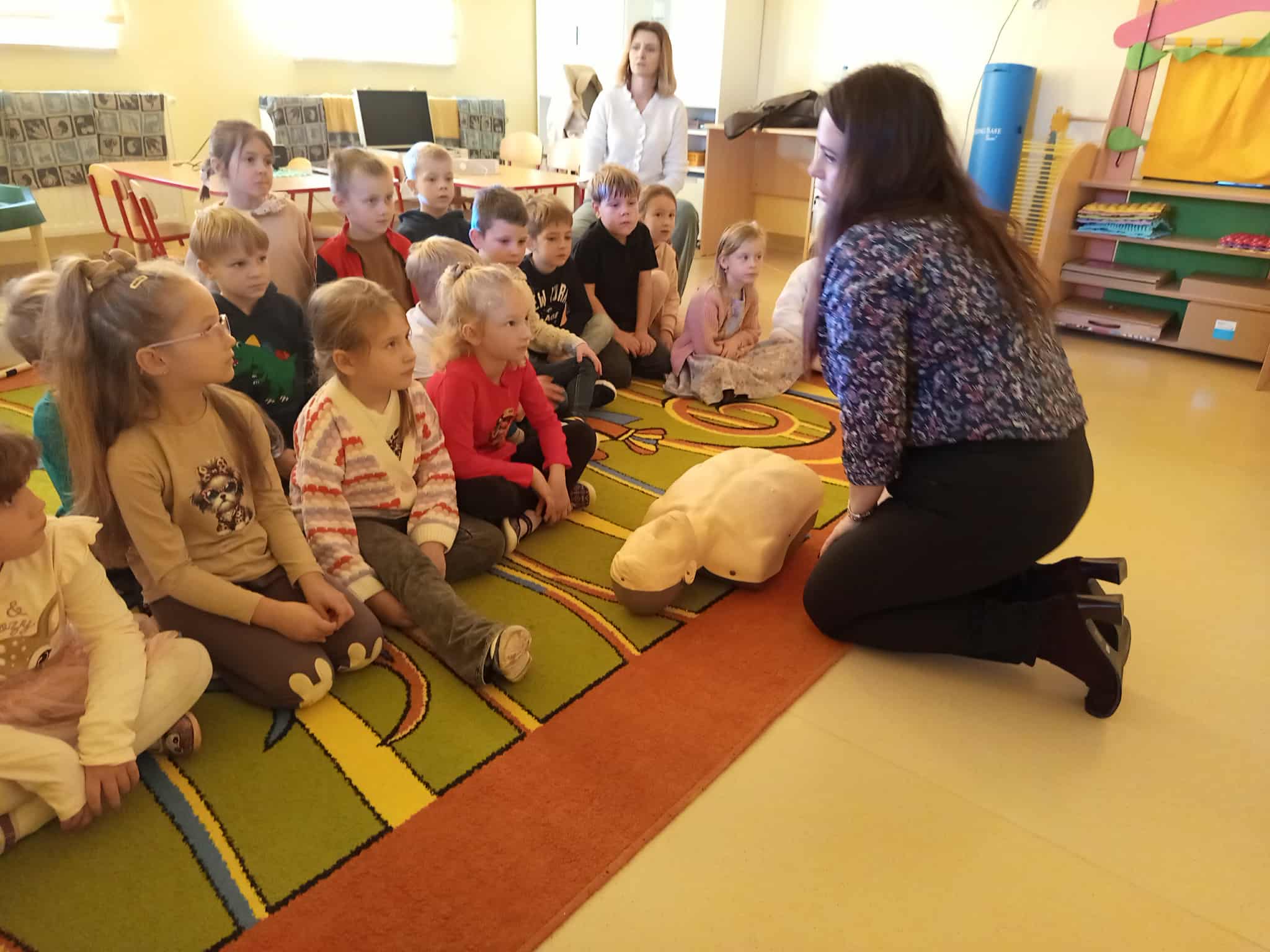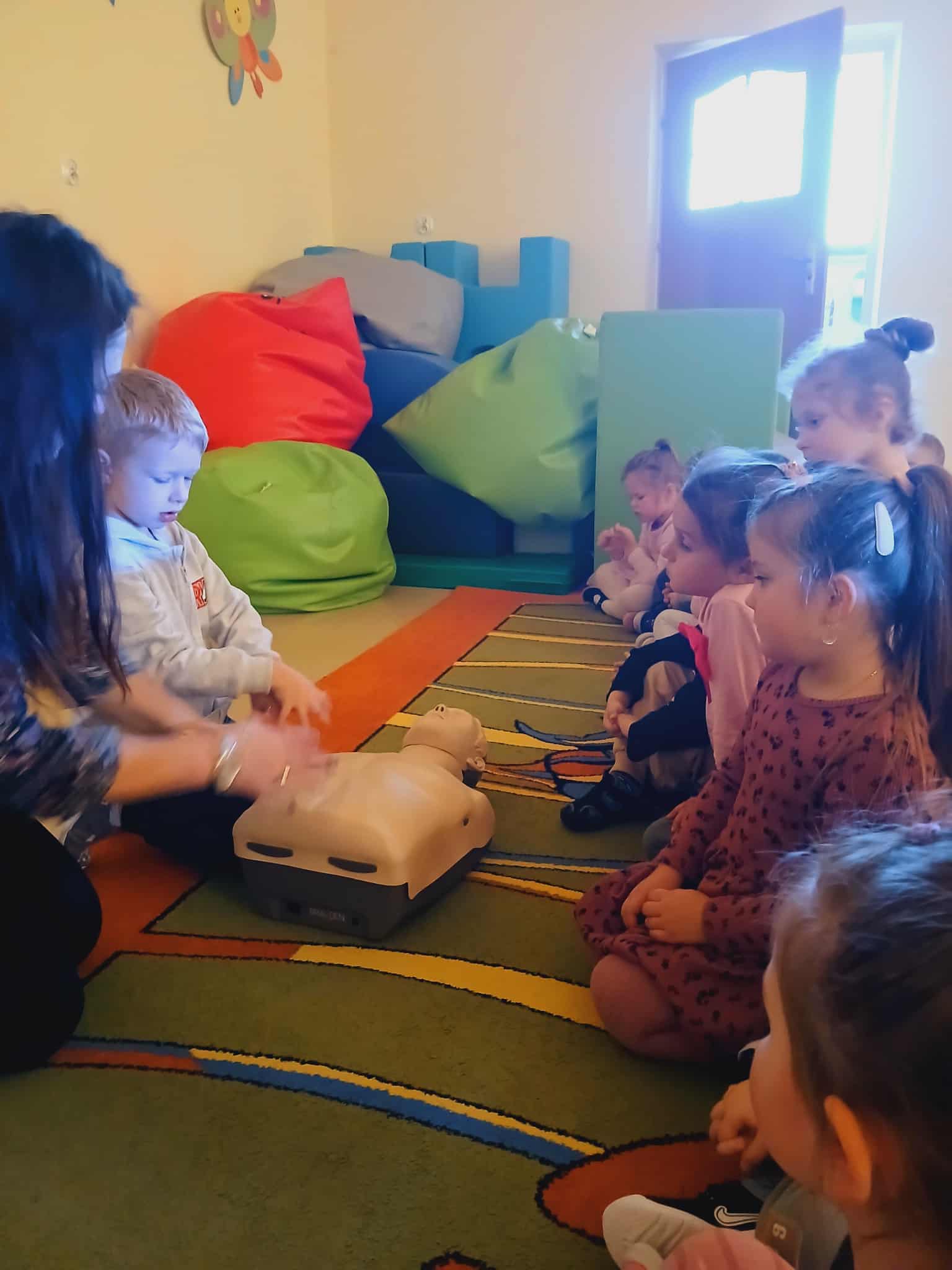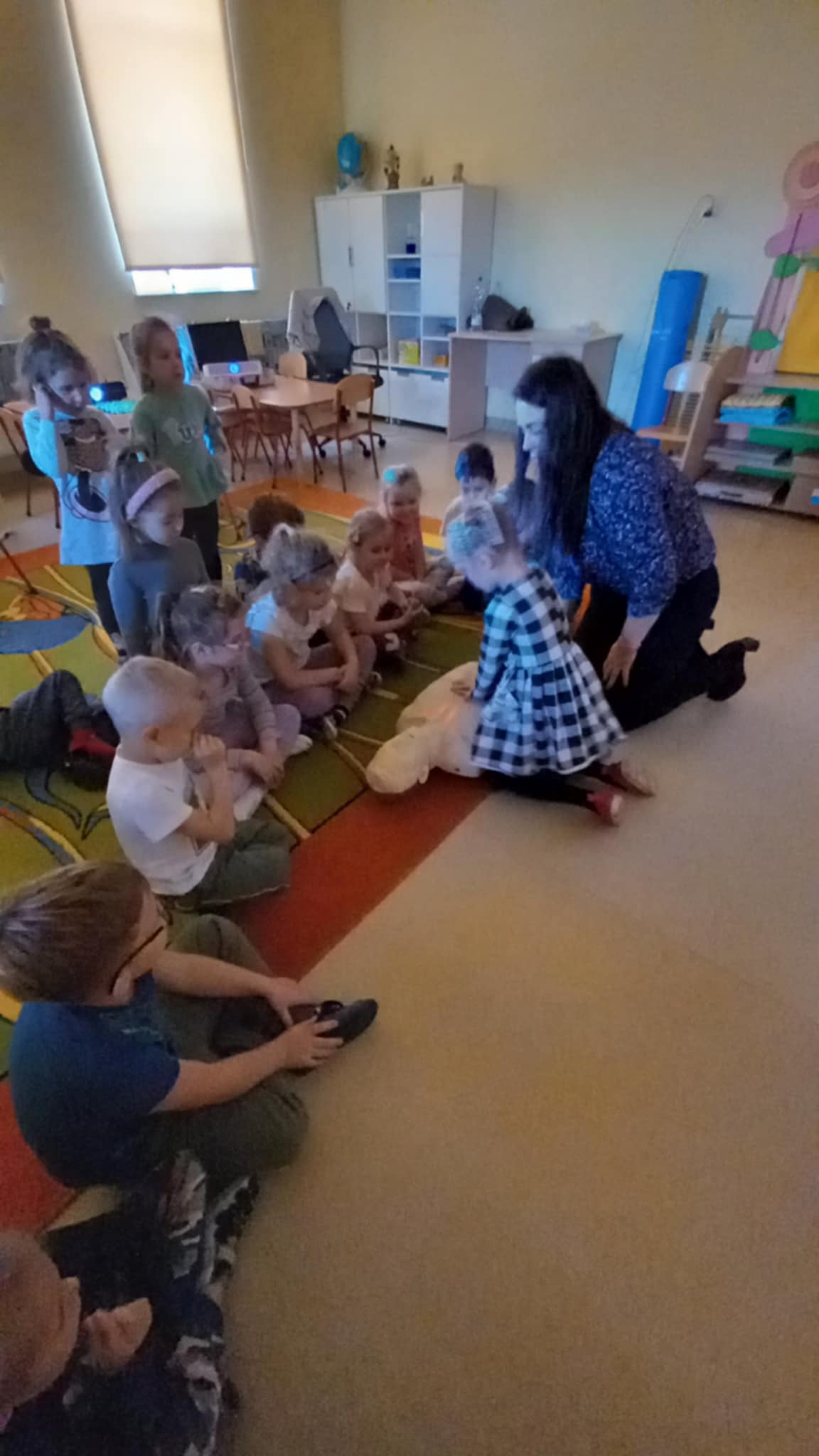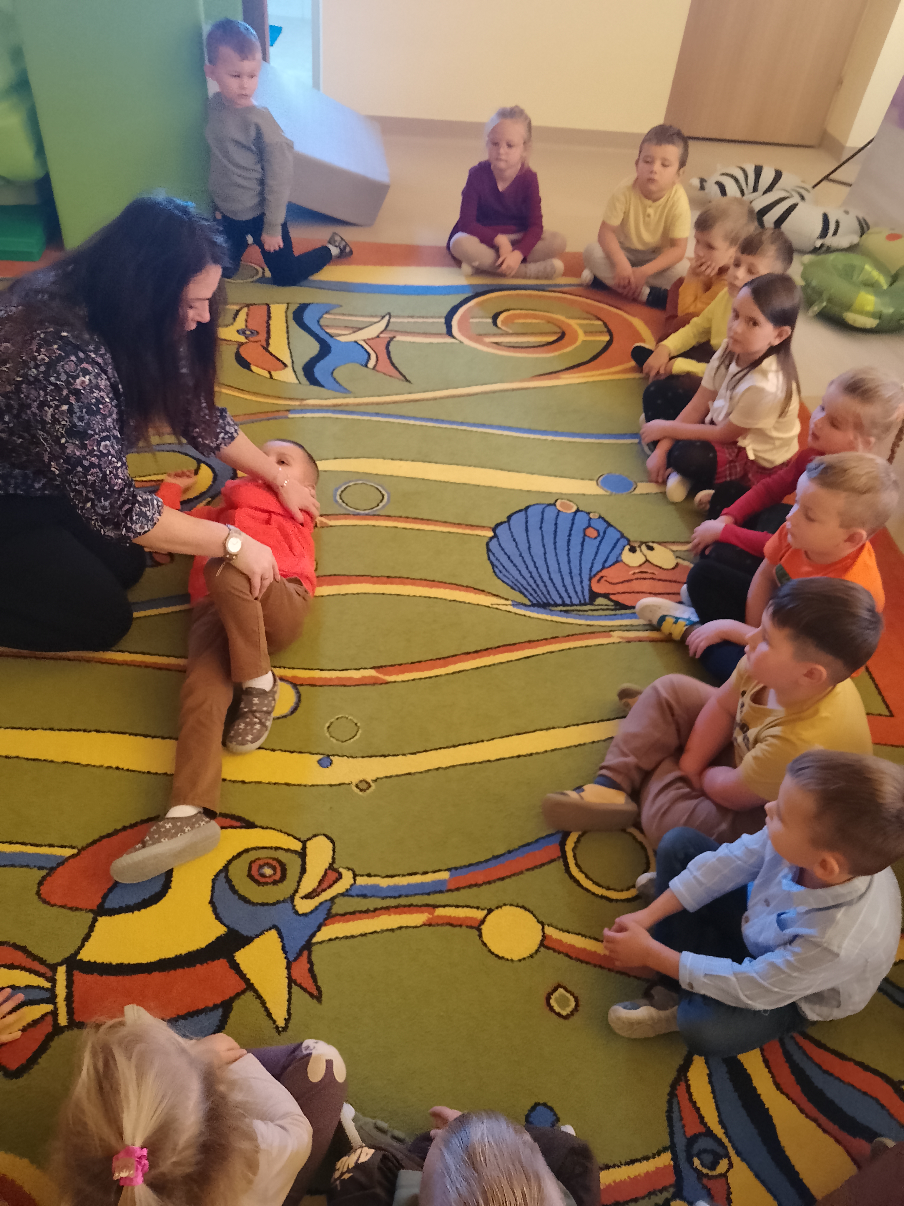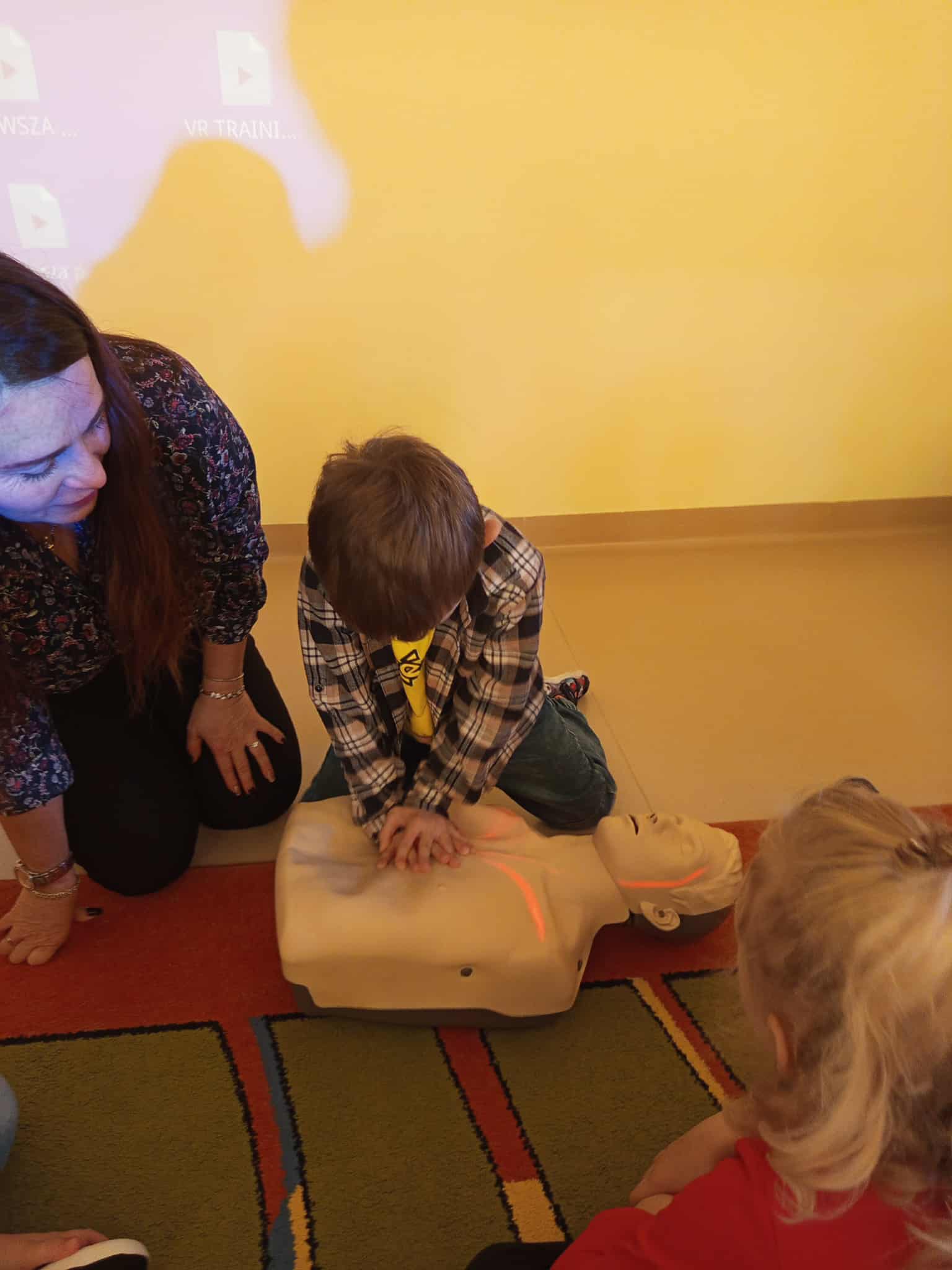 W dniach 30-31.10.2025 r. dzieci ze wszystkich grup wiekowych uczestniczyły w warsztatach z zakresu umiejętności udzielania pierwszej pomocy przedmedycznej. Poznawały ważne numery alarmowe, zasady wykonania resuscytacji czy pozycji bocznej ustalonej.