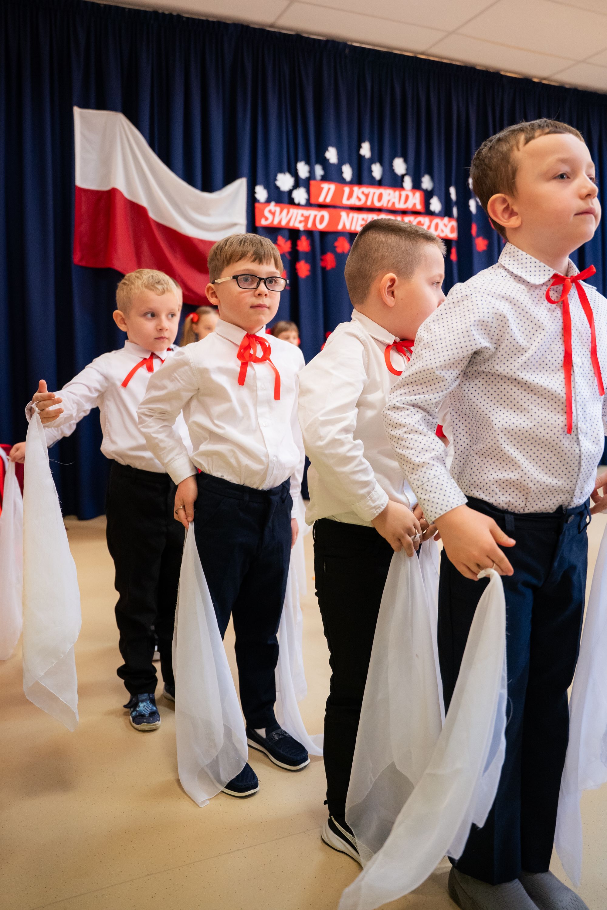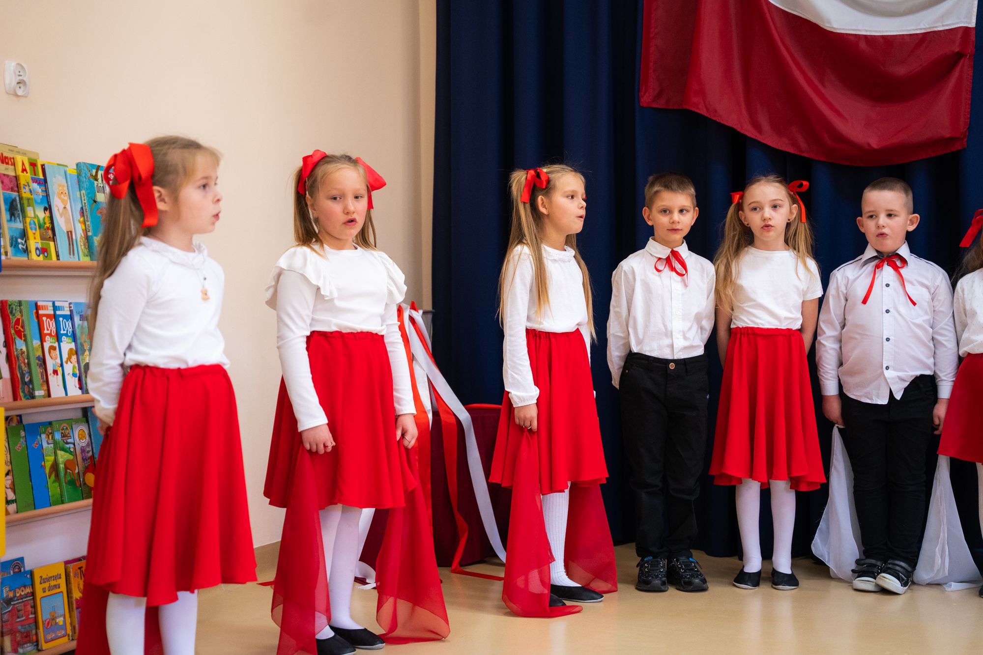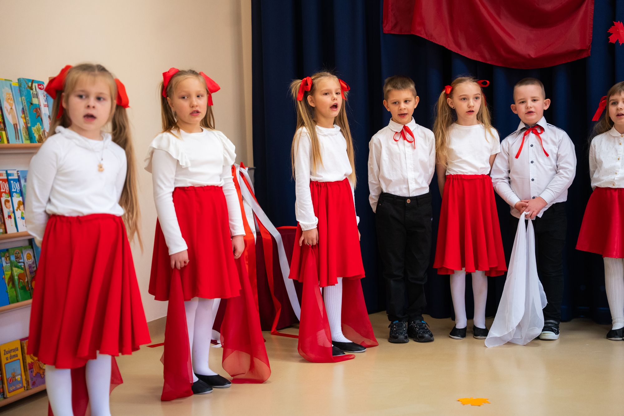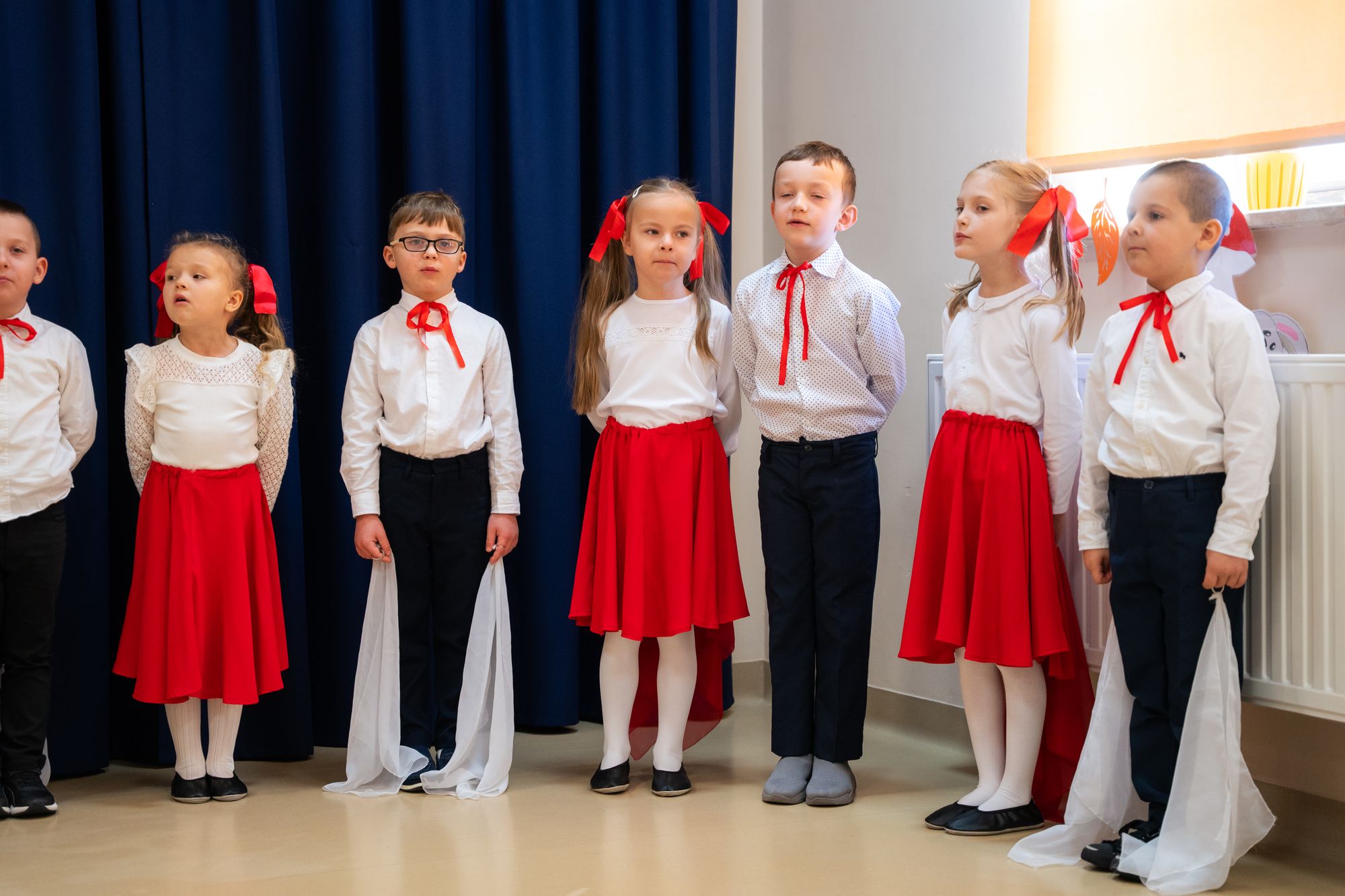 Dzieci z grupy „Słoneczka” przygotowały piękny program artystyczny. Spotkanie rozpoczęło się wspólnym odśpiewaniem hymnu narodowego, a następnie przedszkolaki recytowały wiersze, śpiewały pieśni patriotyczne i zaprezentowały tańce.