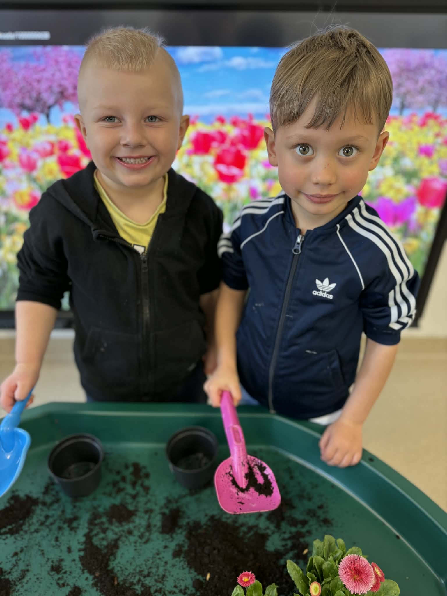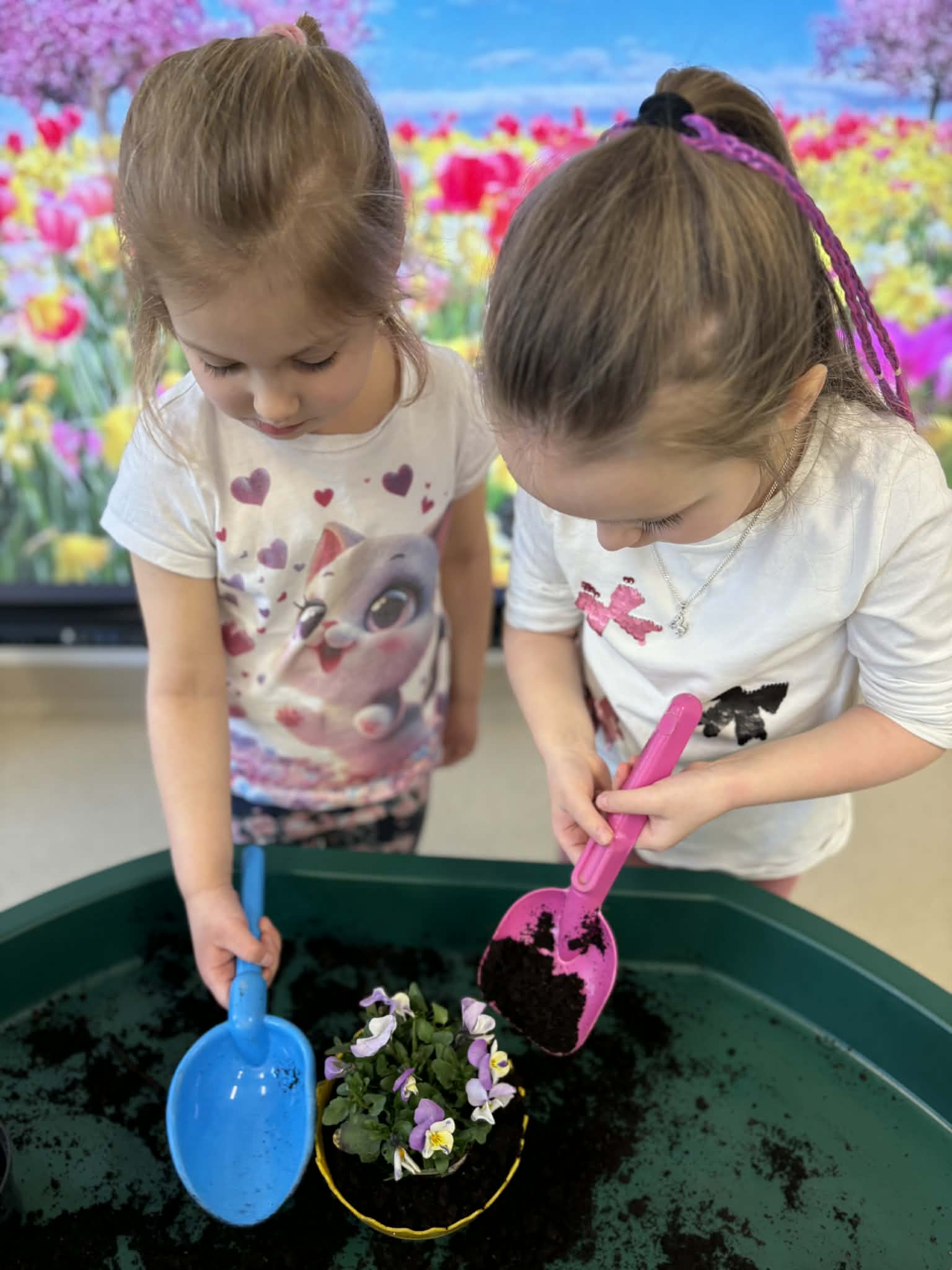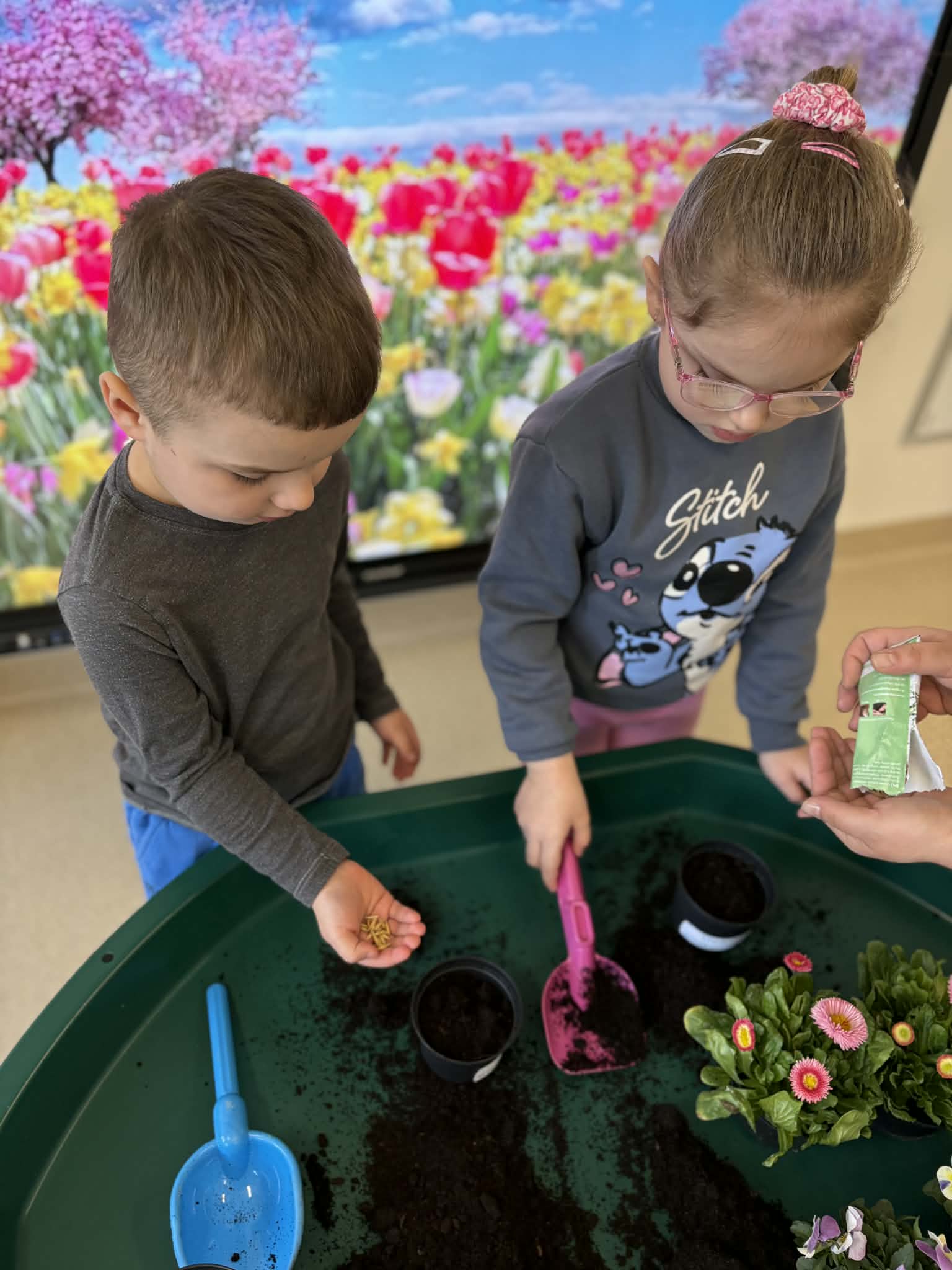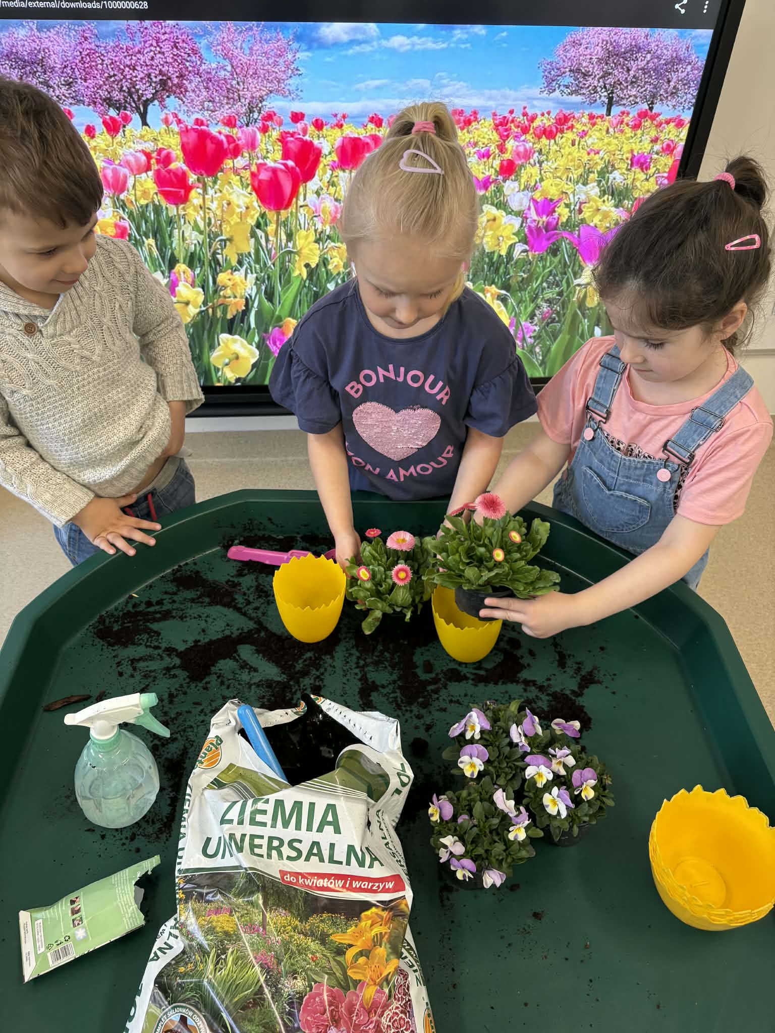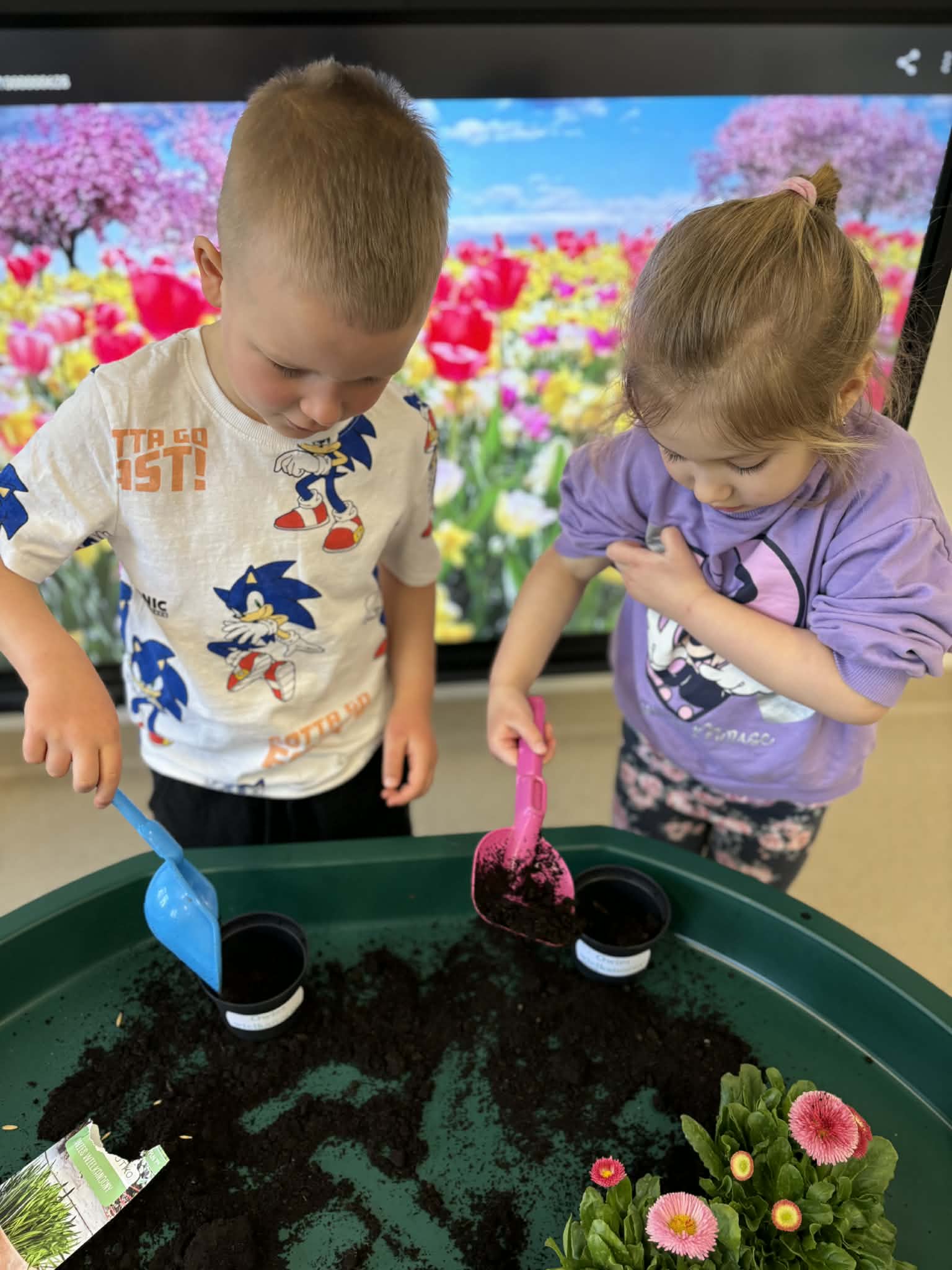 Warsztaty ogrodnicze w grupie „Smerfiki”. Ich celem było rozwijanie zainteresowań przyrodniczych, kształtowanie postawy troski o rośliny oraz doskonalenie umiejętności praktycznych. Podczas zajęć wspólnie sadziliśmy kwiatki oraz wysiewaliśmy owies wielkanocny. Dzieci miały okazję samodzielnie pracować z ziemią, poznawać etapy sadzenia roślin i obserwować, jak należy o nie dbać. Warsztaty sprawiły dużo radości i były doskonałą okazją do nauki poprzez działanie.