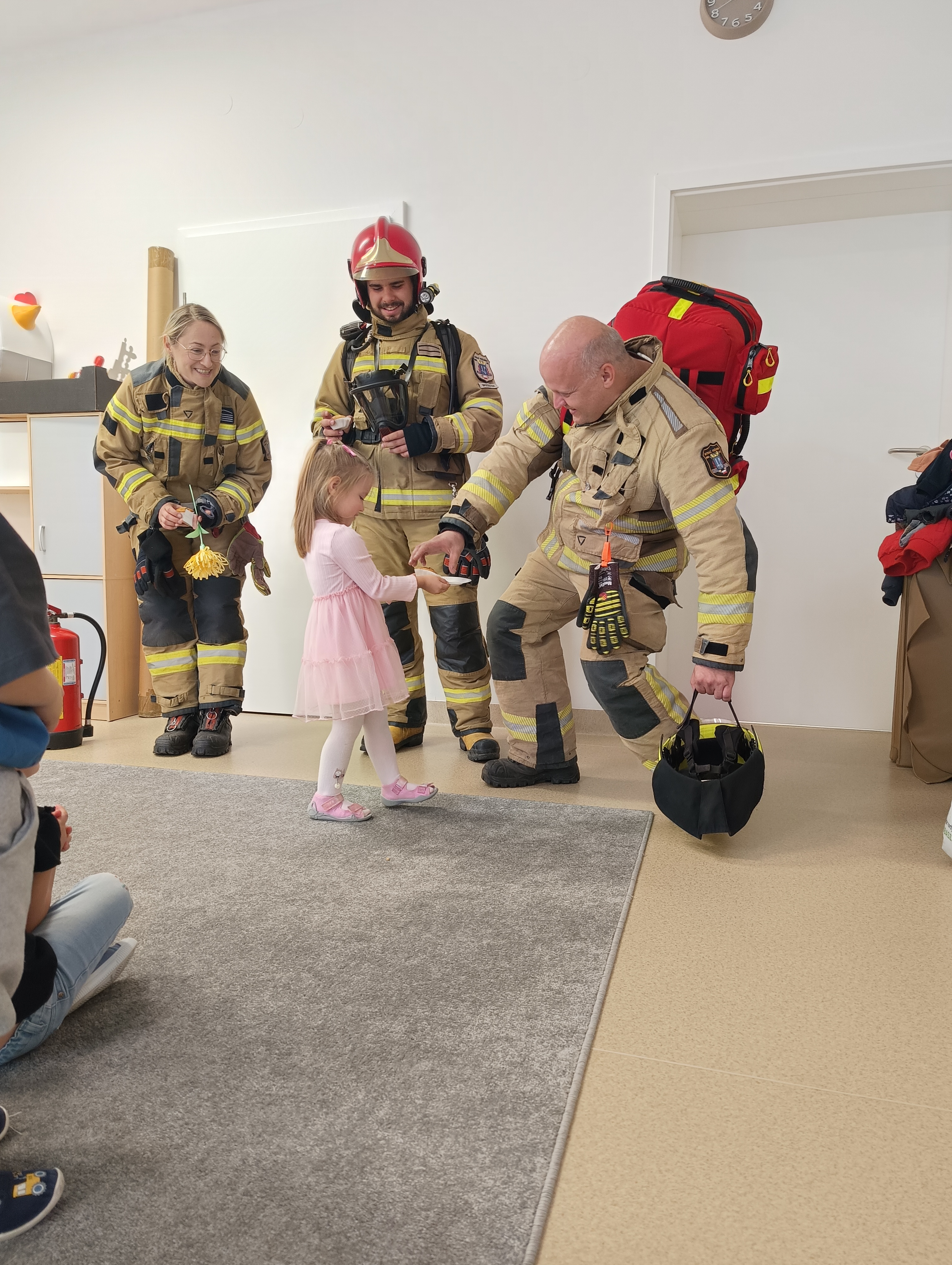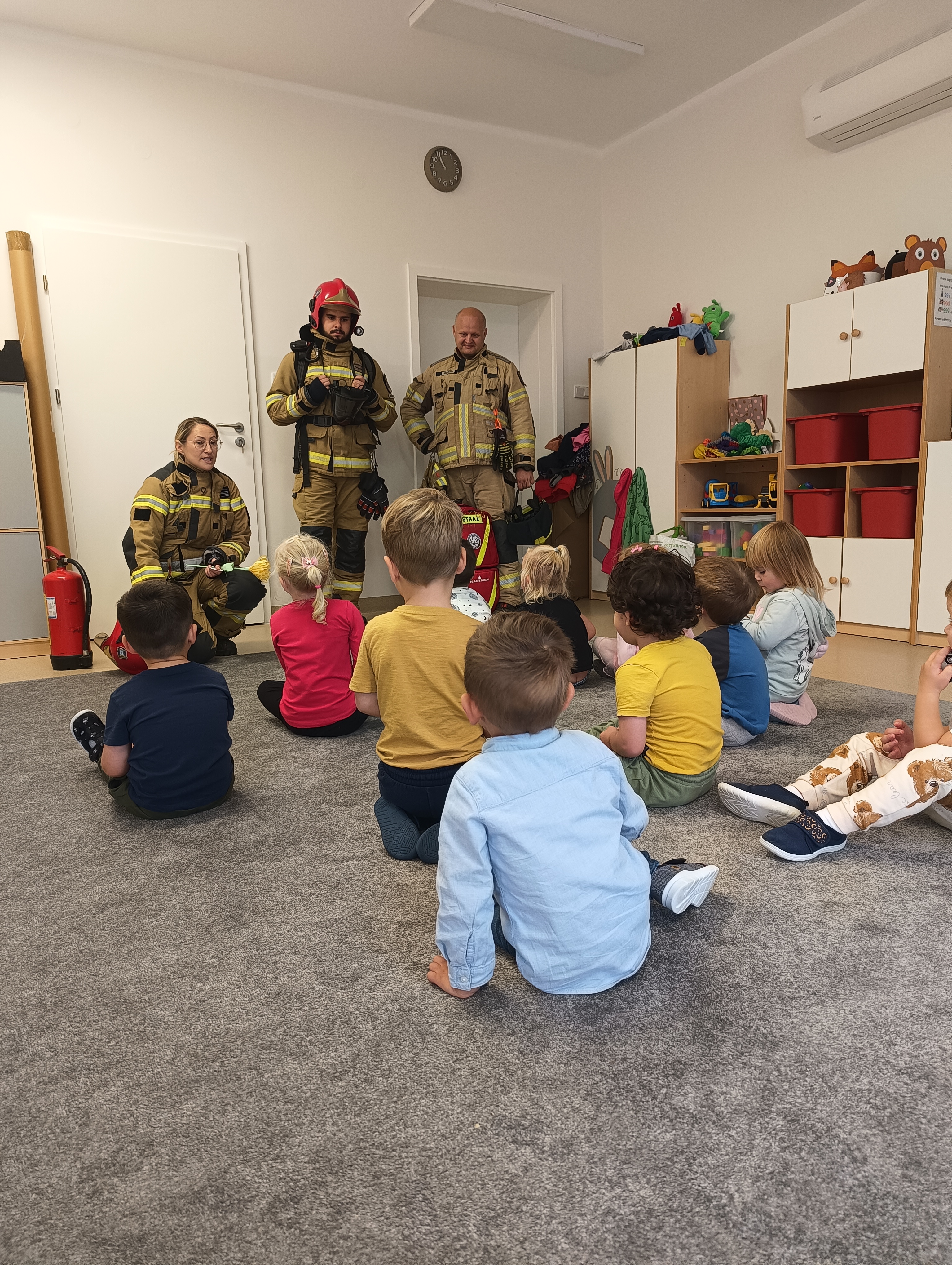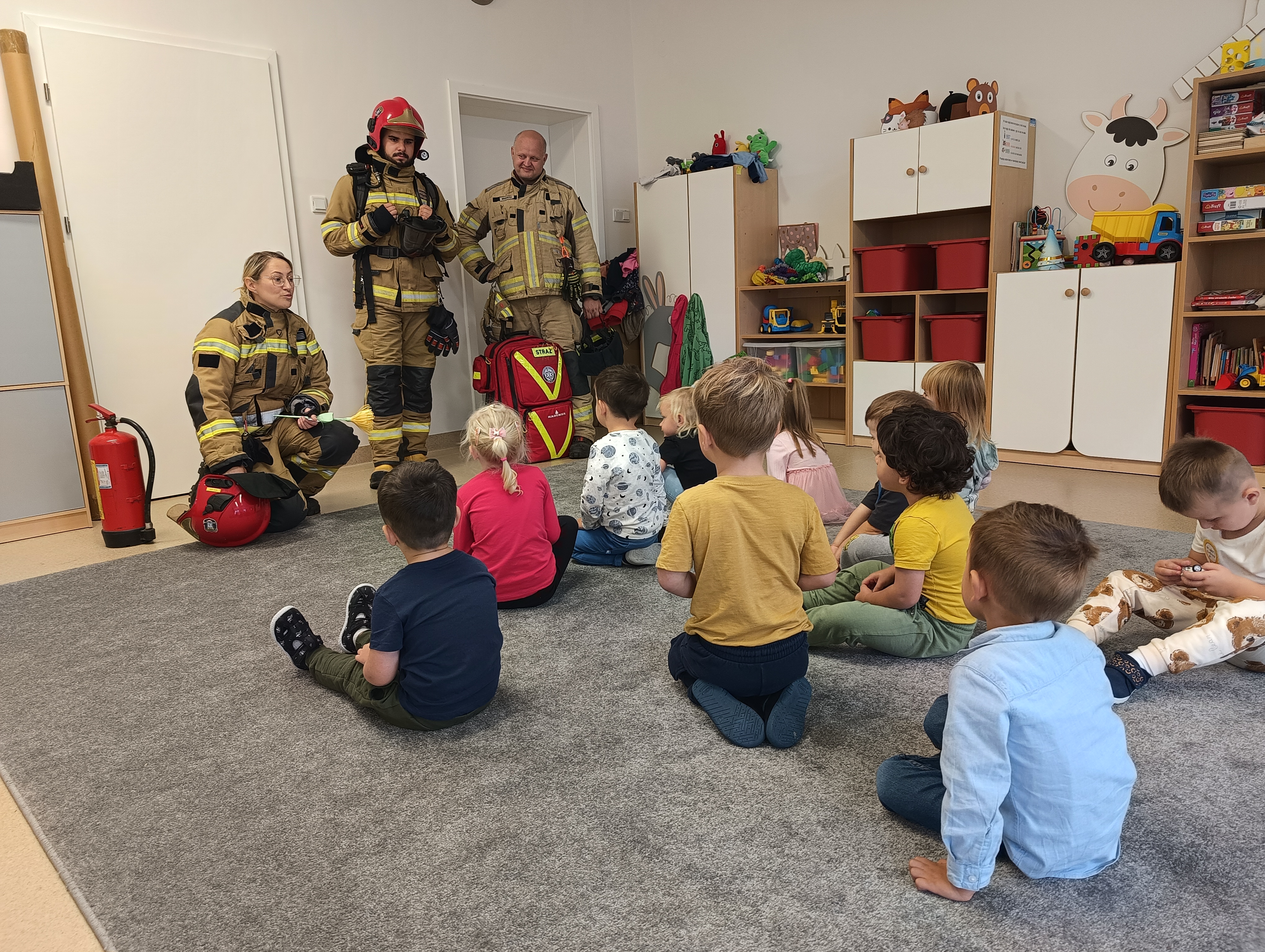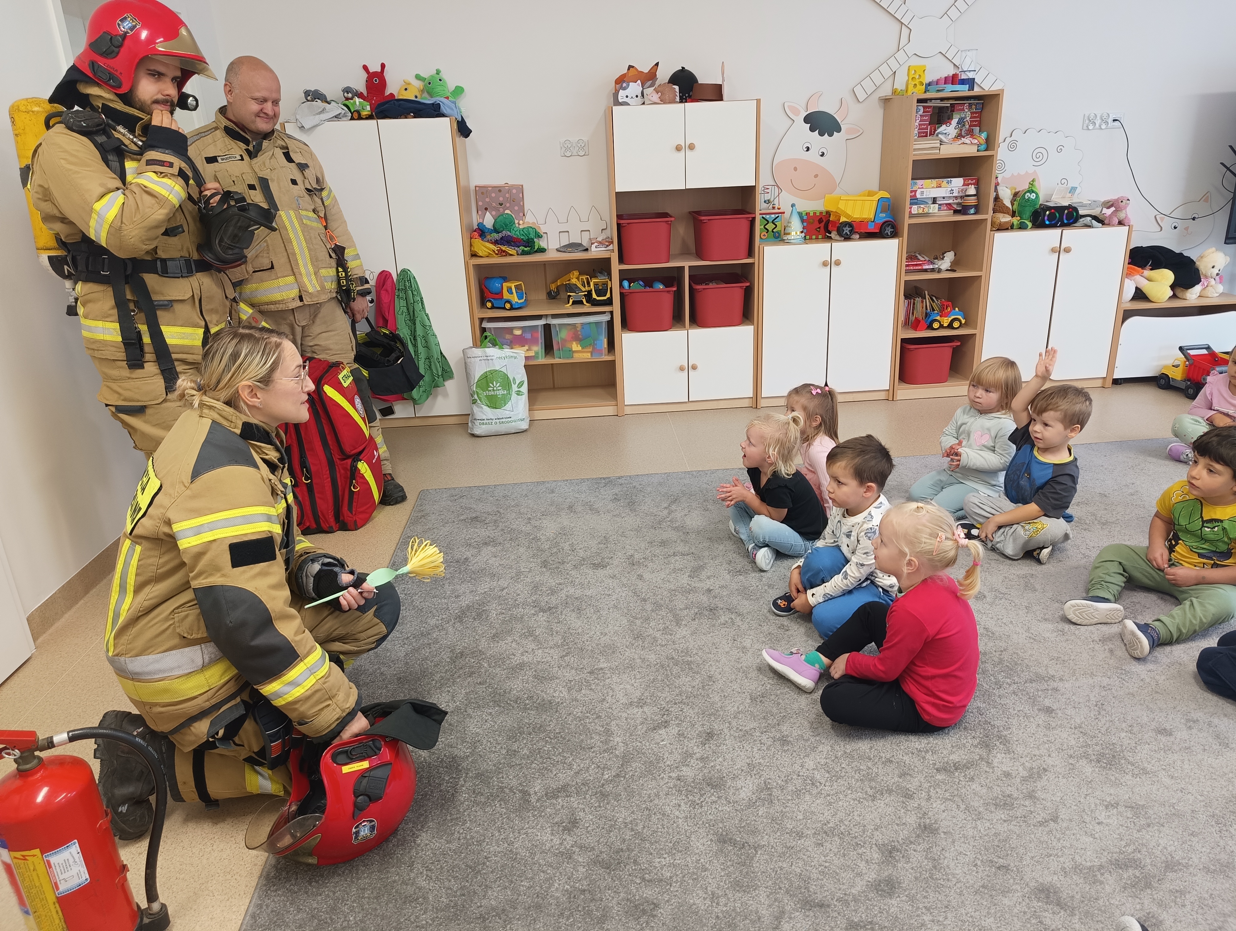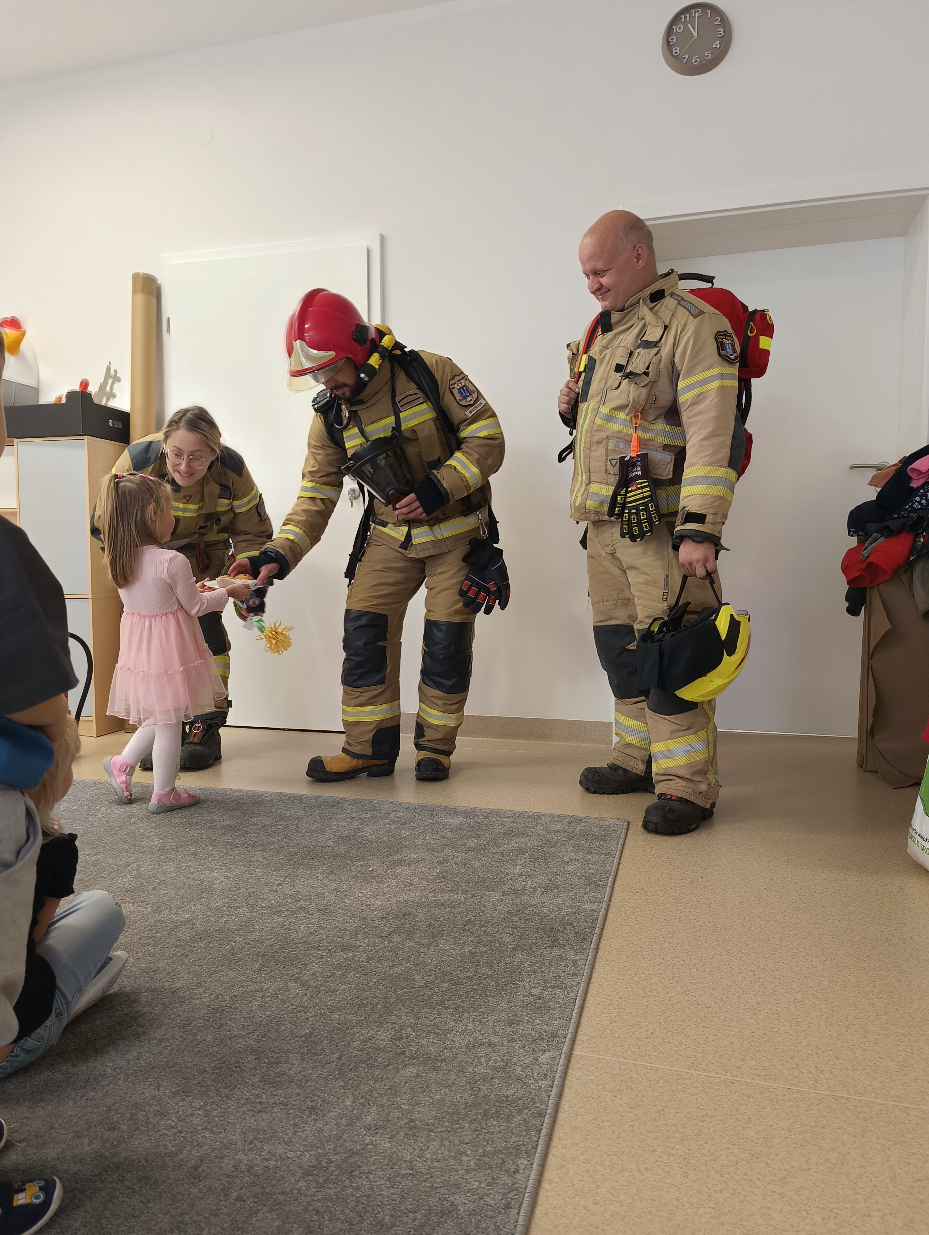 Największą atrakcje nasi strażacy zostawili na koniec. Odwiedzając grupę, przybliżyli dzieciom na czym polega ich praca oraz jakim sprzętem ratowniczym się posługują. Dziękujemy strażakom za przybycie i cenne wskazówki.