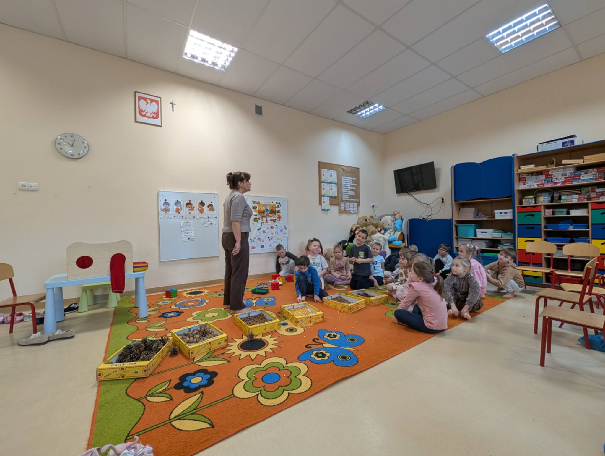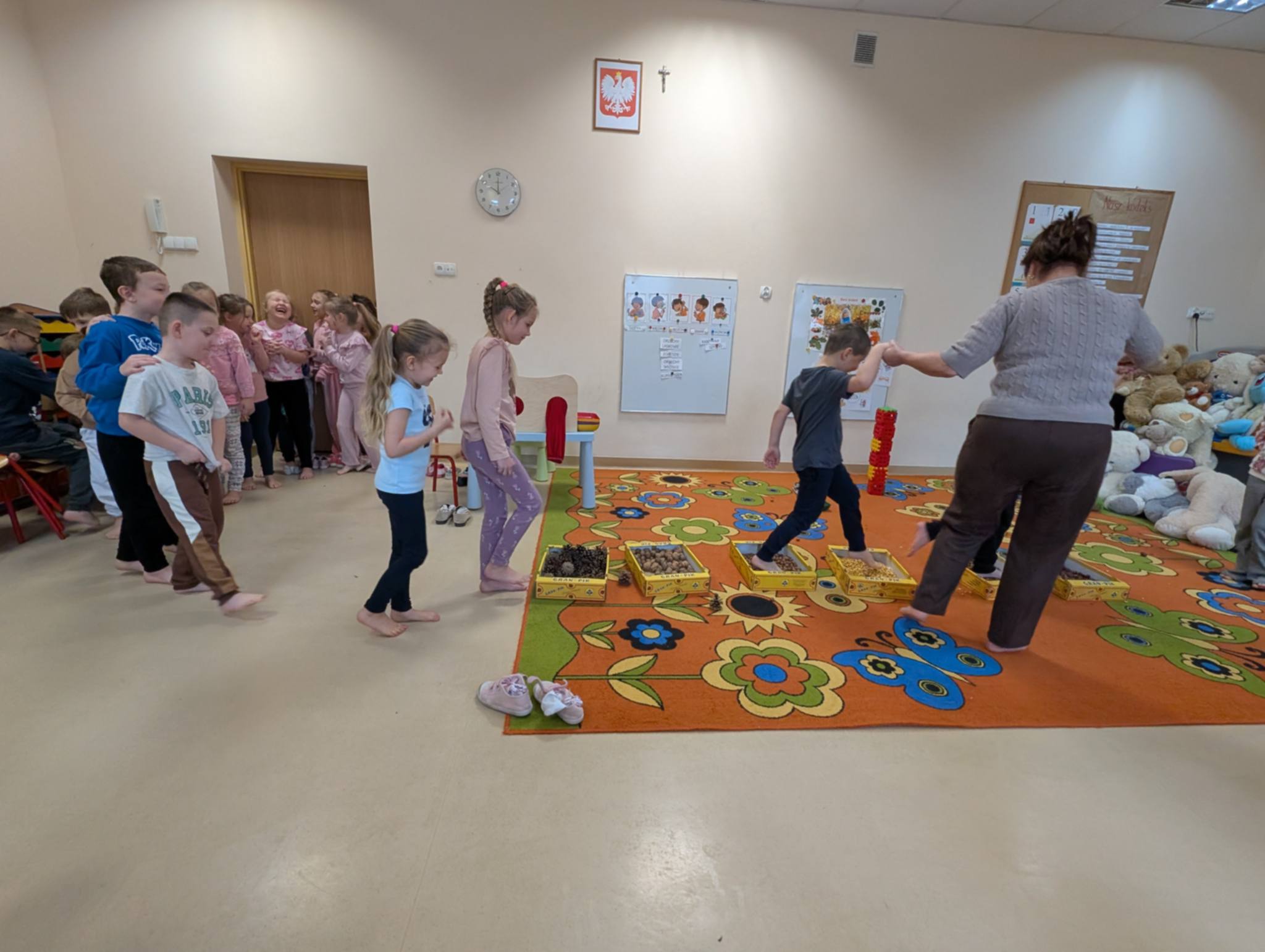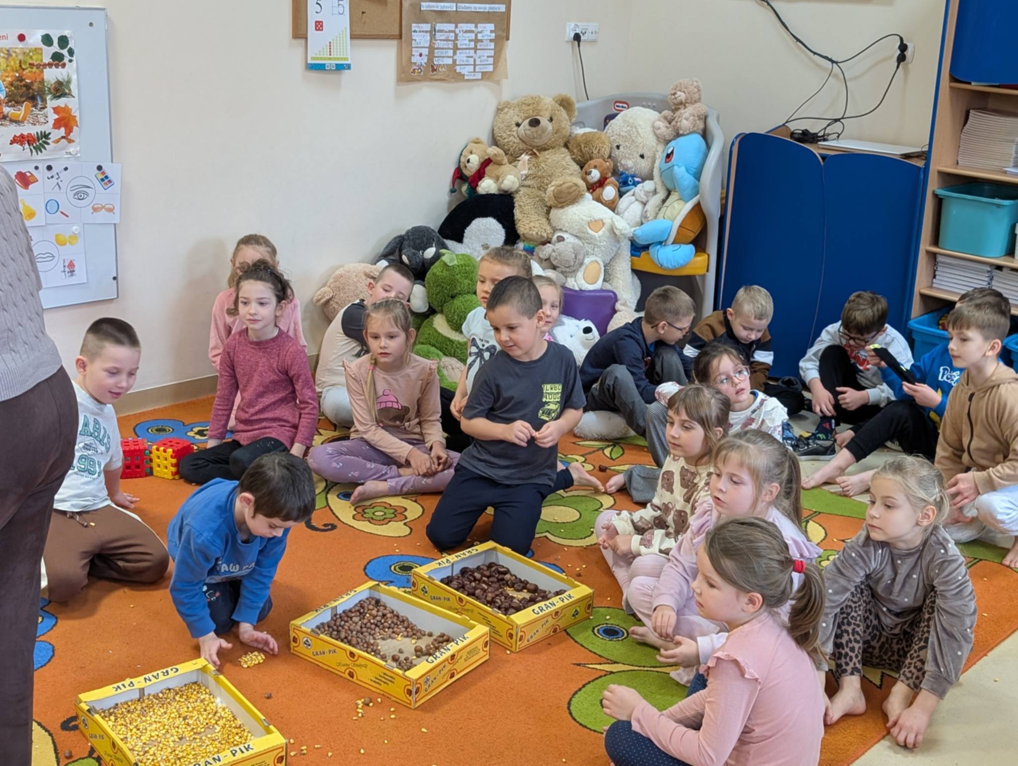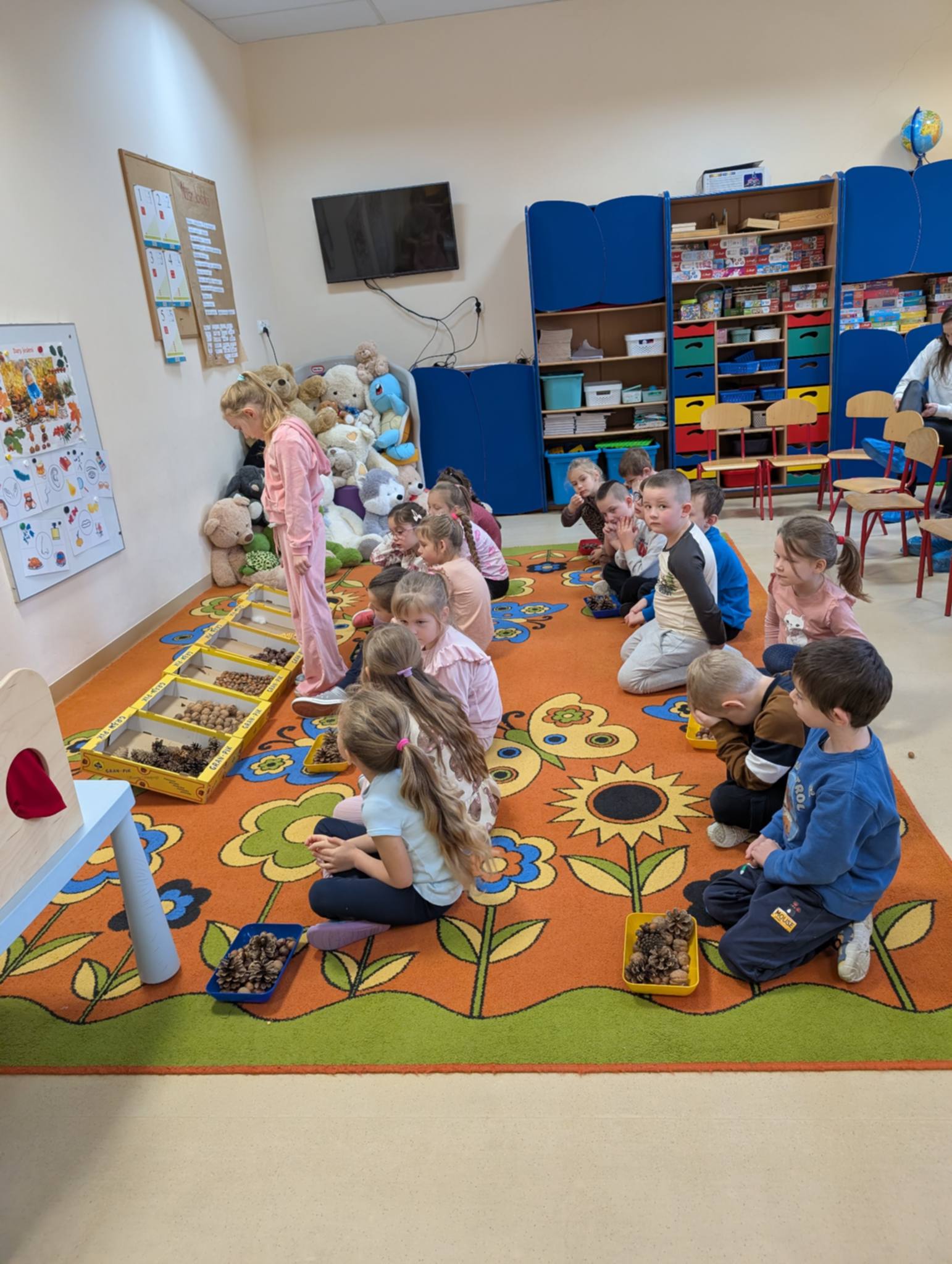 25 listopada br. odbyły się zajęcia otwarte dla Rodziców na temat ,, Jesienne dary”. Dzieci doskonaliły technikę liczenia do 10 oraz wskazywania liczebników głównych i porządkowych. Dzieliły na sylaby i głoski nazwy znajdujących się w pudełkach darów jesieni oraz dopasowywały wyrazy do poszczególnych zbiorów. Za pomocą zmysłu dotyku rozpoznawały kasztany, żołędzie, szyszki, orzechy włoskie i laskowe oraz kukurydzę. Dzielnie przeszły sensoryczną ścieżkę. Nie straszne im było nawet wejście na twarde szyszki. Na koniec zajęć dzieci wzięły udział w zabawie muzycznej z kasztanami.