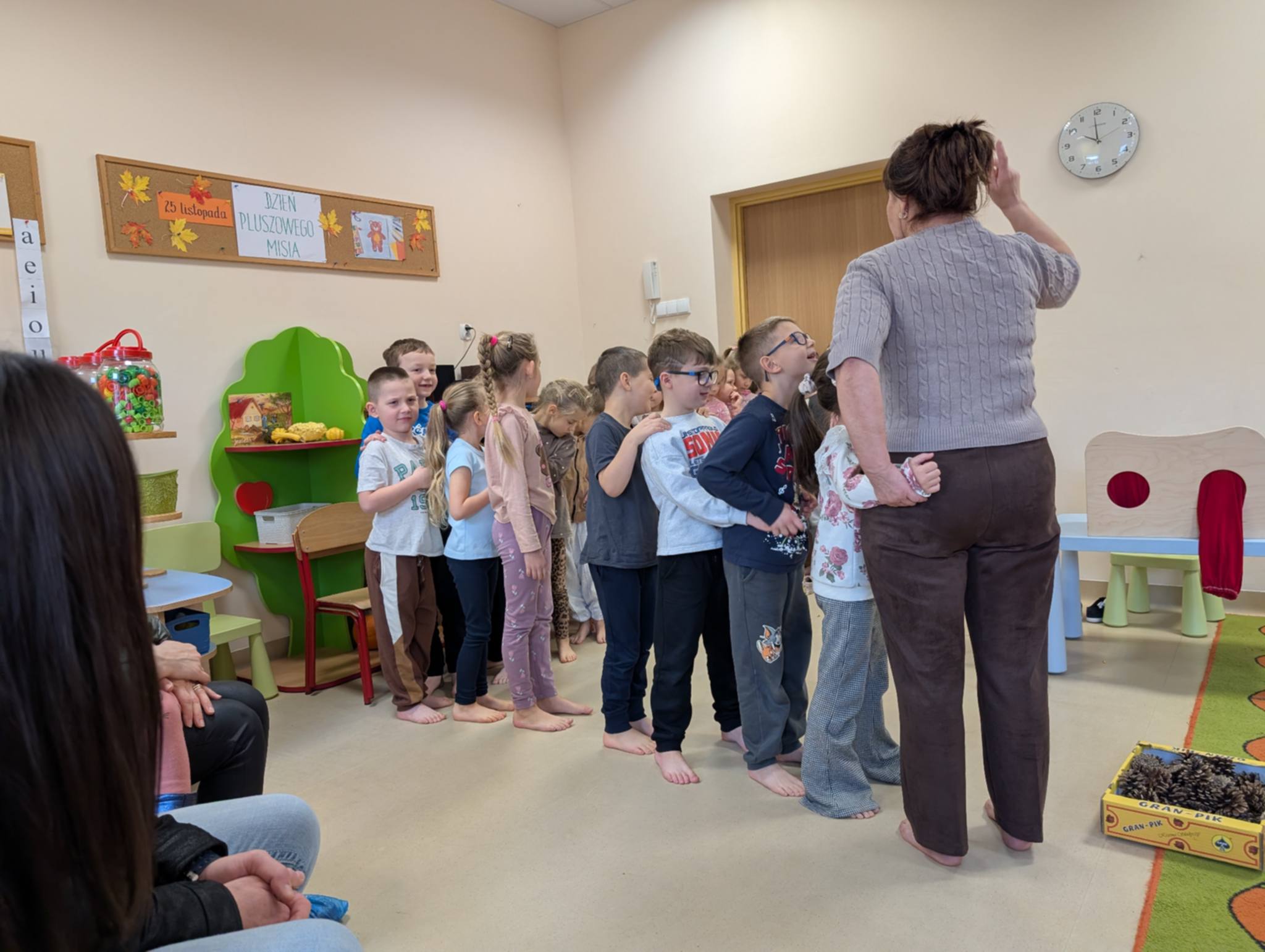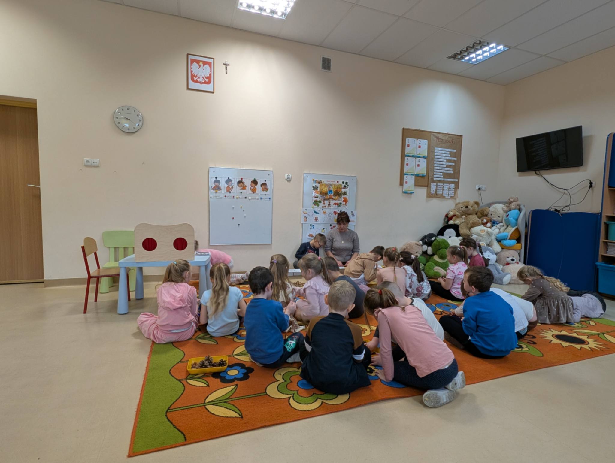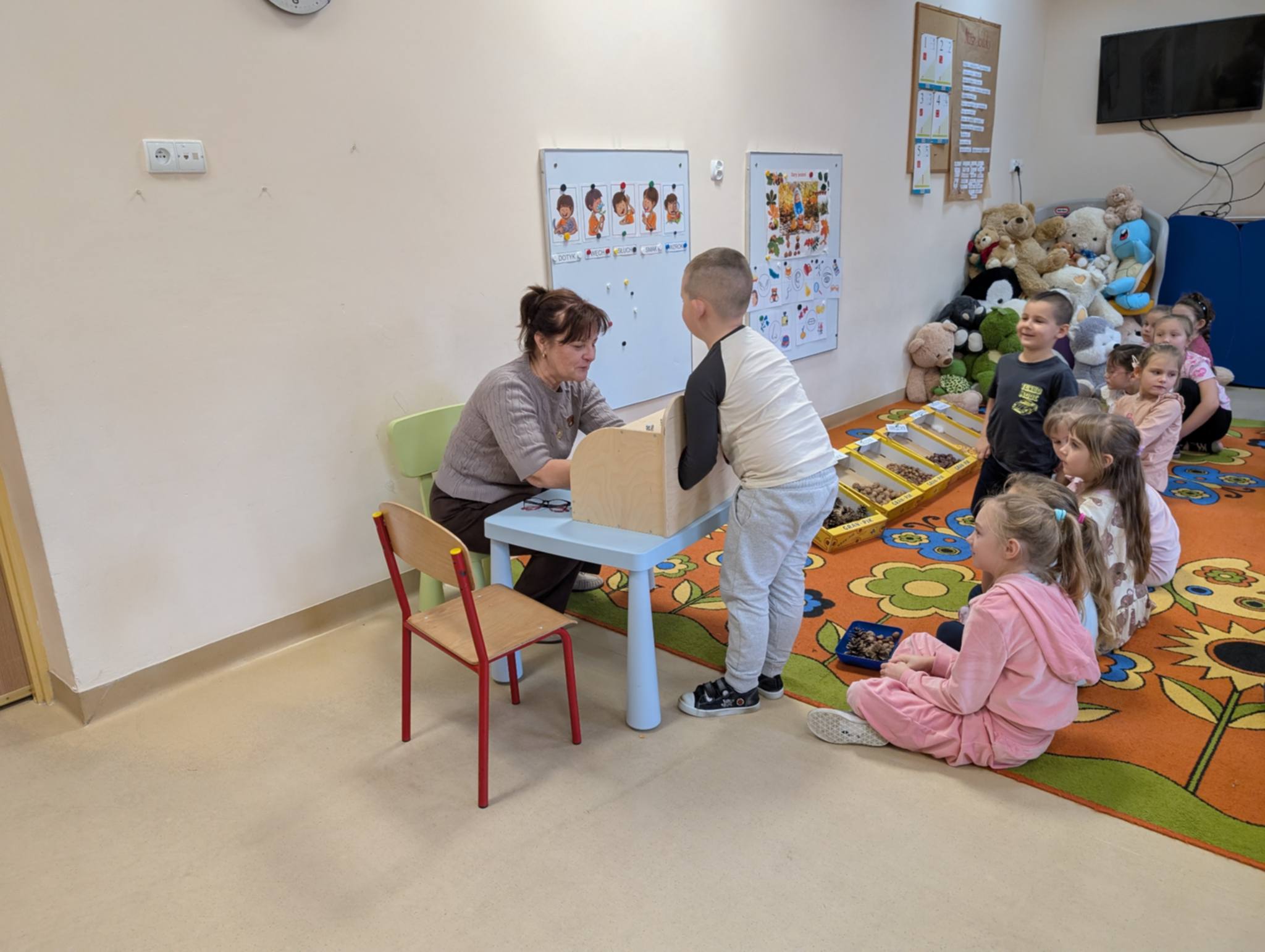 25 listopada br. odbyły się zajęcia otwarte dla Rodziców na temat ,, Jesienne dary”. Dzieci doskonaliły technikę liczenia do 10 oraz wskazywania liczebników głównych i porządkowych. Dzieliły na sylaby i głoski nazwy znajdujących się w pudełkach darów jesieni oraz dopasowywały wyrazy do poszczególnych zbiorów. Za pomocą zmysłu dotyku rozpoznawały kasztany, żołędzie, szyszki, orzechy włoskie i laskowe oraz kukurydzę. Dzielnie przeszły sensoryczną ścieżkę. Nie straszne im było nawet wejście na twarde szyszki. Na koniec zajęć dzieci wzięły udział w zabawie muzycznej z kasztanami.