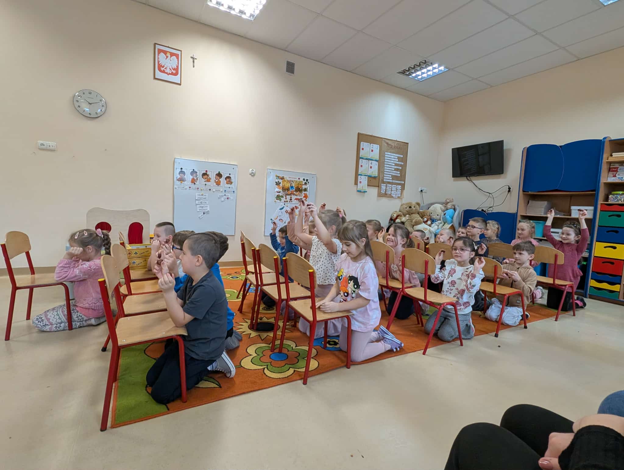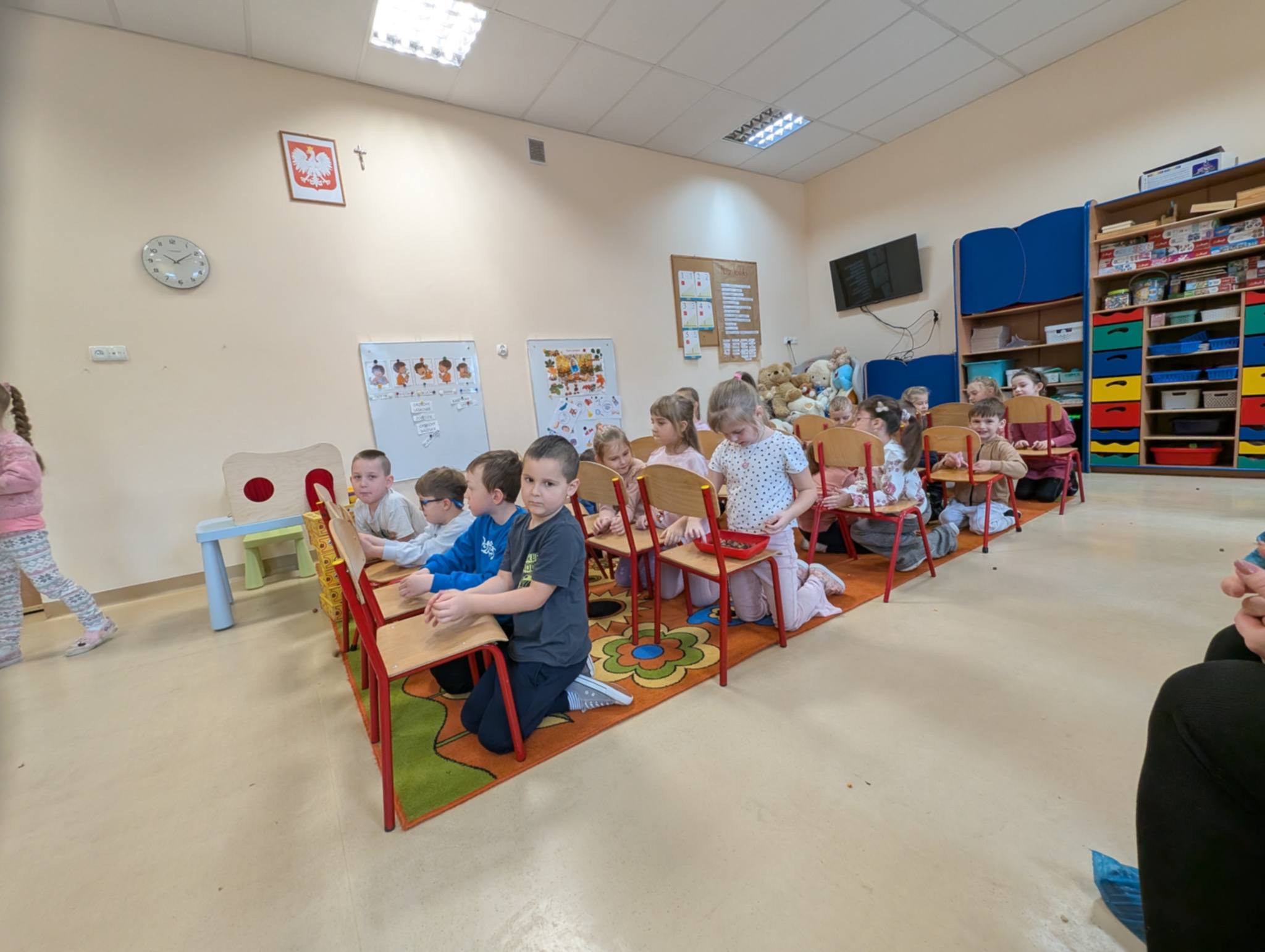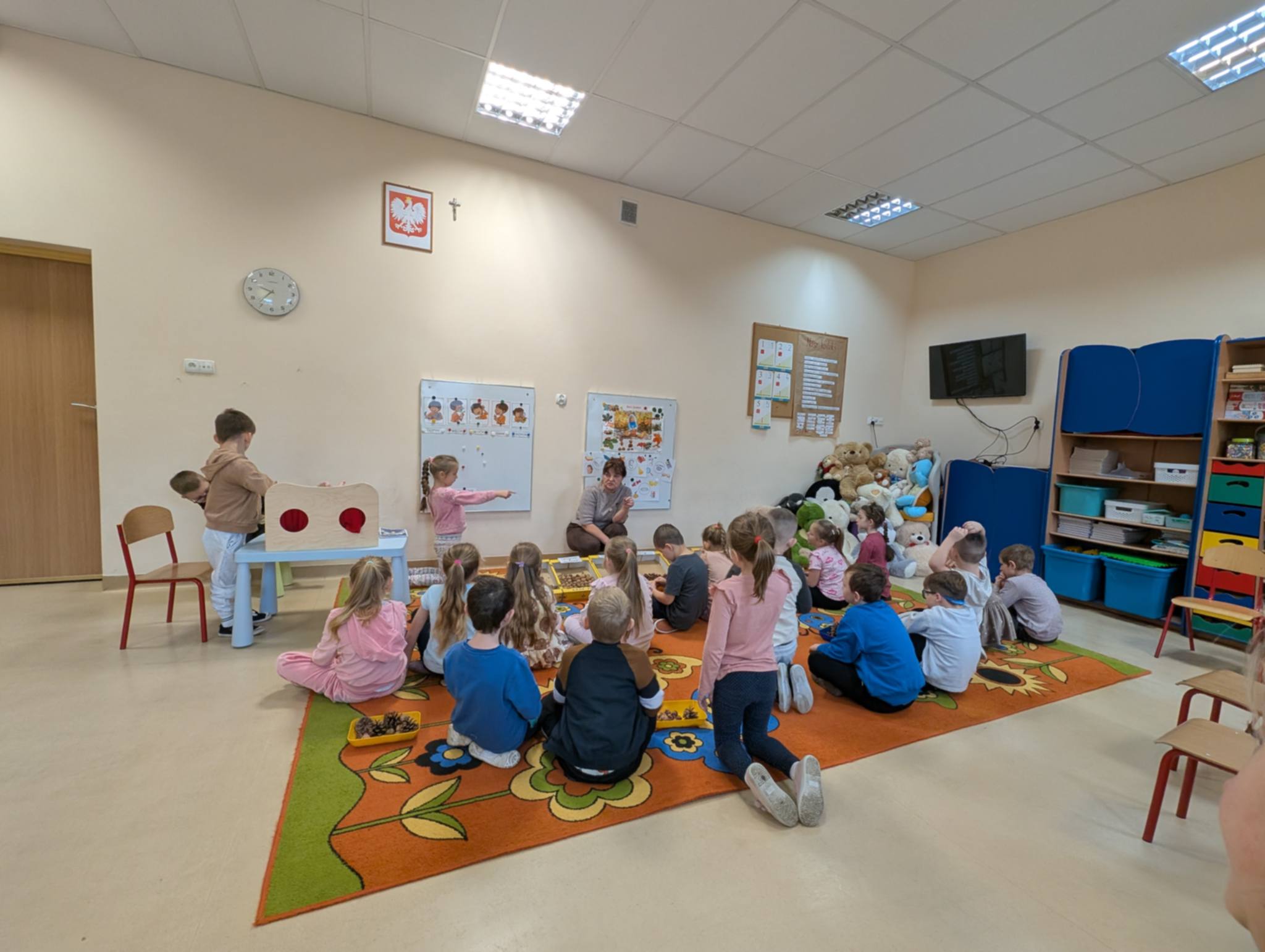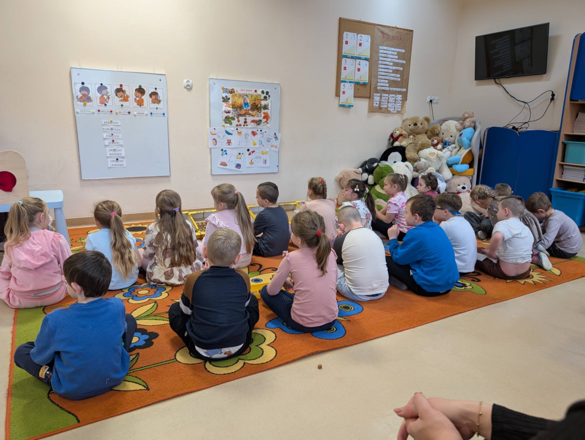25 listopada br. odbyły się zajęcia otwarte dla Rodziców na temat ,, Jesienne dary”. Dzieci doskonaliły technikę liczenia do 10 oraz wskazywania liczebników głównych i porządkowych. Dzieliły na sylaby i głoski nazwy znajdujących się w pudełkach darów jesieni oraz dopasowywały wyrazy do poszczególnych zbiorów. Za pomocą zmysłu dotyku rozpoznawały kasztany, żołędzie, szyszki, orzechy włoskie i laskowe oraz kukurydzę. Dzielnie przeszły sensoryczną ścieżkę. Nie straszne im było nawet wejście na twarde szyszki. Na koniec zajęć dzieci wzięły udział w zabawie muzycznej z kasztanami.